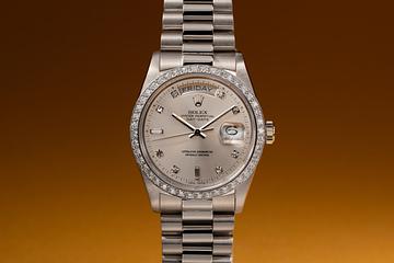 1984 Rolex 18K WG Diamond Bezel Day-Date 18049 Silver Diamond Dial