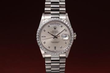 1989 Rolex 18K White Gold Day-Date 18349 Silver Diamond Dial