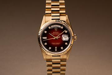 1991 Rolex 18K YG Day-Date 18238 Oxblood Vignette Diamond Dial Serviced at Rolex in Geneva