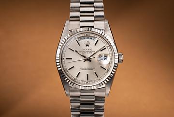 1989 Rolex 18K WG Day-Date 18239 Silver Dial with Papers