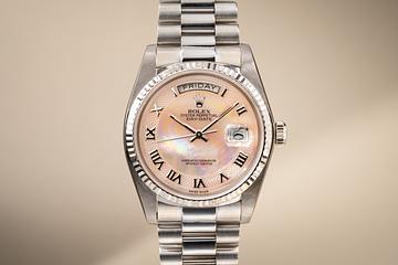 1982 Rolex 18K WG Day-Date 18039 Pink Mother of Pearl Roman Numeral Dial