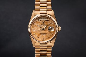1988 Rolex 18K YG Day-Date 18038 Birch Burlwood Dial with Box and Papers