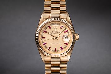 1986 Rolex 18K YG Day-Date 18038 with Satin Champagne Ruby String Dial