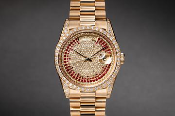 1996 Rolex 18K YG Diamond Encrusted Day-Date 18388 Diamond and Ruby Pave Dial with Box and Papers