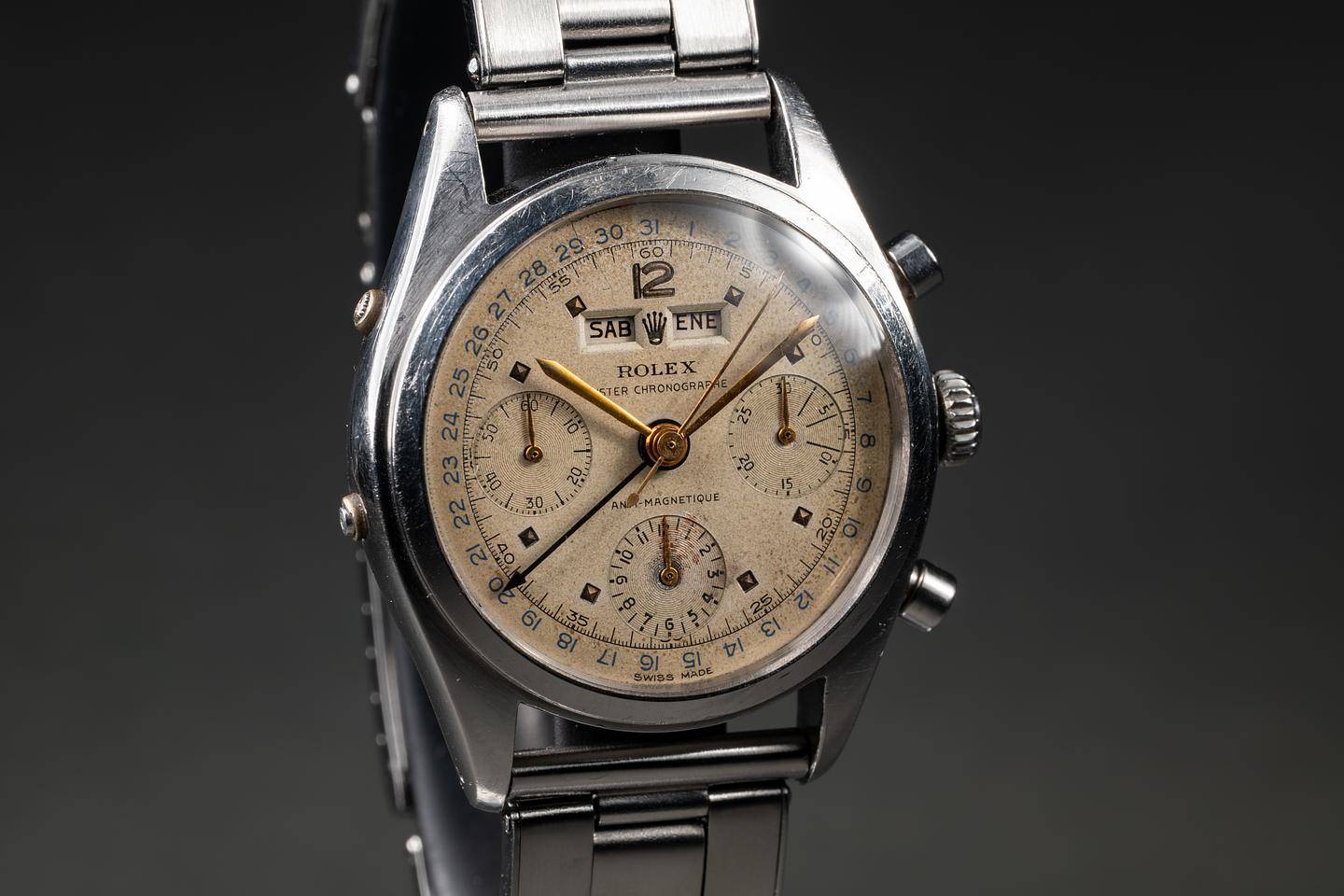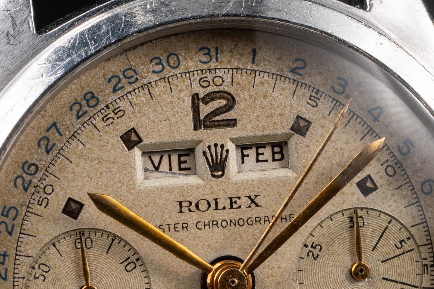 Dial: The dial is very good, showing average wear for its age. There is a small crack in the dial between the 11 and 12 o'clock markers that runs from the edge of the dial to the day window. The VIE "Friday" portion of the day disc has a scratch, which is shown in the photos. The hands are in excellent condition, showing only light wear from use