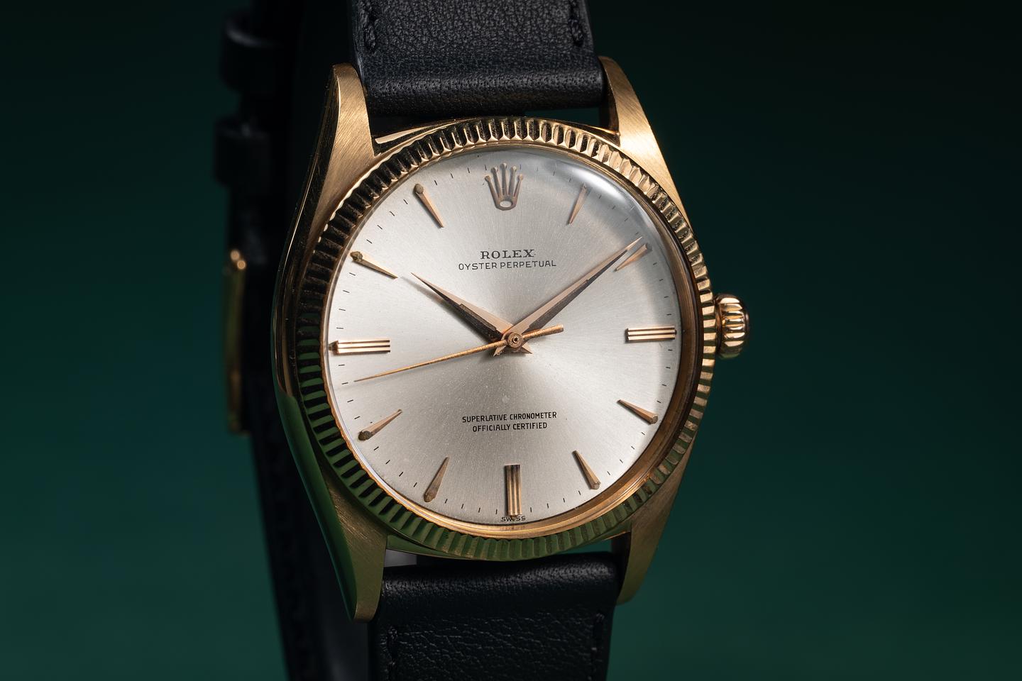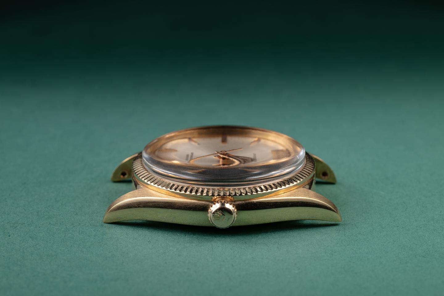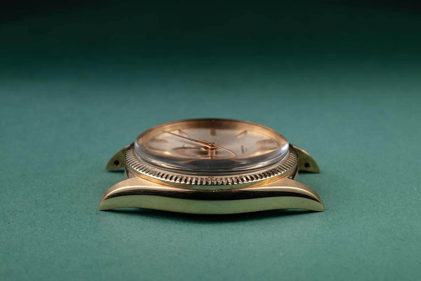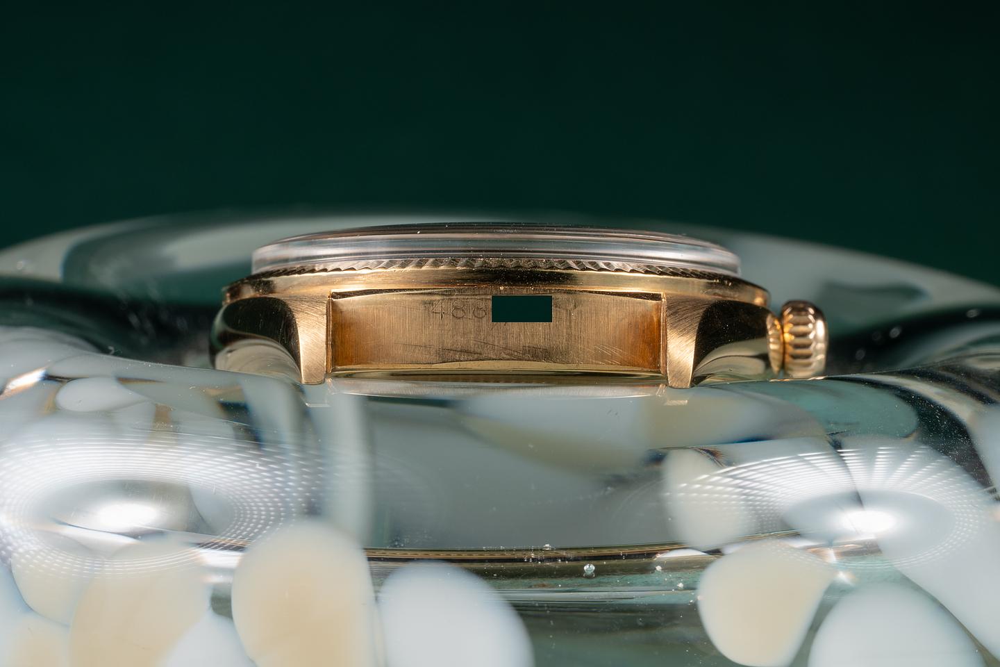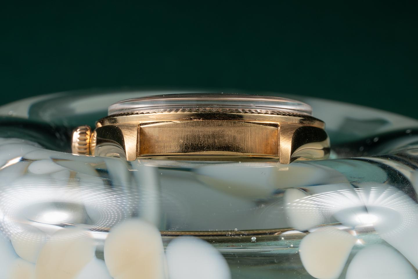 Case: The thick, sharp, and even 18K yellow gold uncommon 36mm case is excellent, showing only very light wear. The 18K yellow gold fluted bezel is also in excellent condition, showing only very light wear.