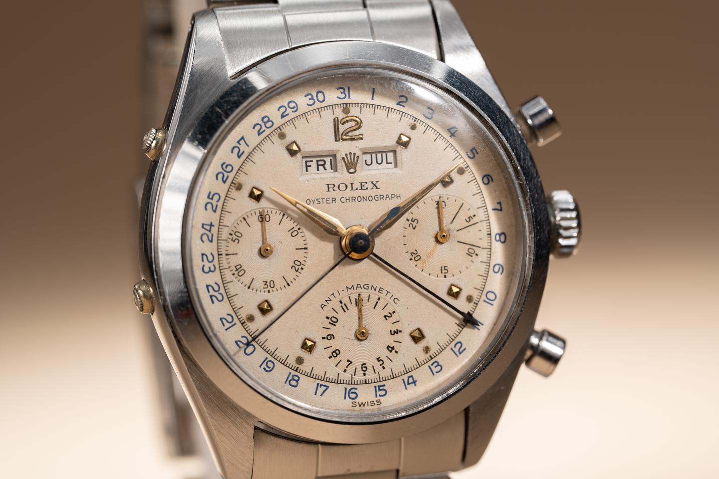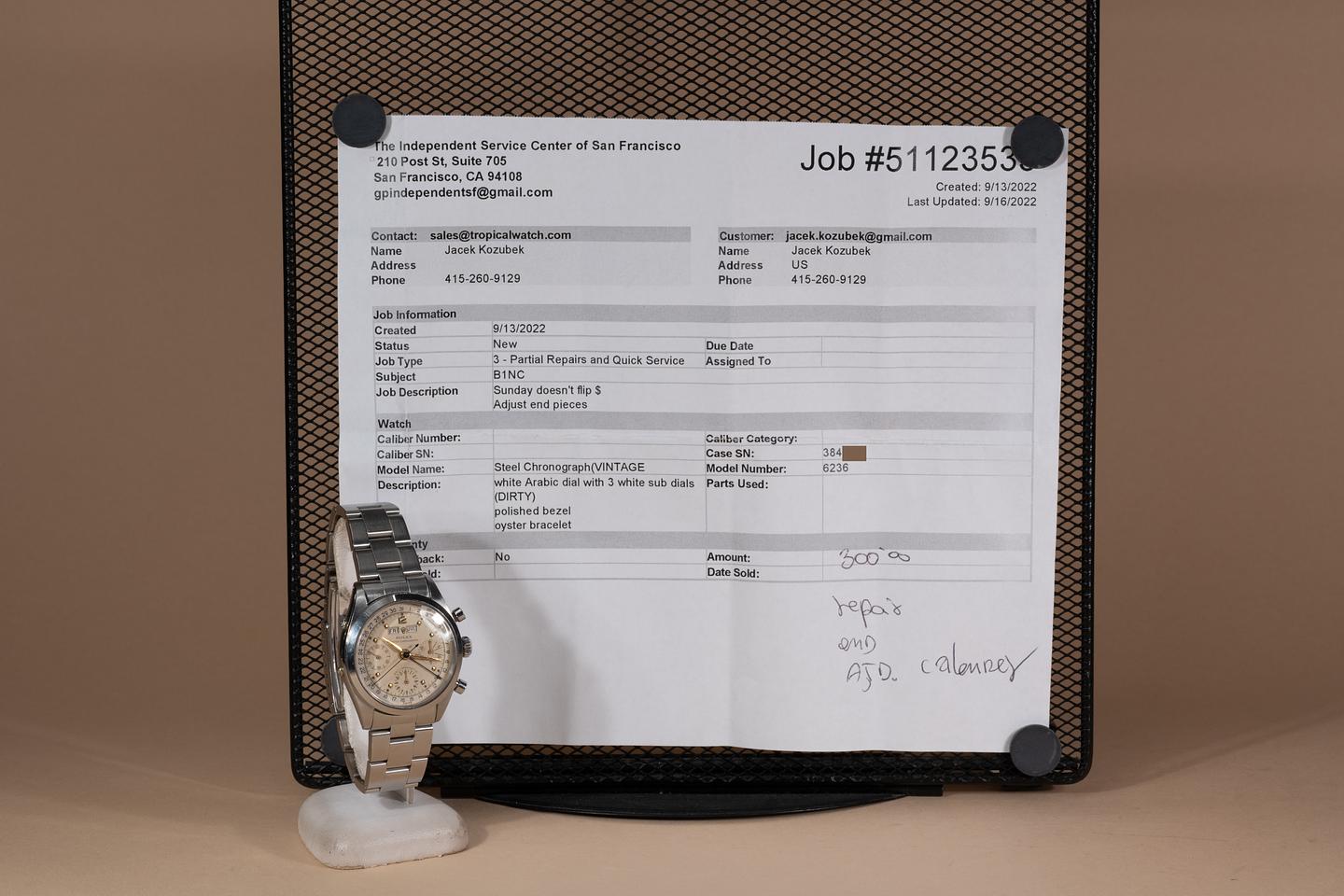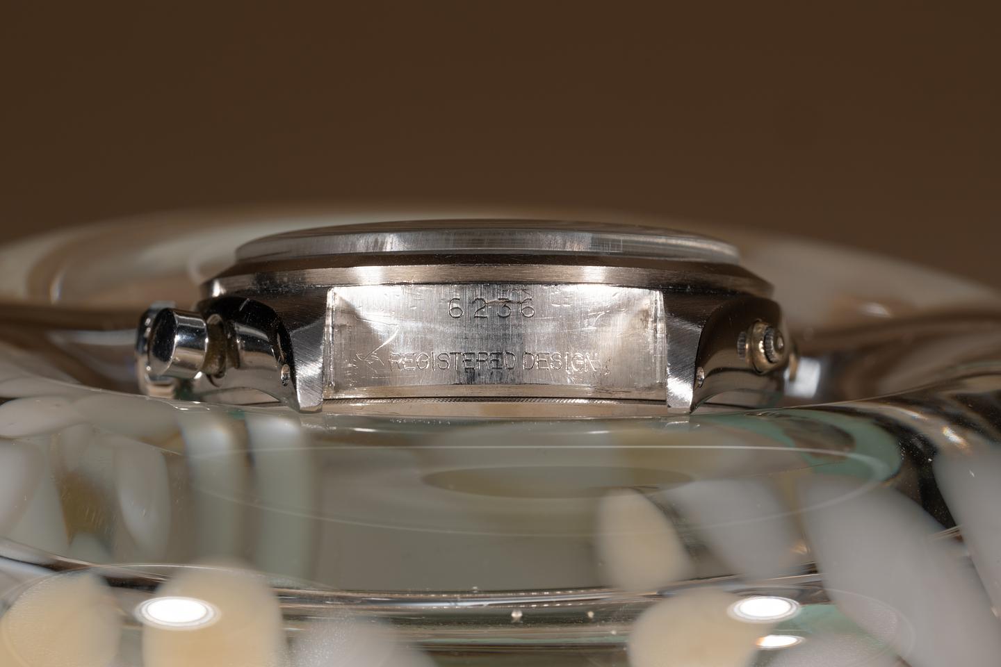 Dial: The pearlescent white dial is excellent showing some light wear for its age. The lume plots have mostly disintegrated from age and the remaining lume has aged to a dark sage hue. The gold dauphine hands are also missing a portion of their lume with the remaining lume matching that on the dial.