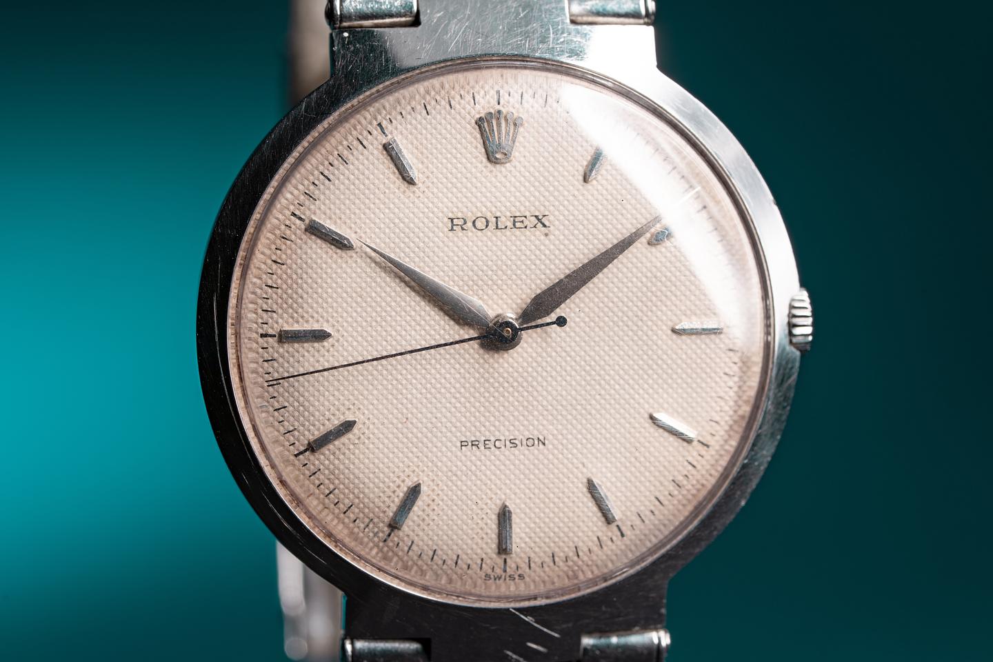 Dial: The silvery white waffle dial is excellent showing only very light wear for its age. The no lume dauphine hands are matching.
