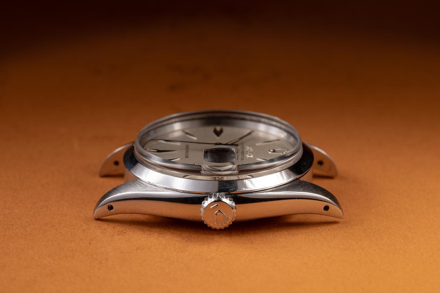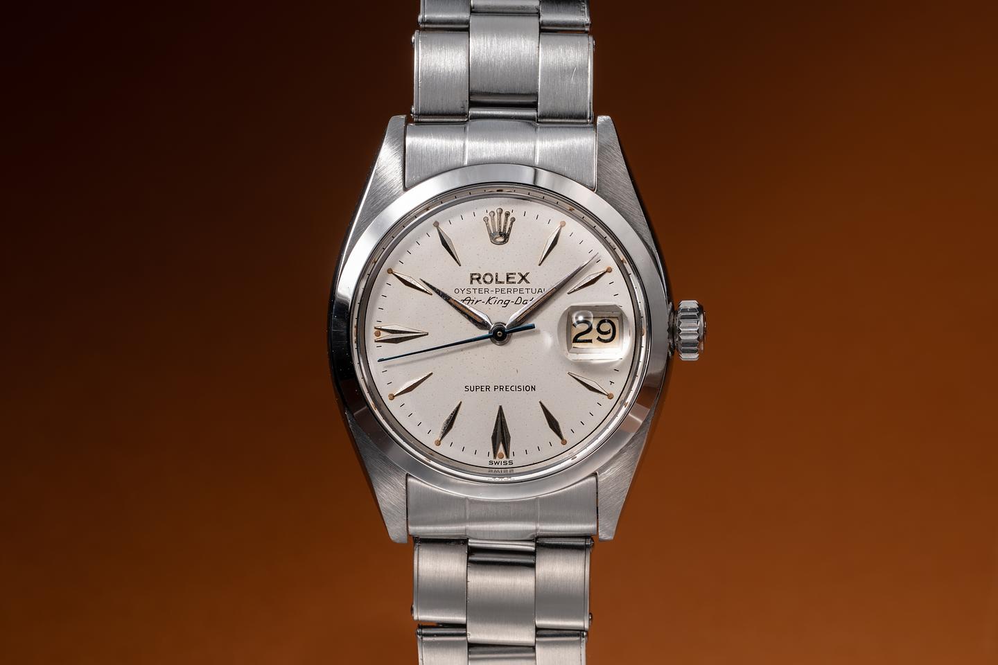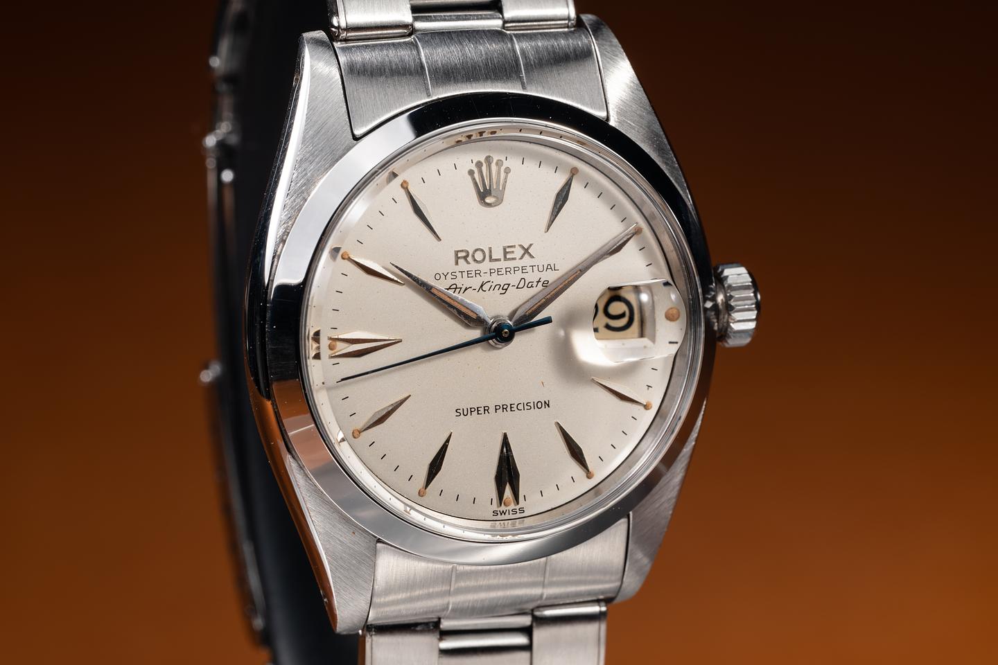 Dial: The rare Air King Date silver dial is excellent, showing a subtle speckling patina and only very light wear for its age. The lume has aged to a warm, vibrant, creamy hue, and the dauphine hands match perfectly.