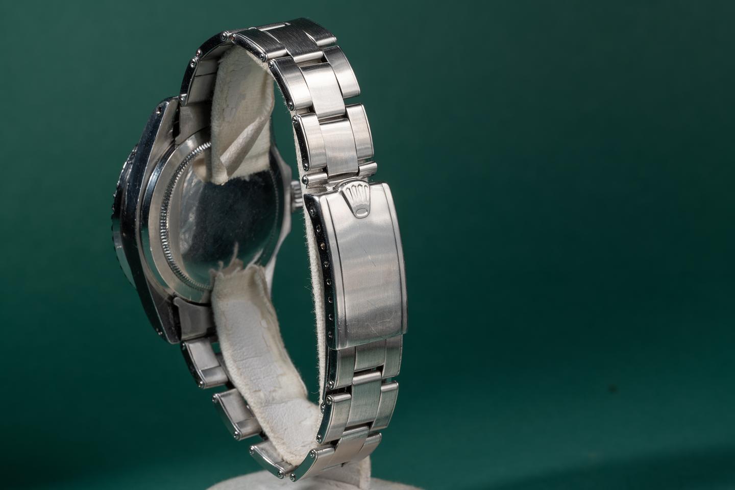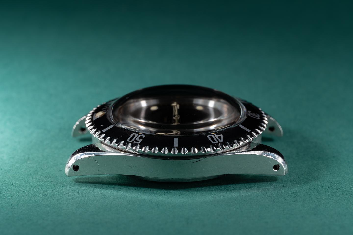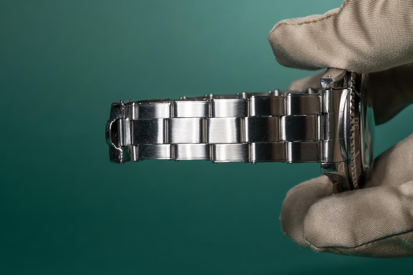 Case: The thick and even case is excellent showing wide prominent factory bevels and average wear from use. The watch has a bright sleeve polished finish. The fat font bezel insert is also in excellent condition showing a very subtle fade to the inner portion of the insert.