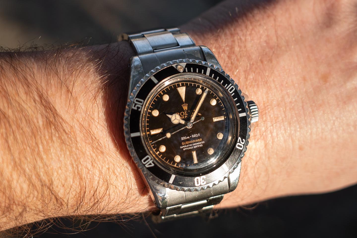 Case: The pointed crownguard case is excellent, showing prominent bevels and some light wear from use. The bezel is excellent and has aged with a satin black finish, showing only light wear from use.