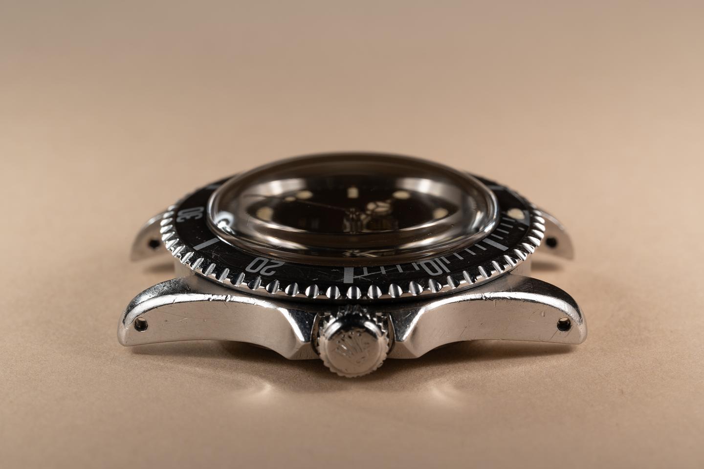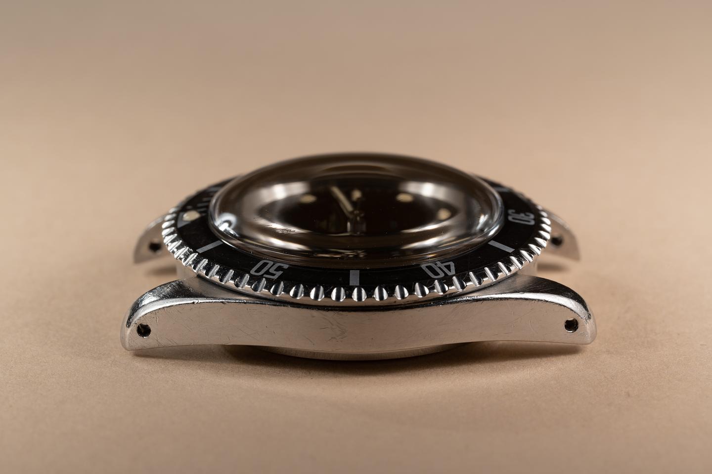 Case: The previously polished pointed crown guard case is excellent showing prominent levels and average wear from use. The black bezel has faded to a medium charcoal grey and shows light wear from use.