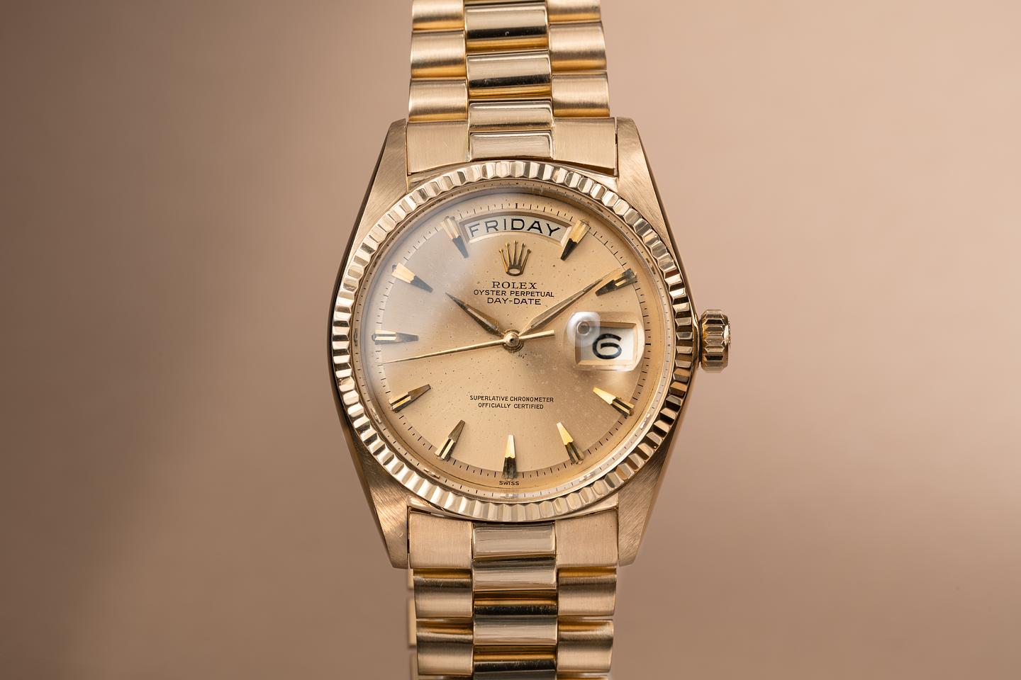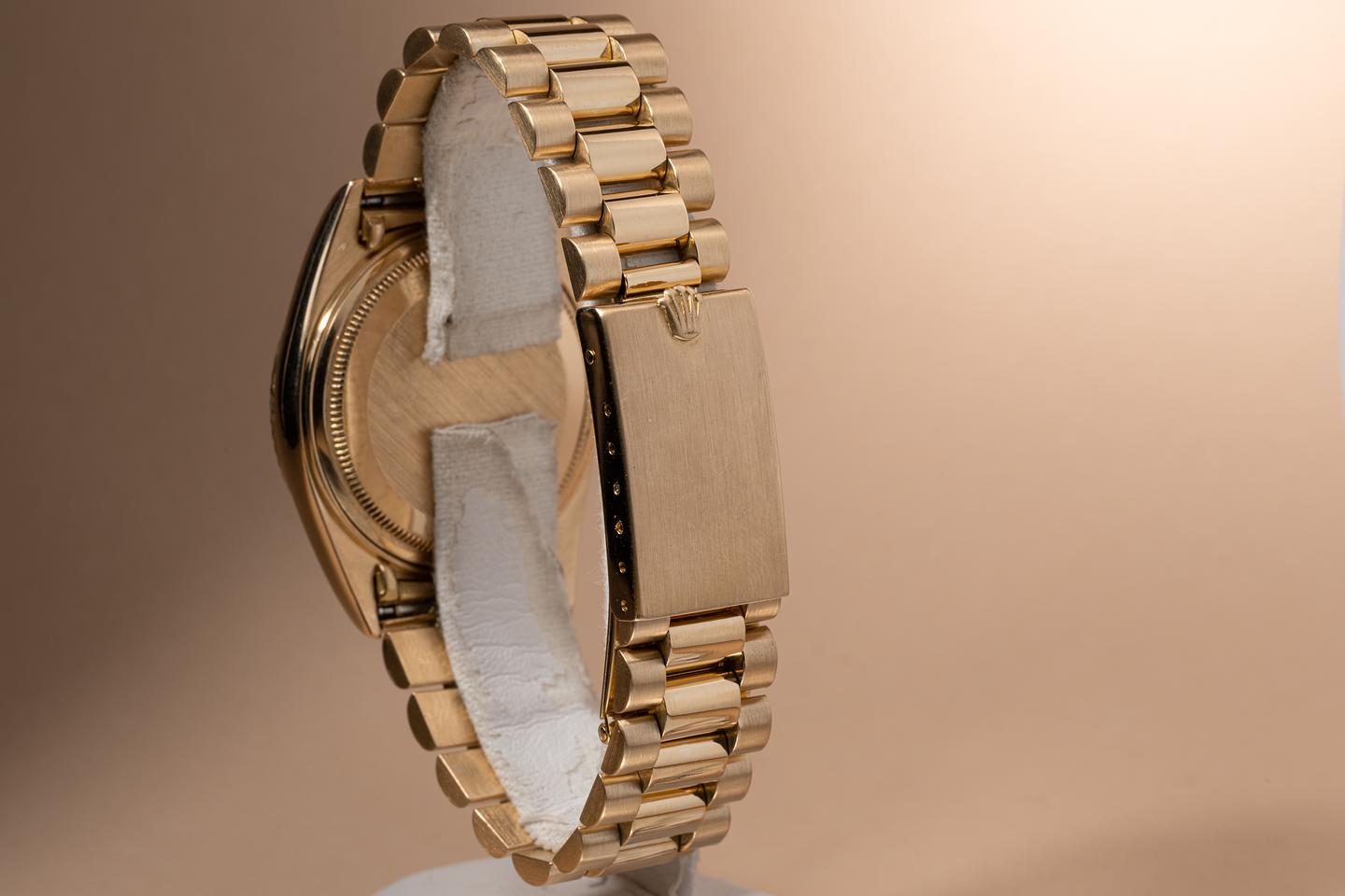 Bracelet: The 19 link 18k yellow gold president is excellent showing some light stretch for its age. The 18k yellow gold clasp is stamped with a "Made in Japan" hallmark and is also in excellent condition.