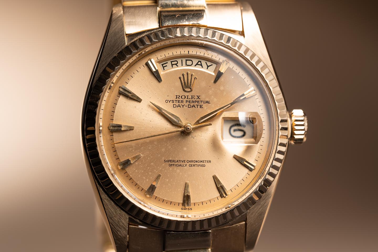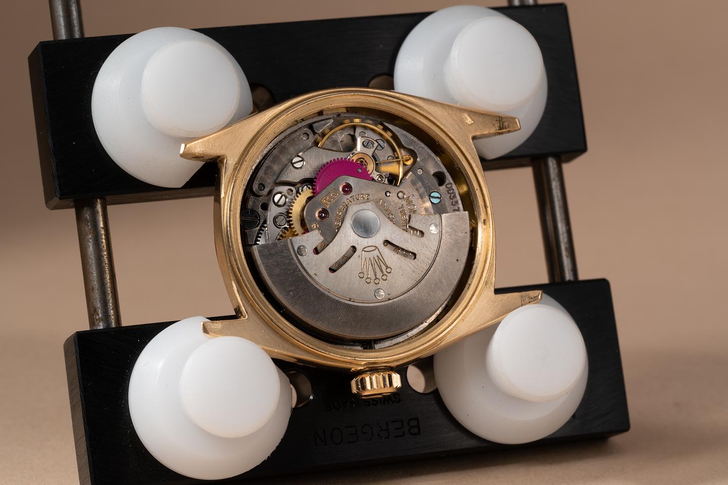 Dial: The champagne dial is excellent showing an extensive and even pattern of speckling patina across its surface. There is a small and subtle patch of slightly denser patina just below and to the right of the centerpost. Most of the lume plots age missing some or all of their luminous mass which is not uncommon for a watch of this age. The remaining lume has aged to a creamy hue and the hands match perfectly. All lume glows brightly when exposed to UV and falls off rapidly at the same rate.