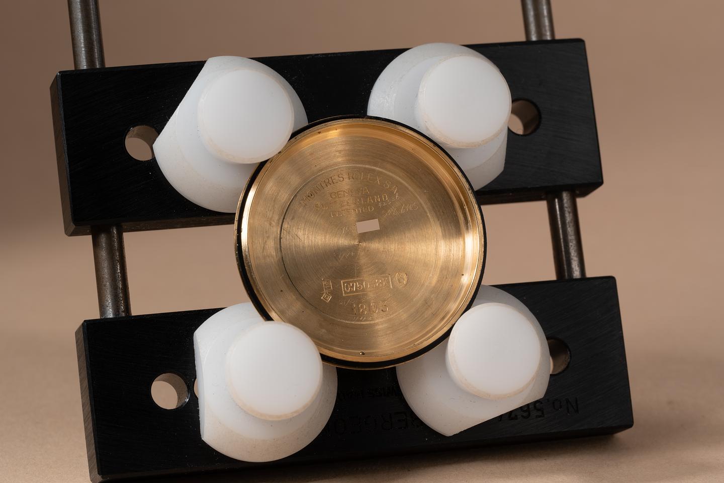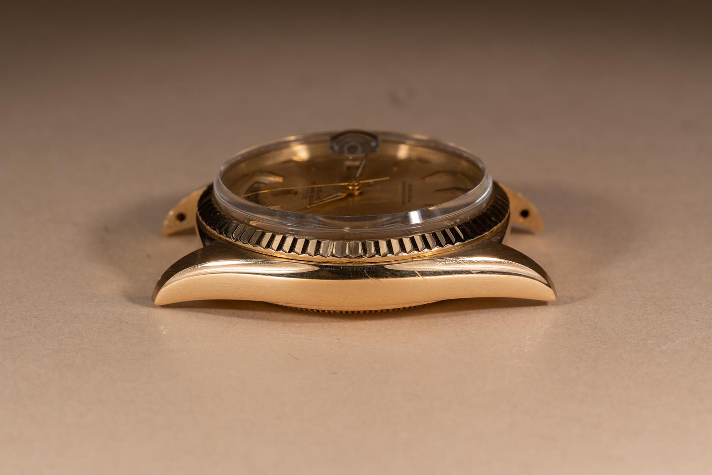 Case: The previously polished 18k yellow gold case is excellent showing only very light wear from use. The sharp 18k yellow gold fluted bezel is also in excellent condition showing only light wear from use. The case serial numbers look to have been re-engraved at some point due to natural wear from endlink contact. The original serial number on the caseback is matching.