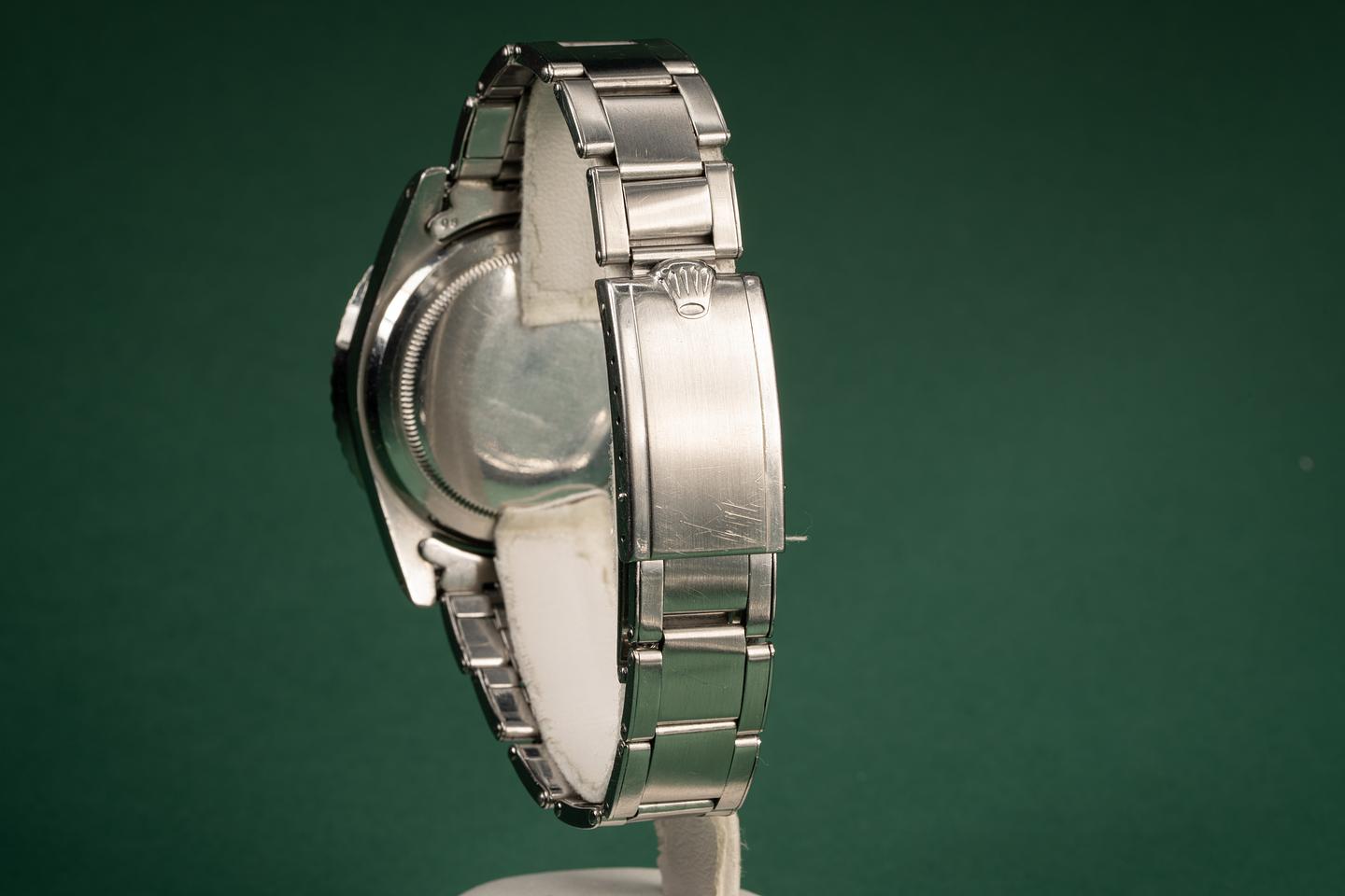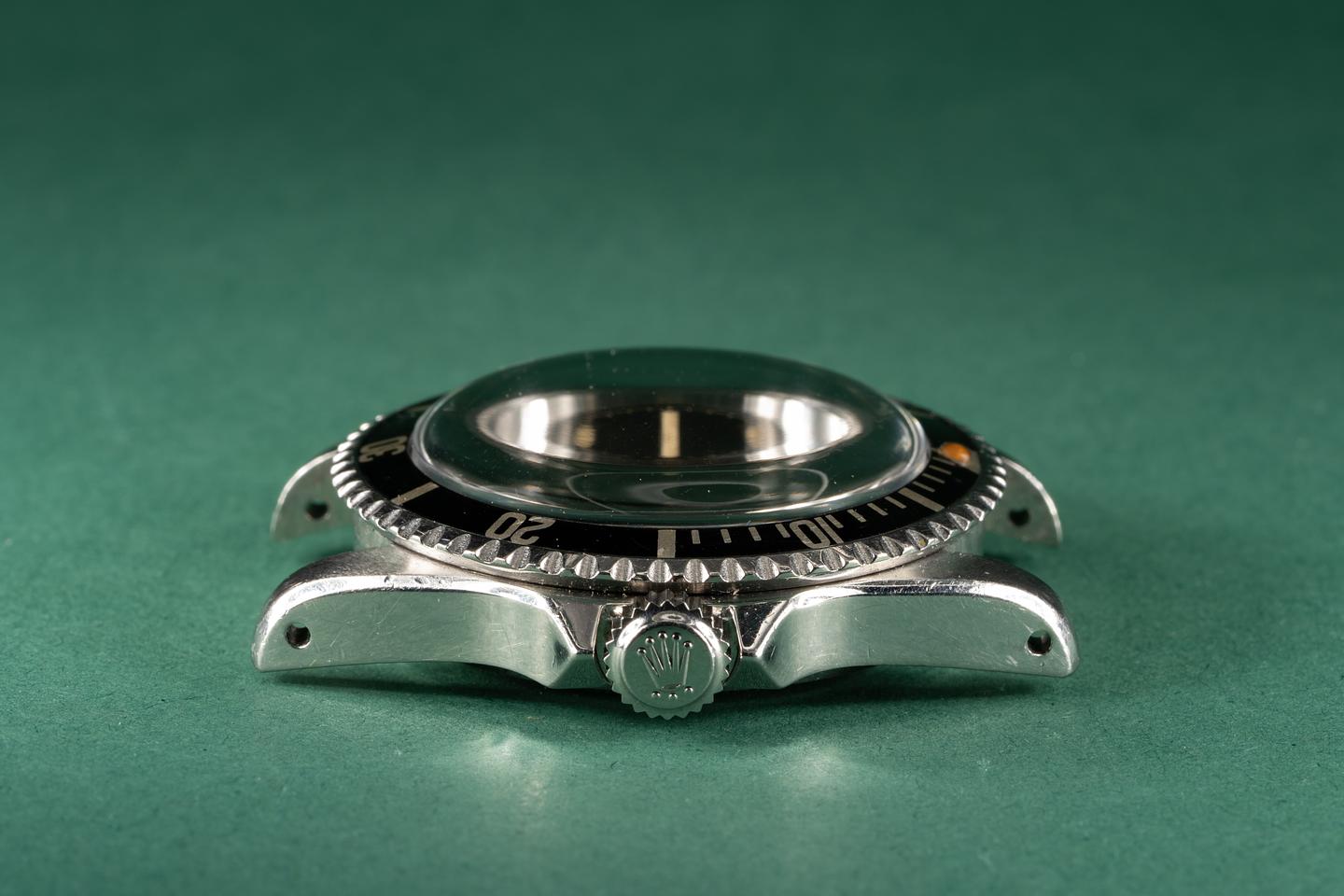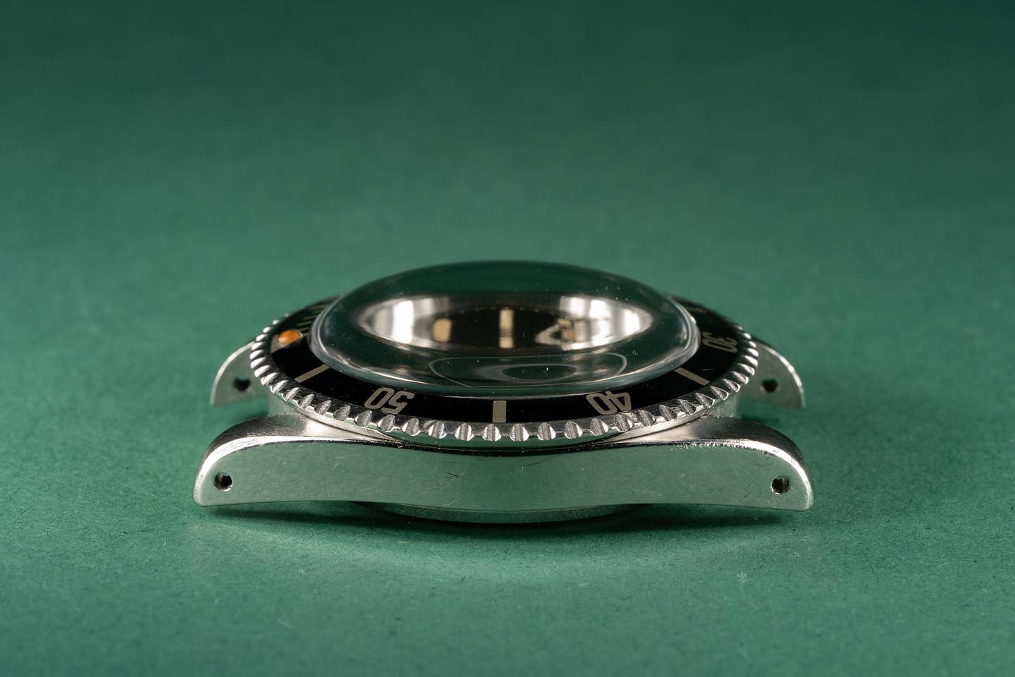 Case: The thick pointed crown guard case appears to have the factory bevels still intact. The watch shows light wear for its age. The super fat long 5 kissing 40 bezel is also in excellent condition and shows very light wear for its age.