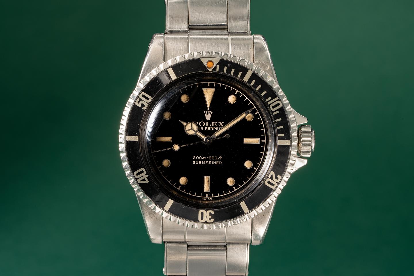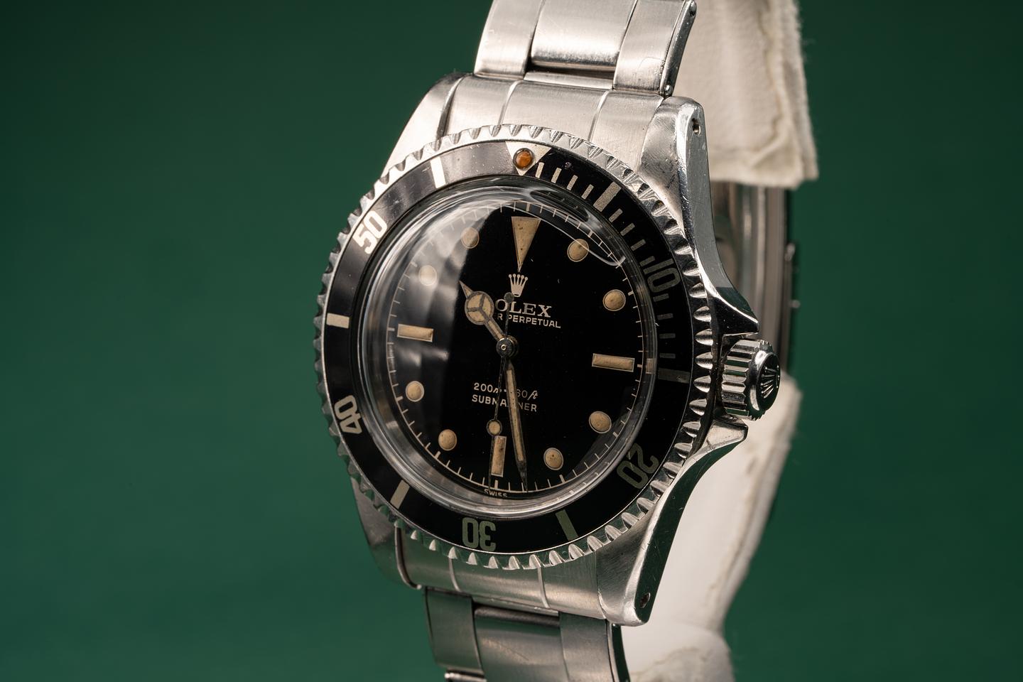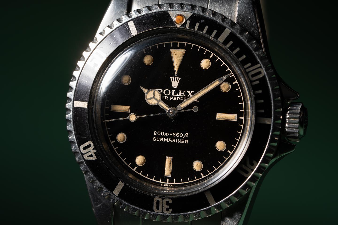 Case: The thick pointed crown guard case appears to have the factory bevels still intact. The watch shows light wear for its age. The super fat long 5 kissing 40 bezel is also in excellent condition and shows very light wear for its age.