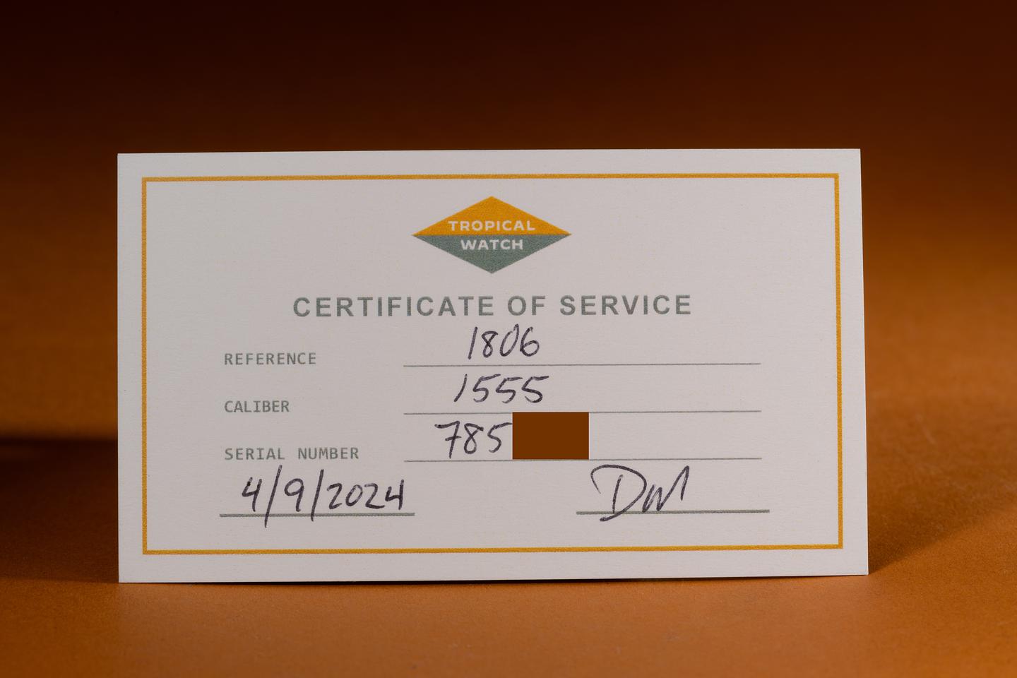 Accessories: April 2024 Certificate of Service from Tropical Watch.