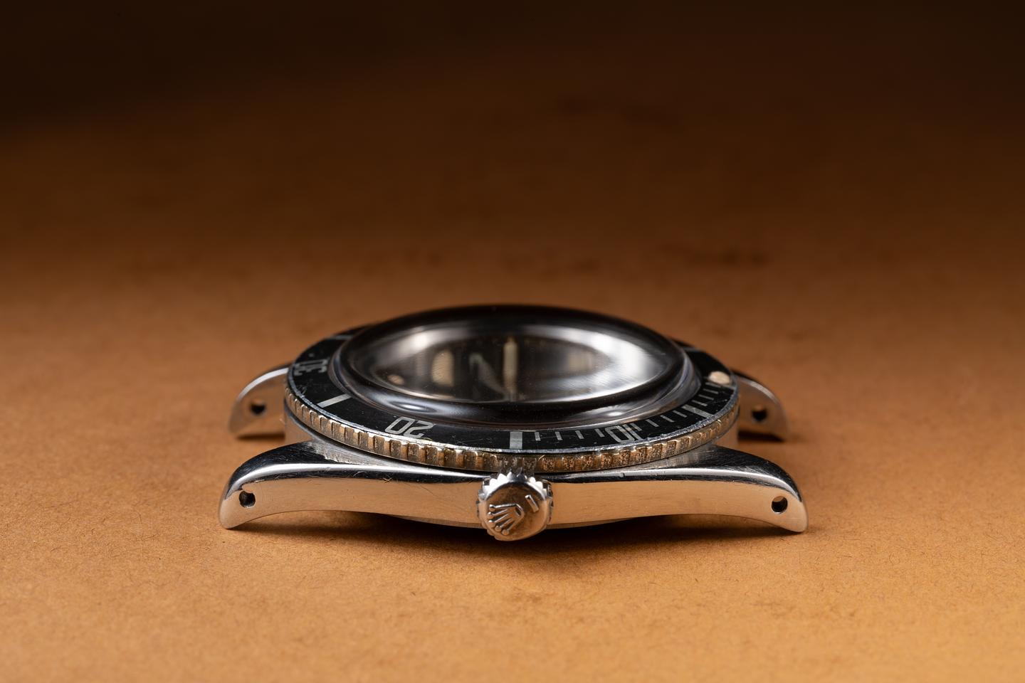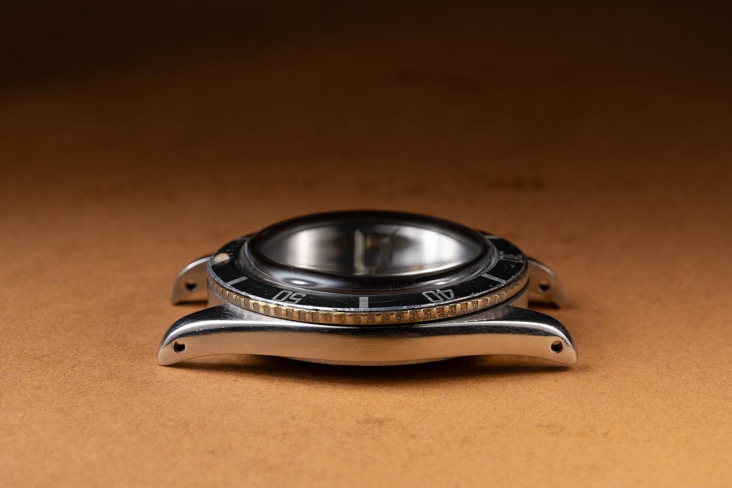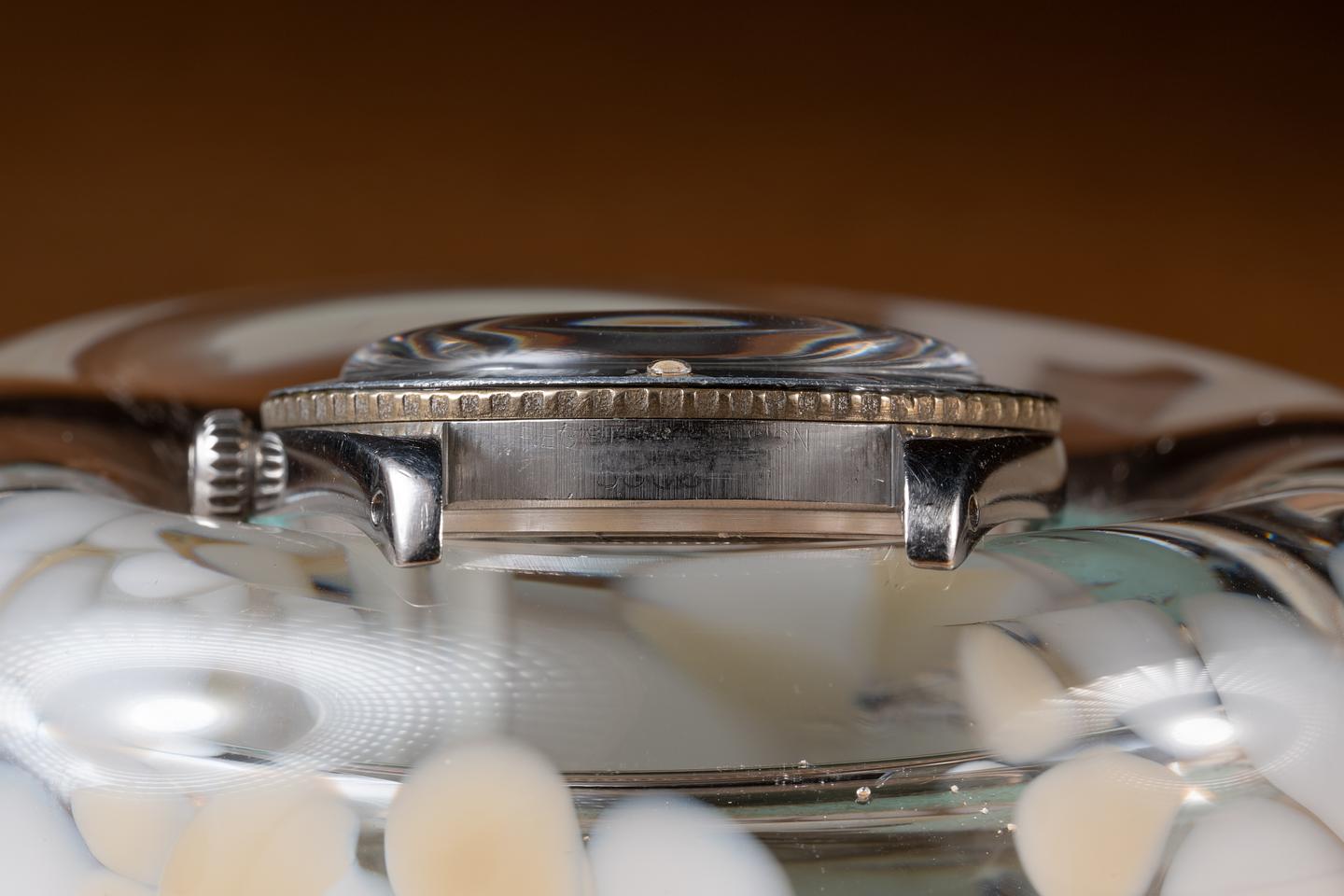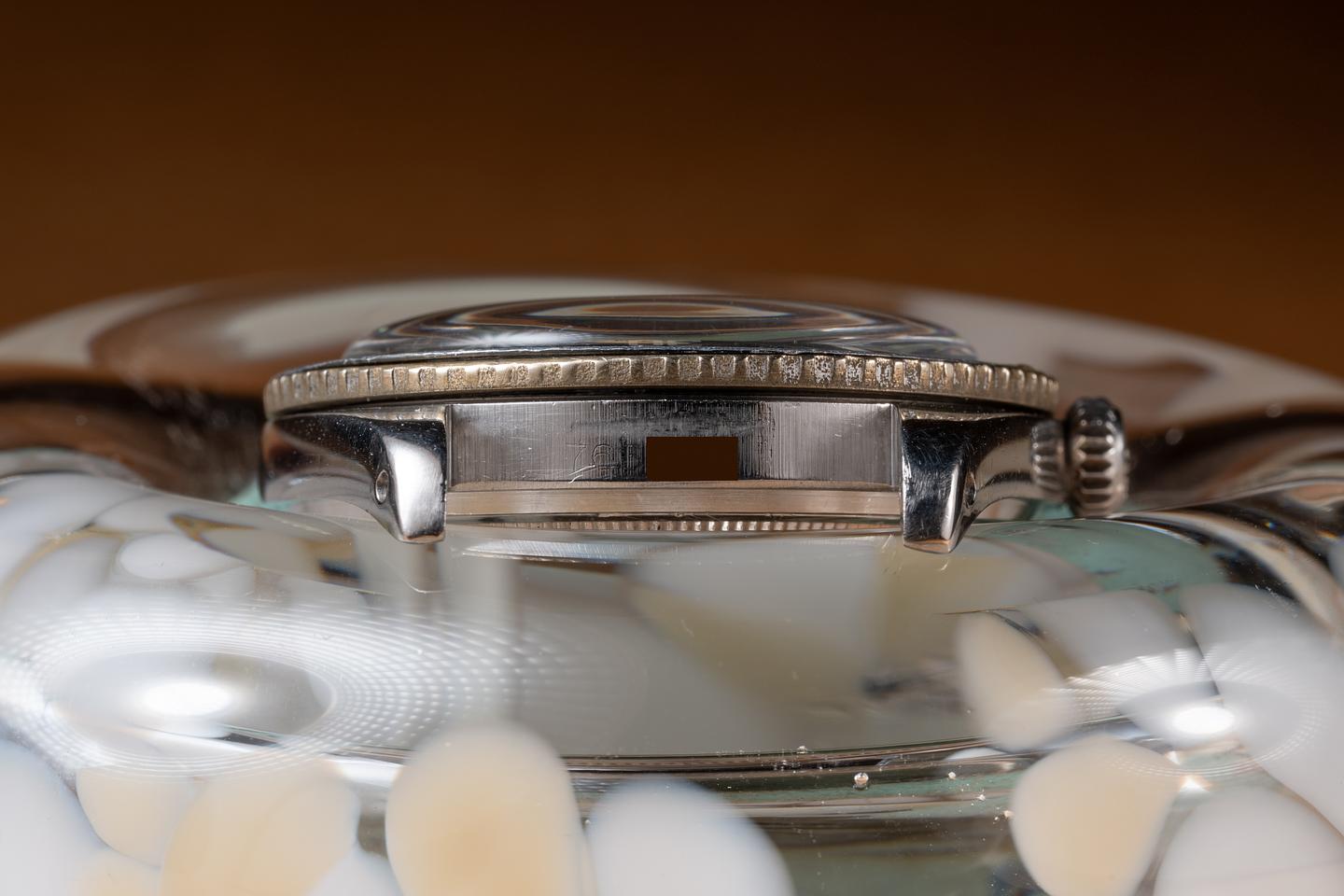 Case: The previously polished case is excellent showing a sleeve polished finish and some light wear from use. The bezel has aged to a silvery grey tone and only light wear from use. The bezel does not rotate and has been glued on.