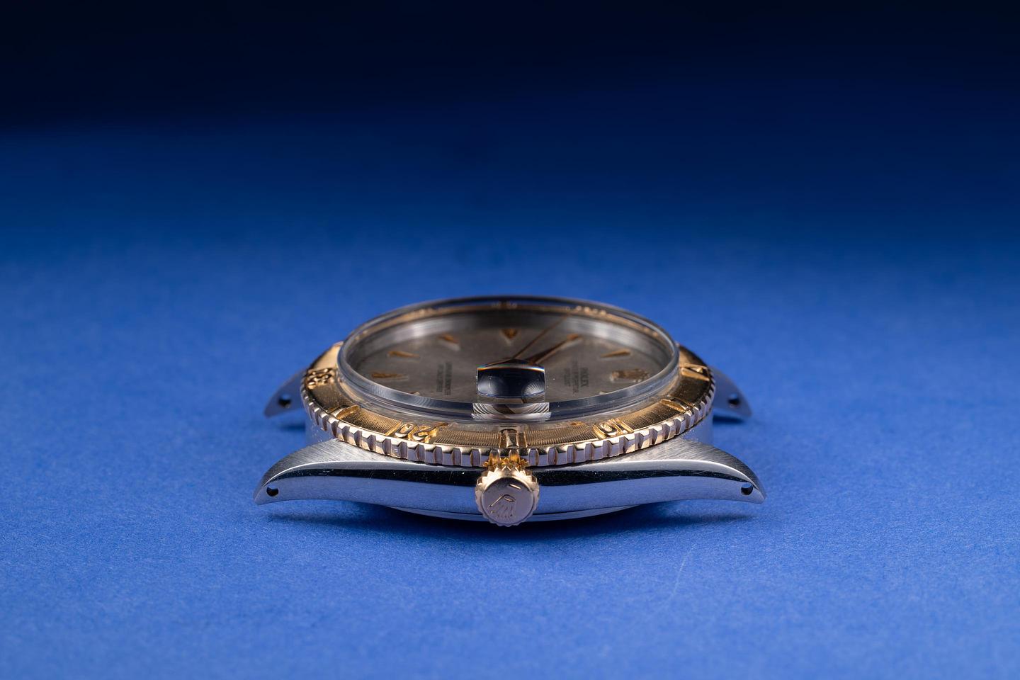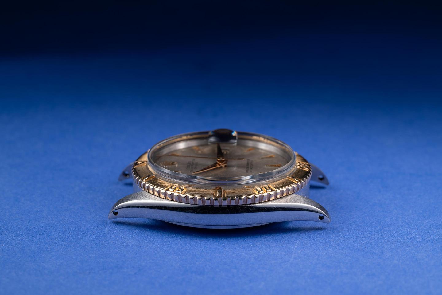 Dial: The grey no-lume SWISS only arrowhead dial is very good, showing some speckling and some light wear for its age. The 18K yellow gold sword hands are excellent, showing some light wear for their age.