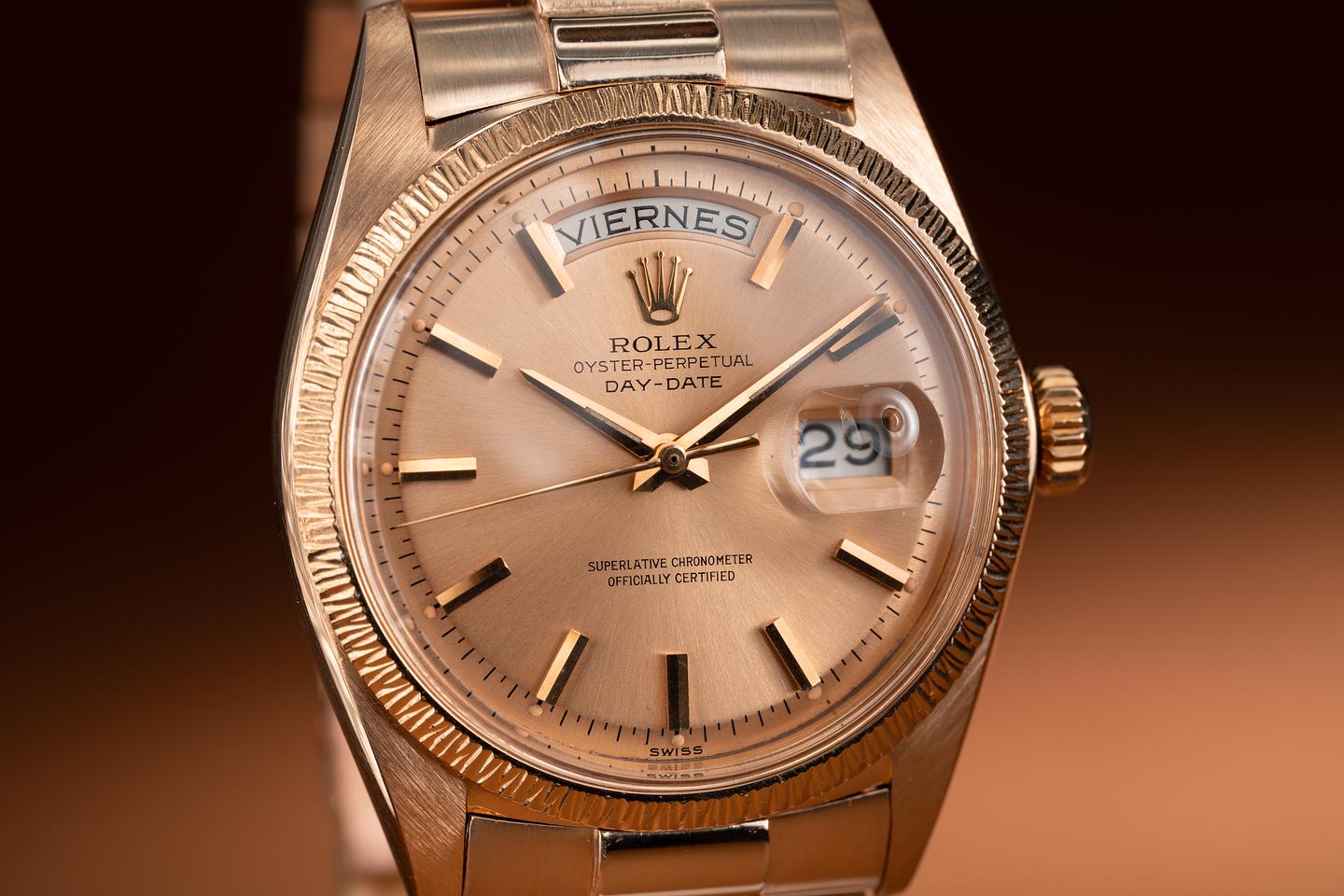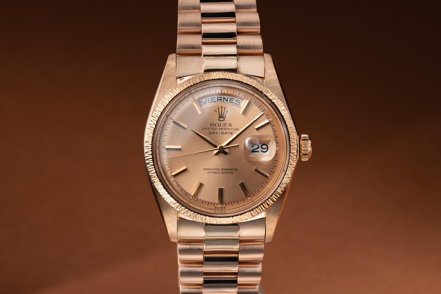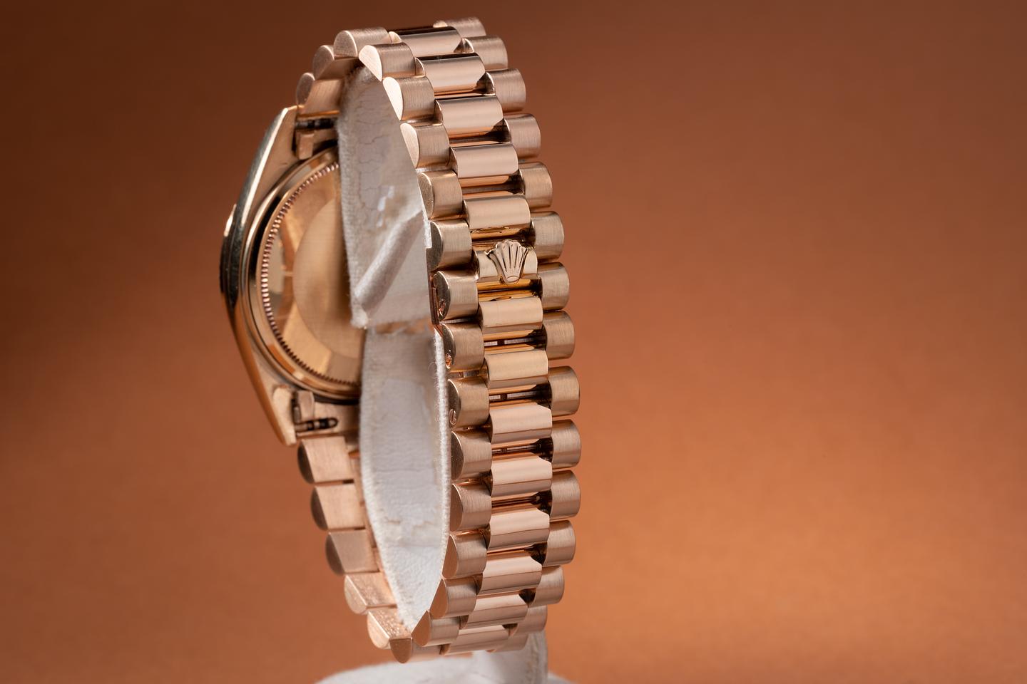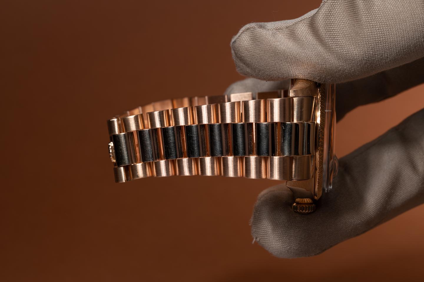 Bracelet: The newer 22 link 18k rose gold President bracelet is excellent and shows only very light stretch.