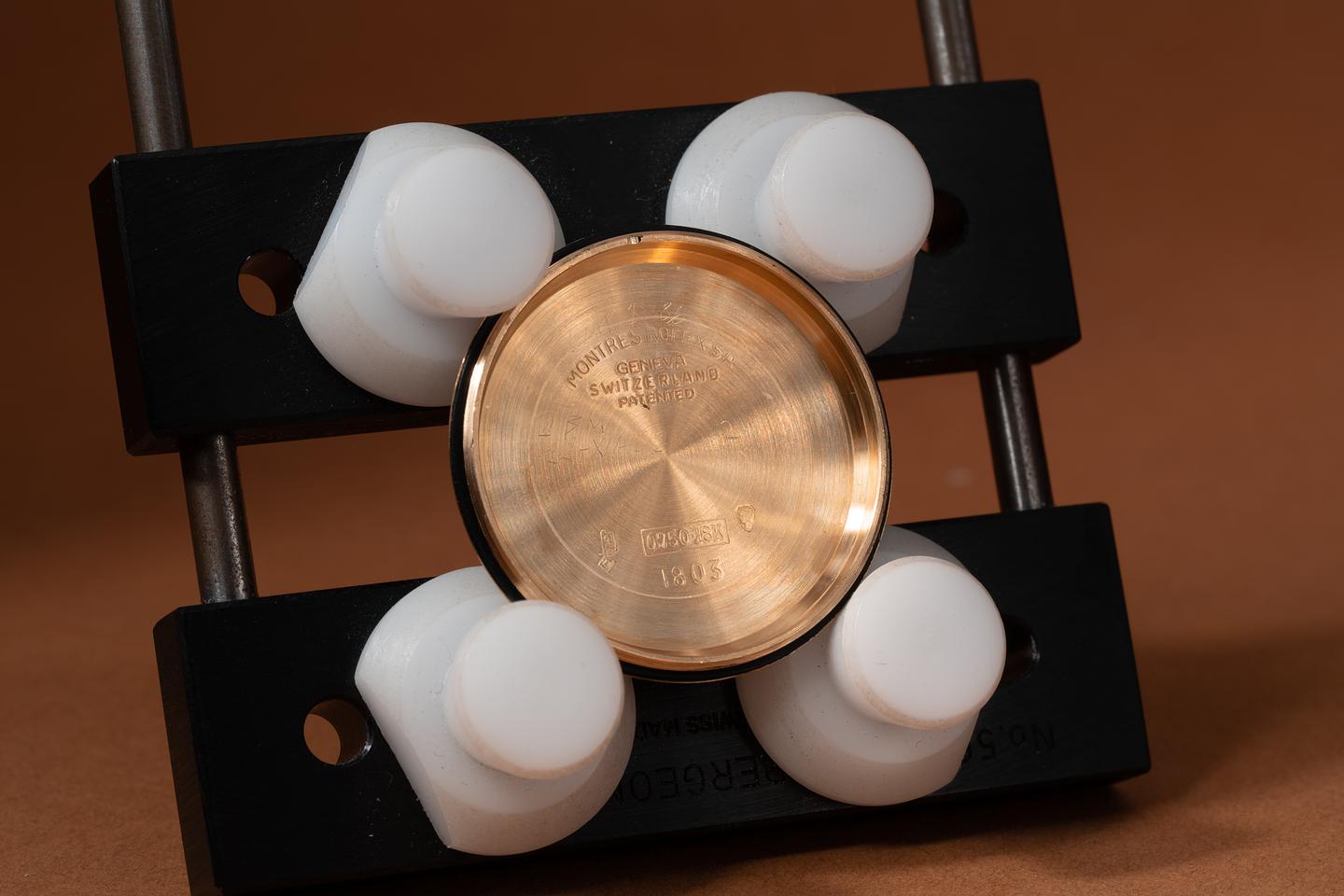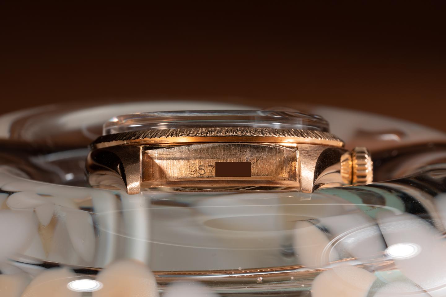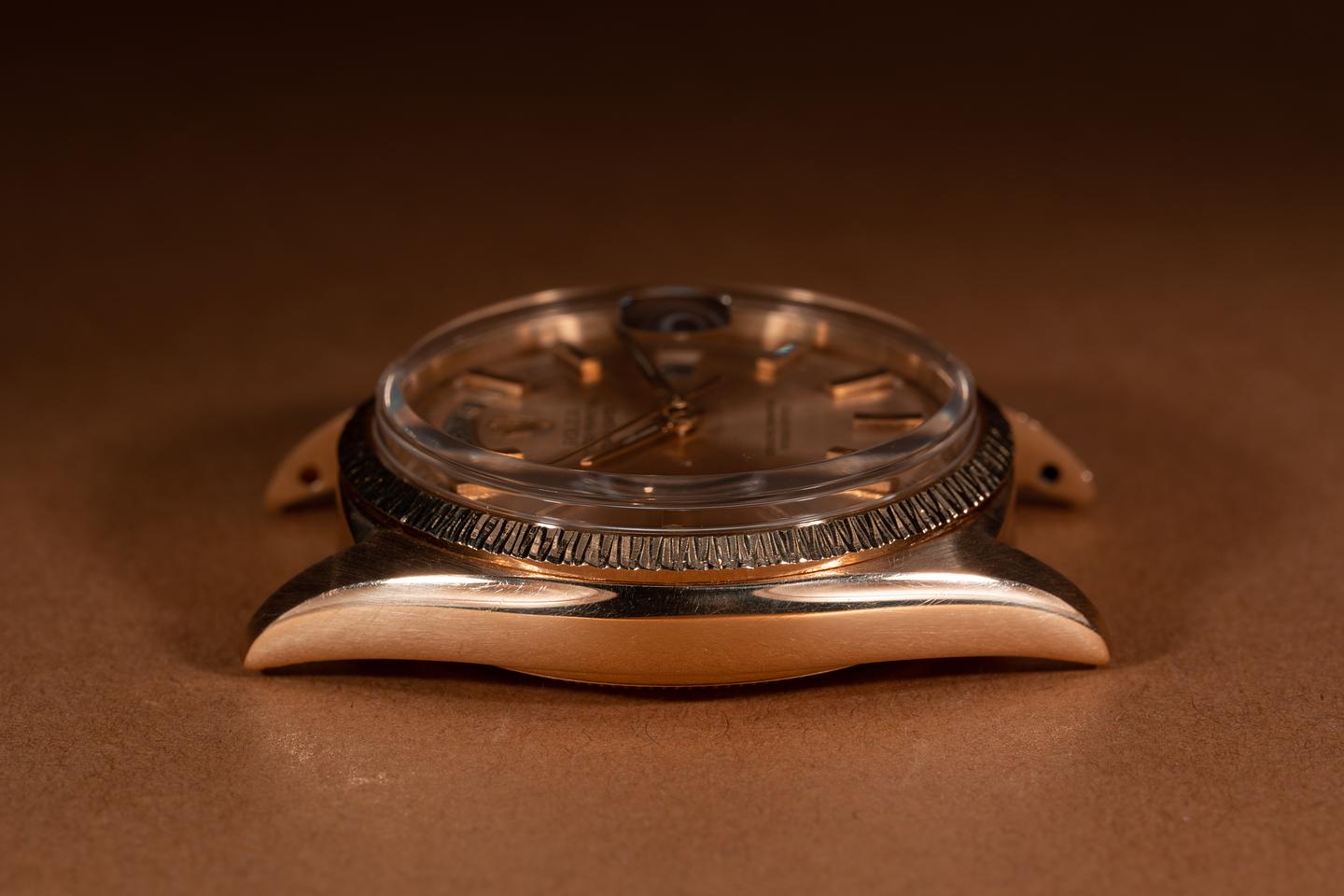 Case: The recently polished 18k rose gold case is excellent showing only extrely light wear. The 18k rose gold bark bezel is also in excellent condition showing only very light wear from use.
