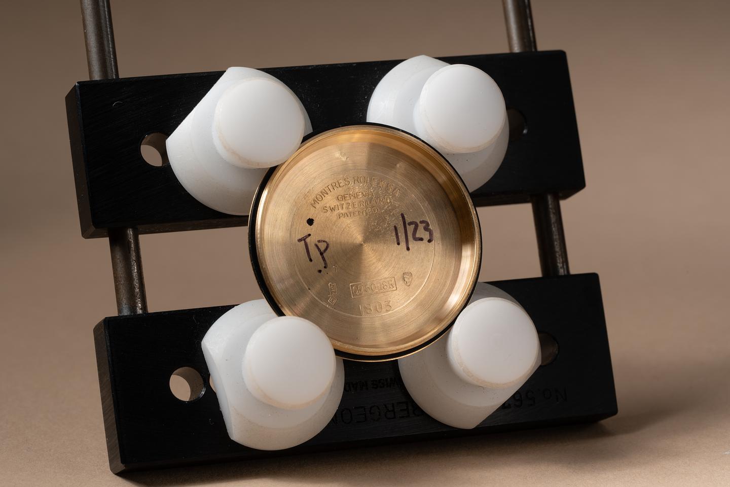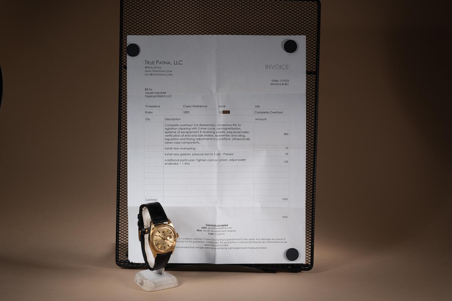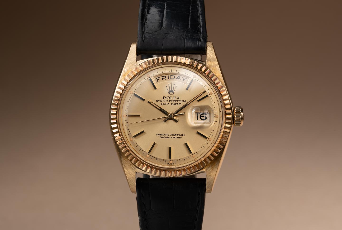 Bracelet: The black leather Rolex Crocodile strap is very good showing average wear for its age. The 18k yellow gold Rolex buckle is excellent showing only light wear.