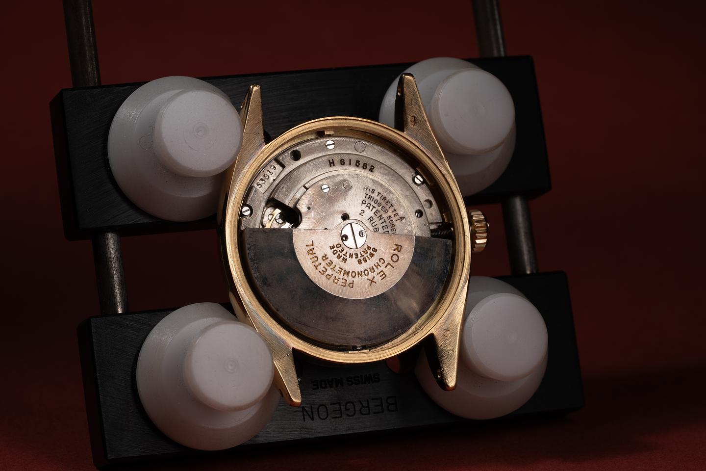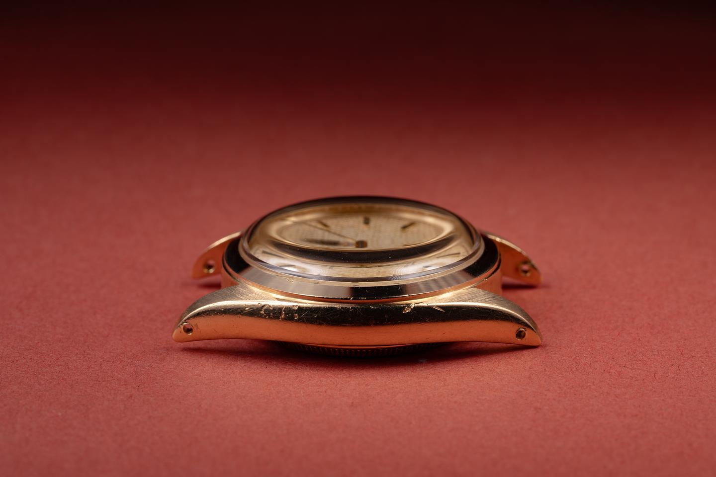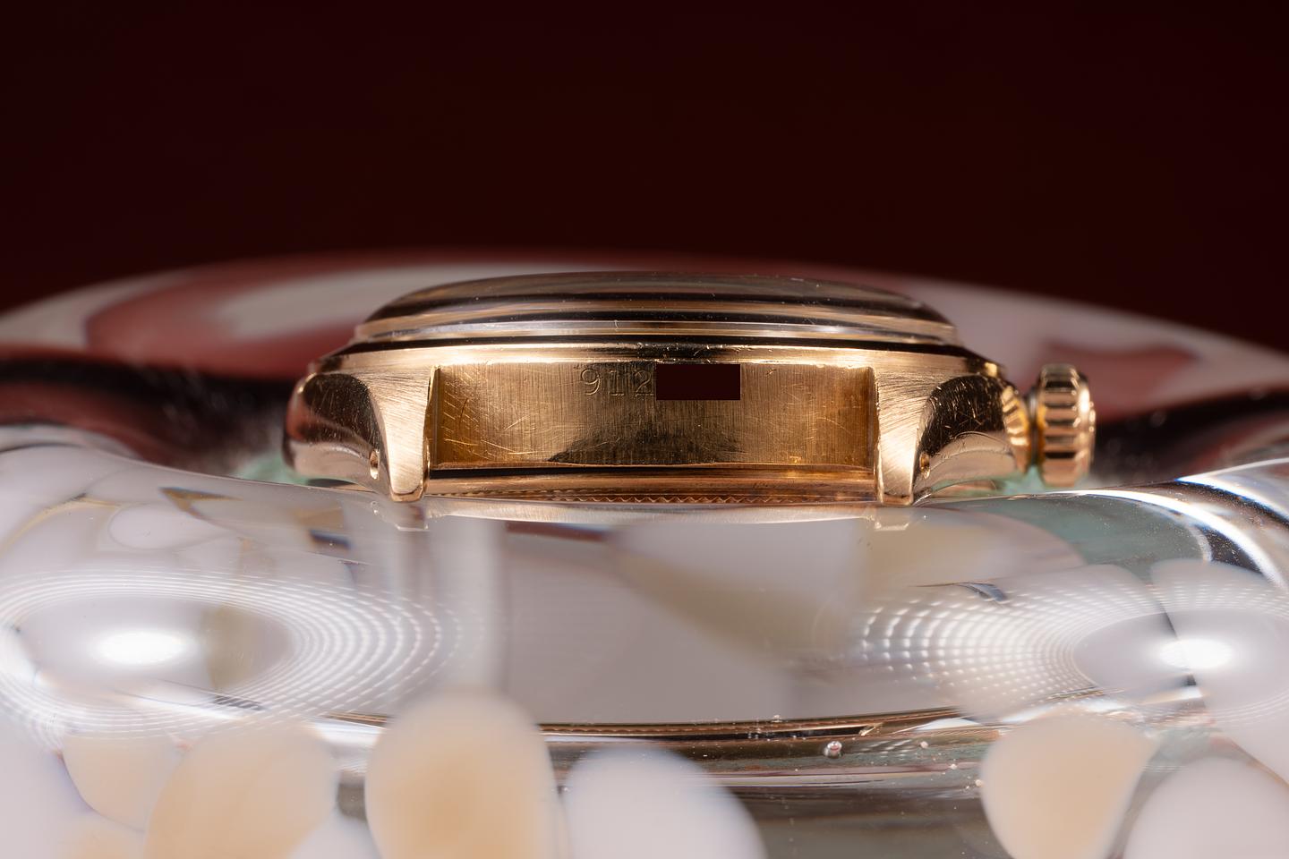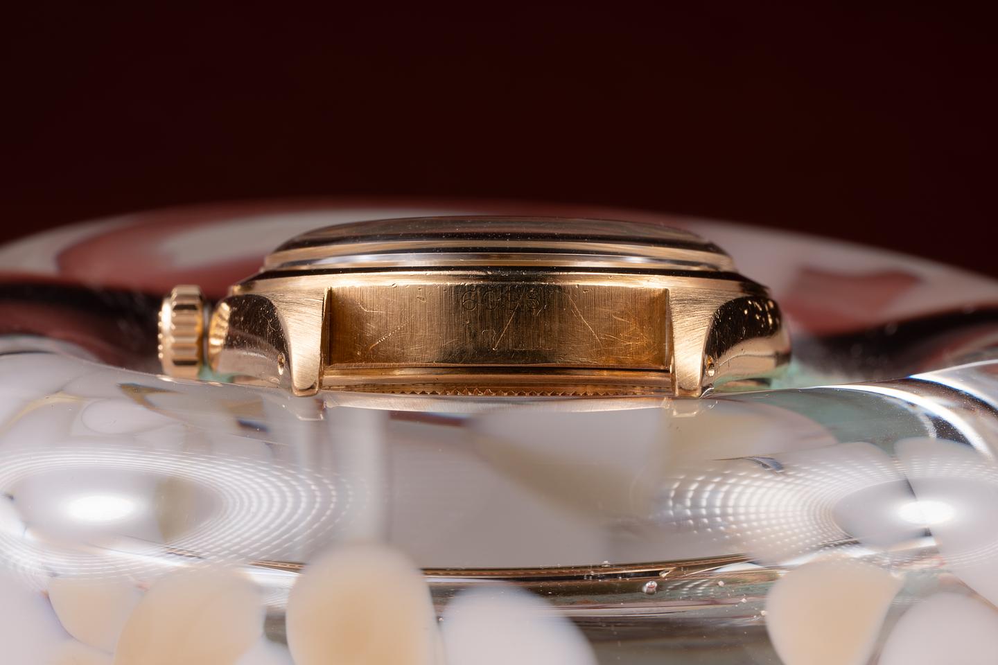 Dial: The excellent pearlescent silver dial is beginning to fade, with the gold base layer of the dial beginning to show through. The dagger hands are also in excellent condition and appear to be original to the watch. enamel.