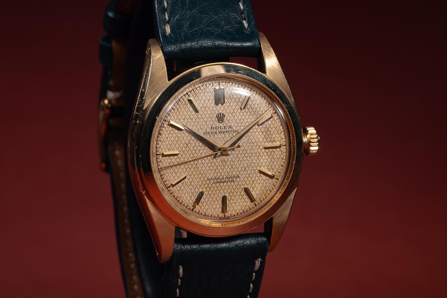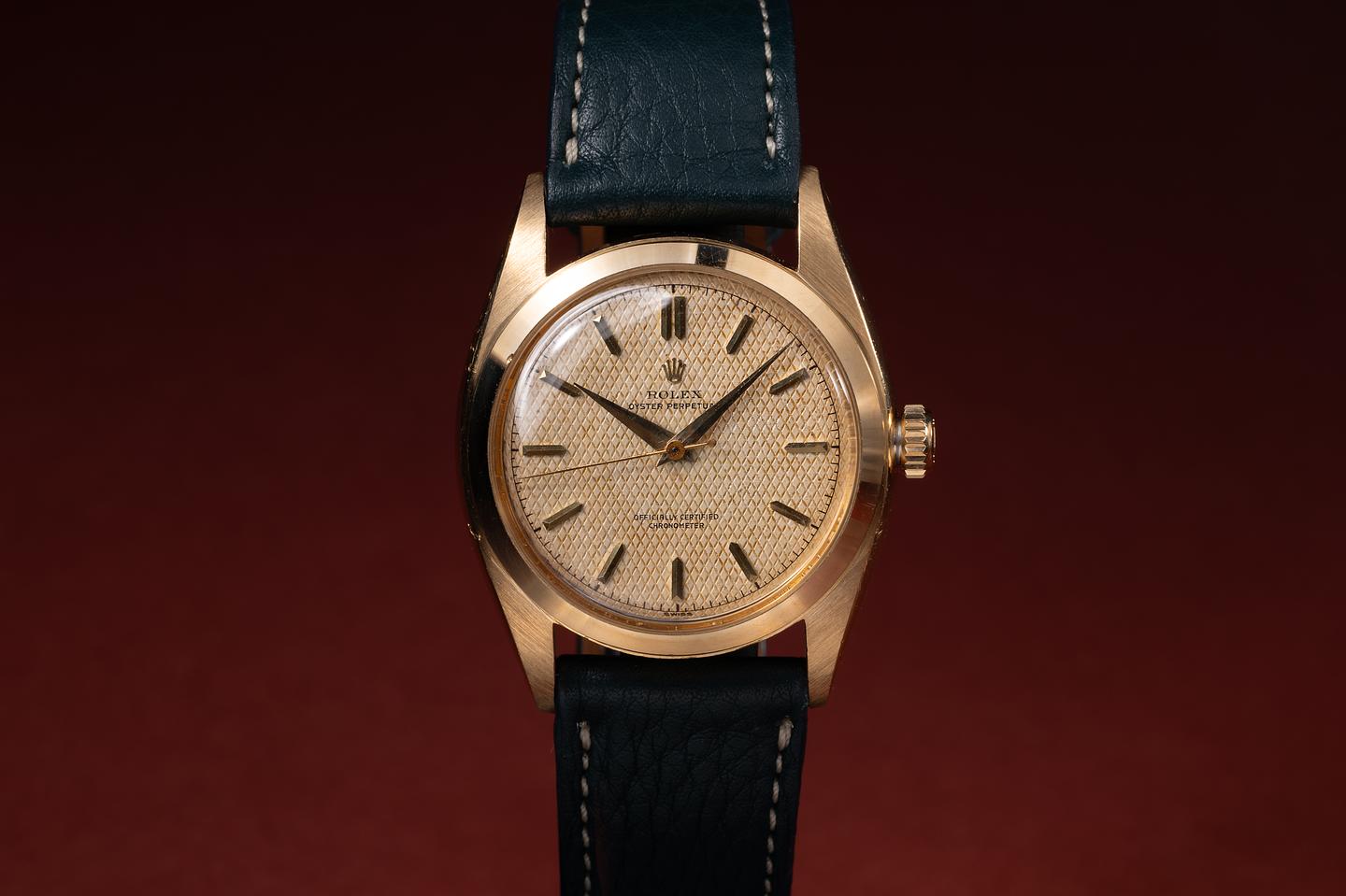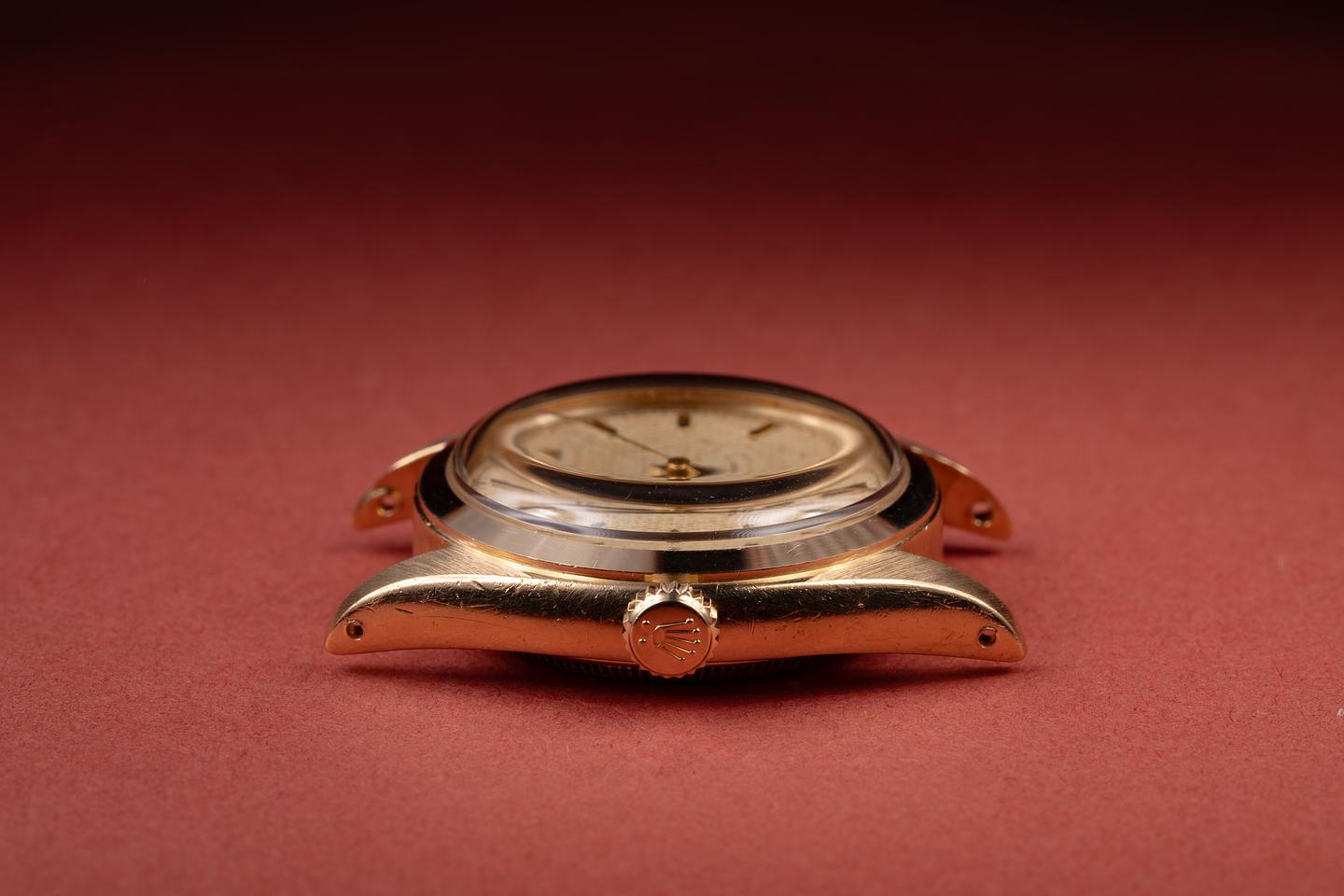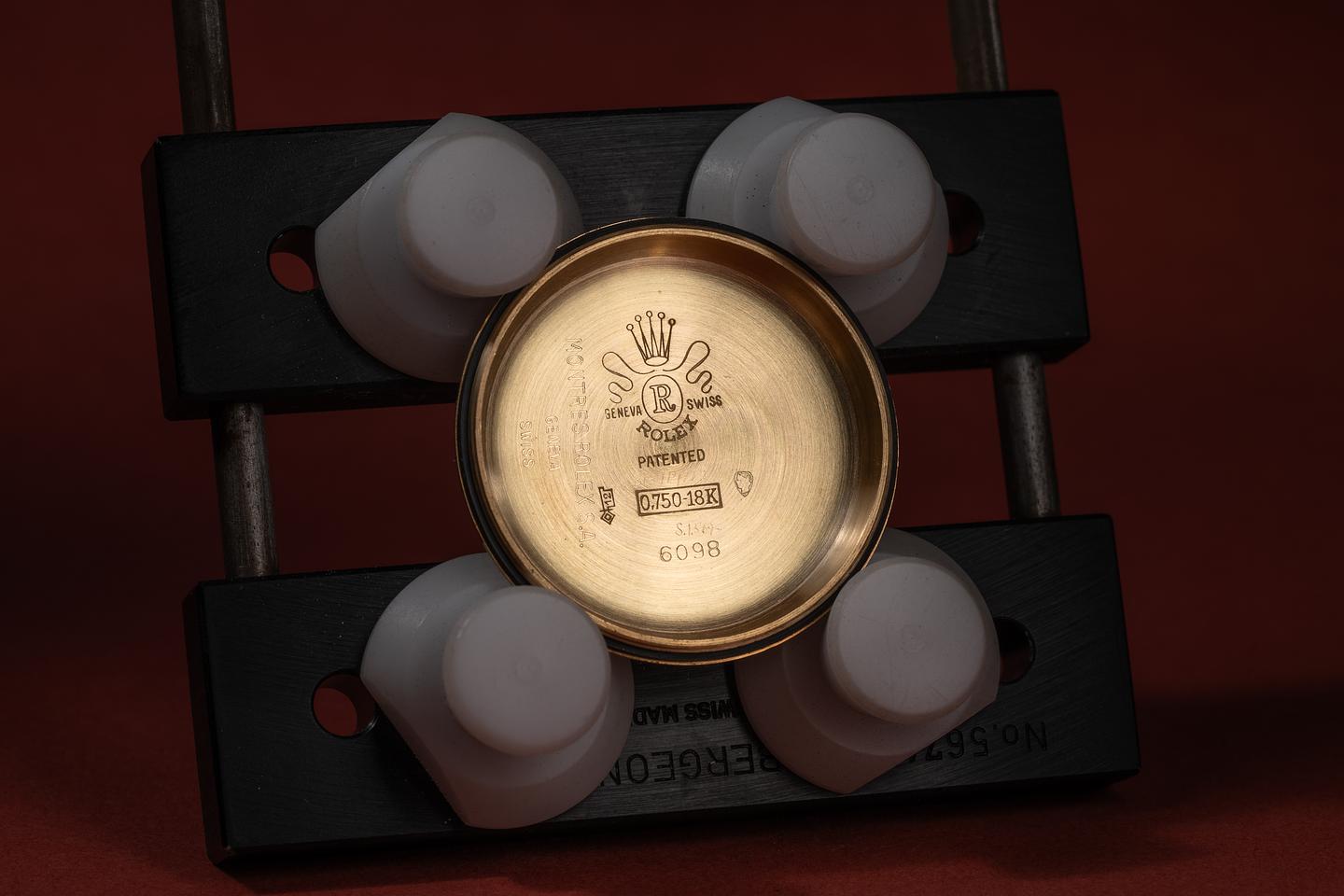 Dial: The excellent pearlescent silver dial is beginning to fade, with the gold base layer of the dial beginning to show through. The dagger hands are also in excellent condition and appear to be original to the watch. enamel.