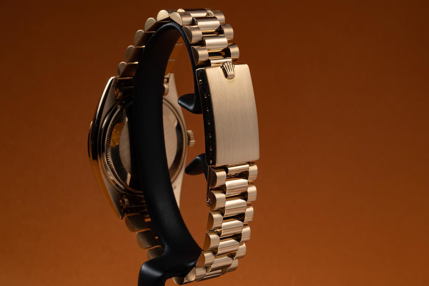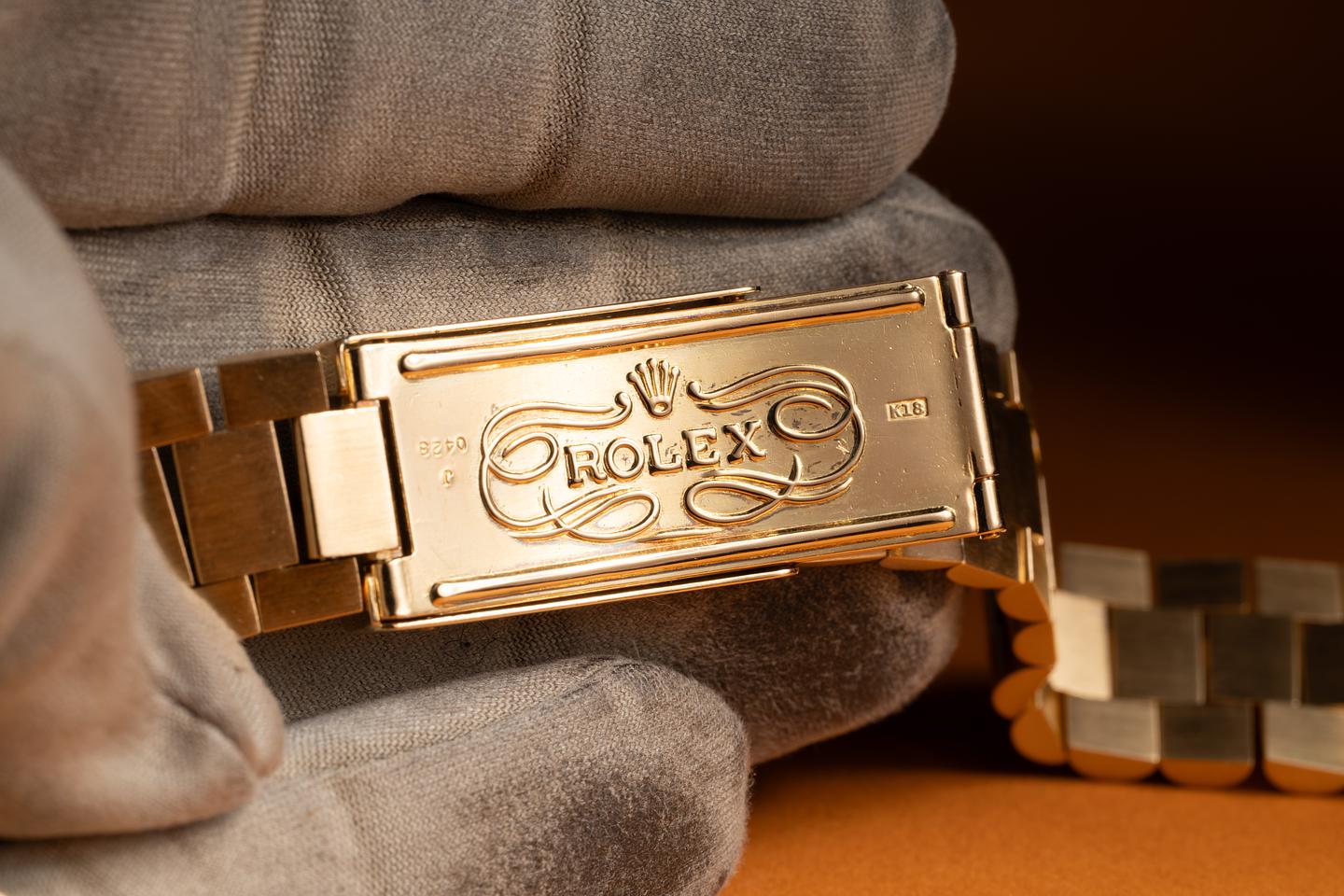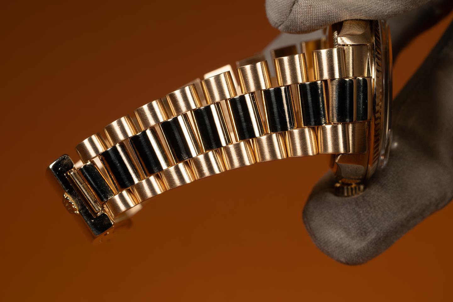 Bracelet: The 19-link 18K yellow gold president bracelet is excellent, showing light to average stretch for its age. The bracelet will fit up to a 7.5in wrist.