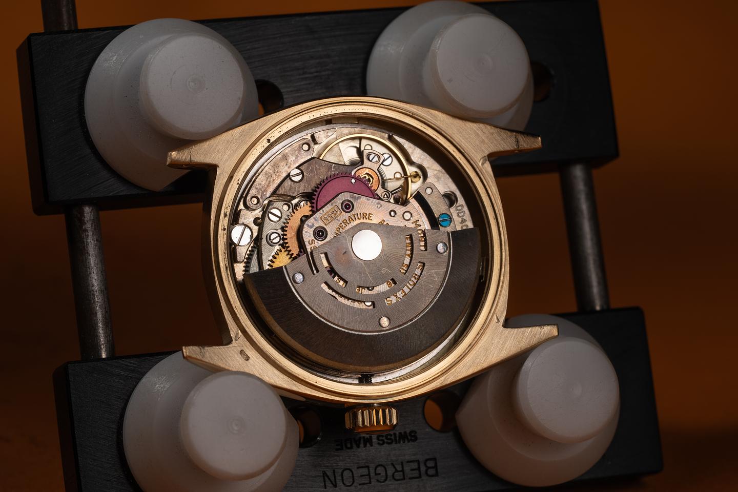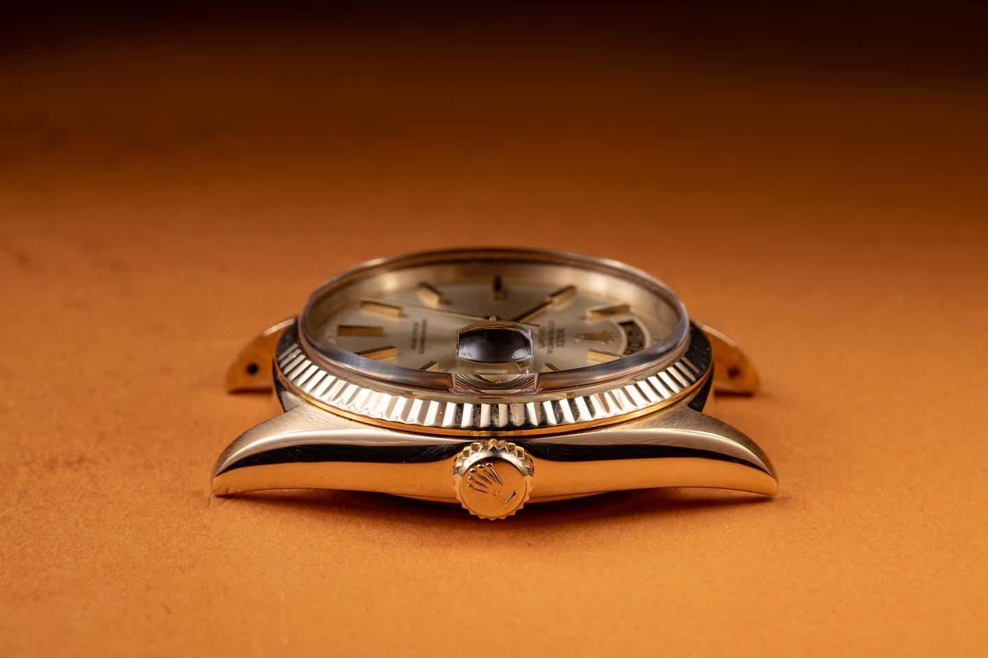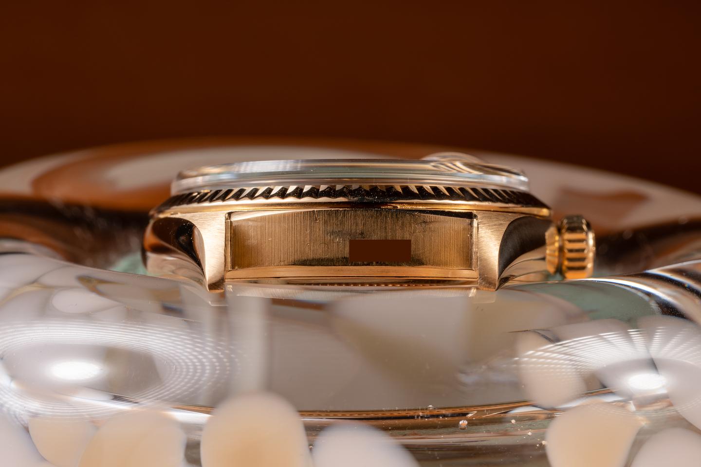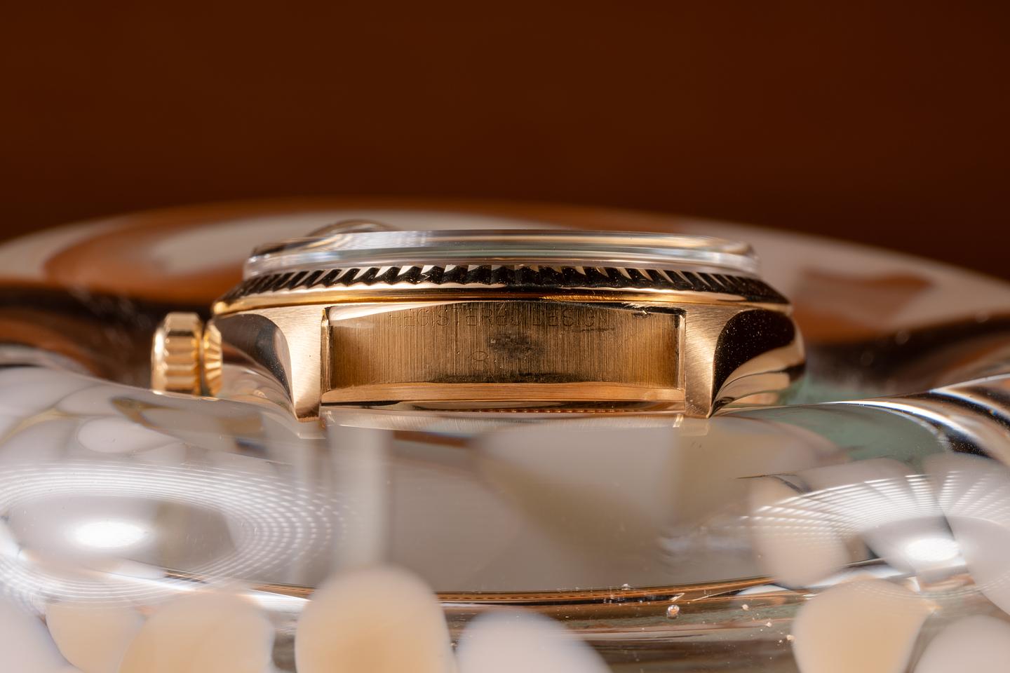 Case: The recently polished 18K yellow gold case is excellent, showing only very light wear. The sharp, freshly polished 18K yellow gold fluted bezel is also in excellent condition, showing only very light wear.