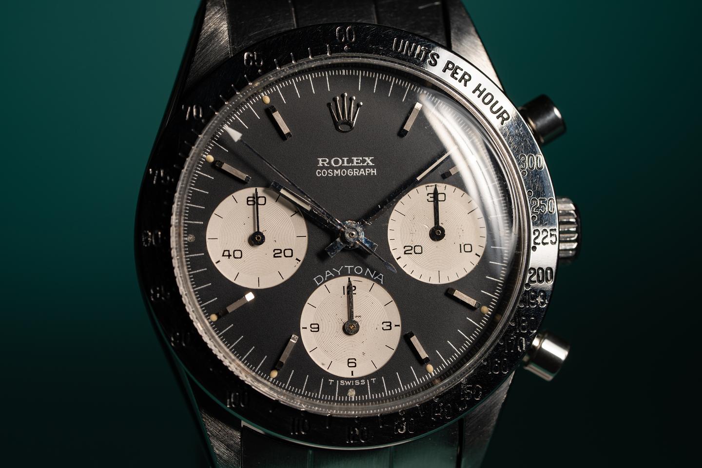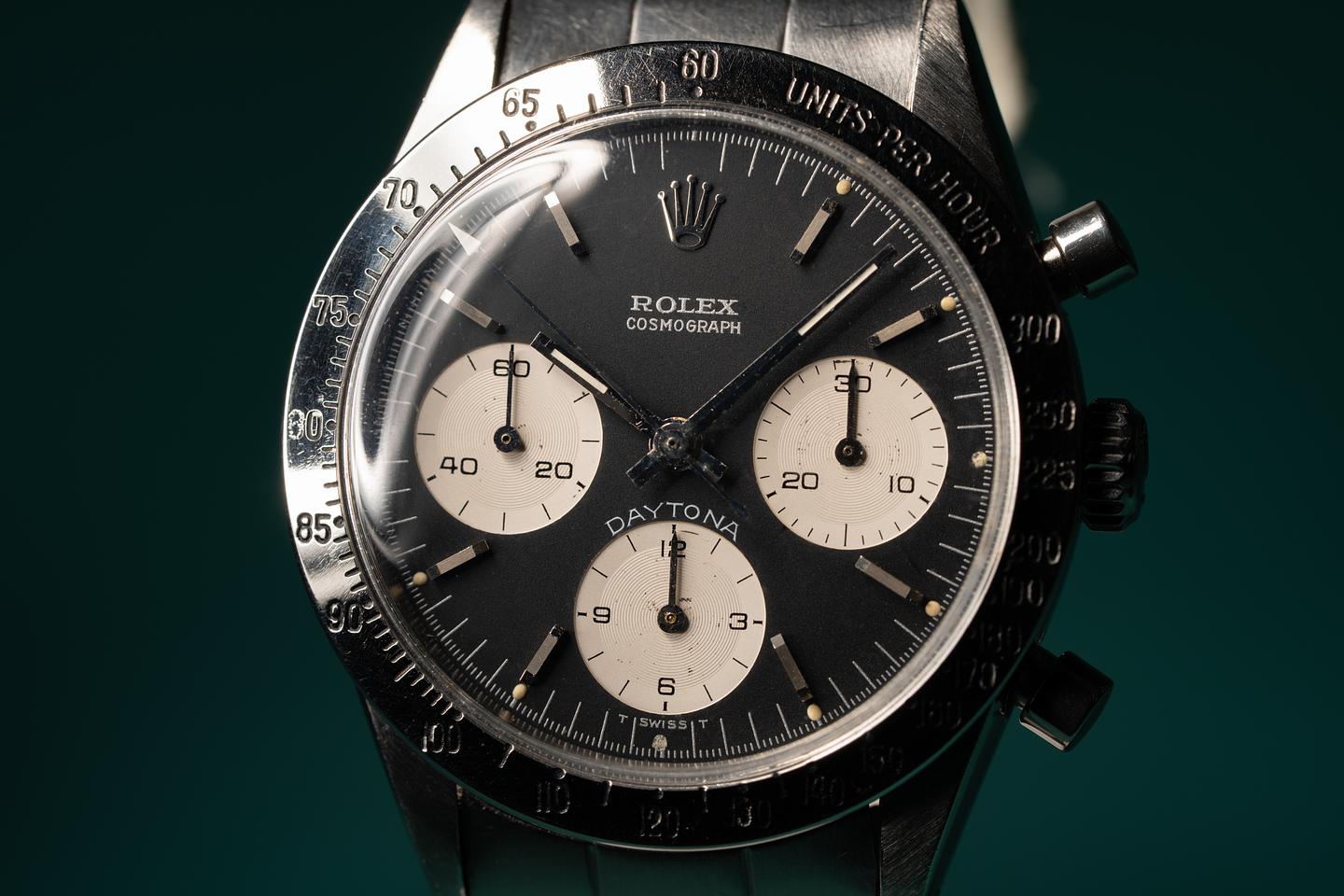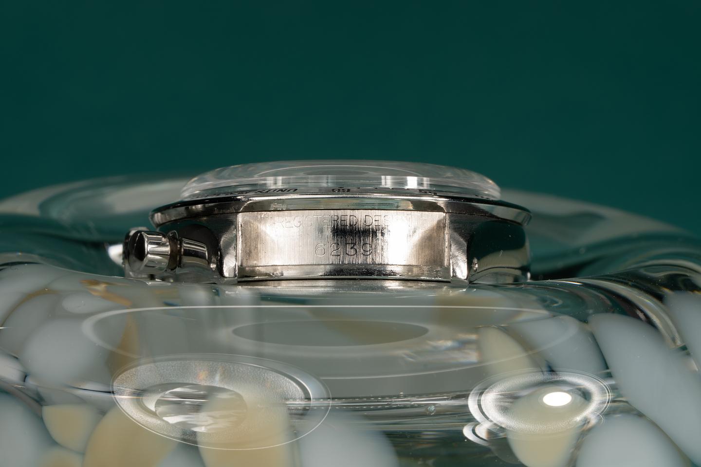 Notes: The slight blue tint of the white enamel spelling out "Daytona" on the black dial 6239s is the reason why people first started calling these Blue Daytona Dials.