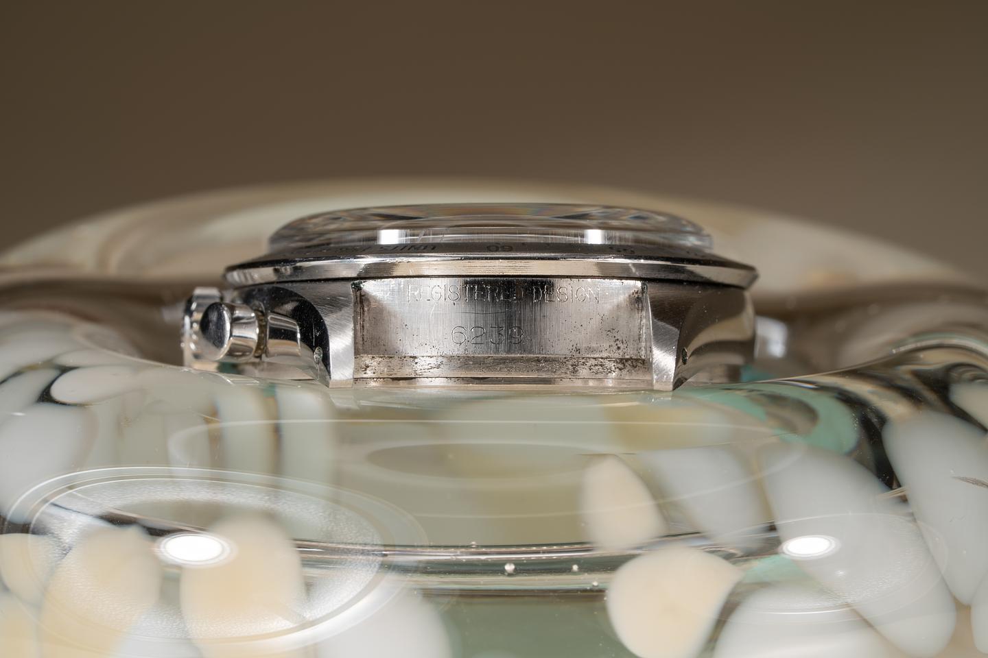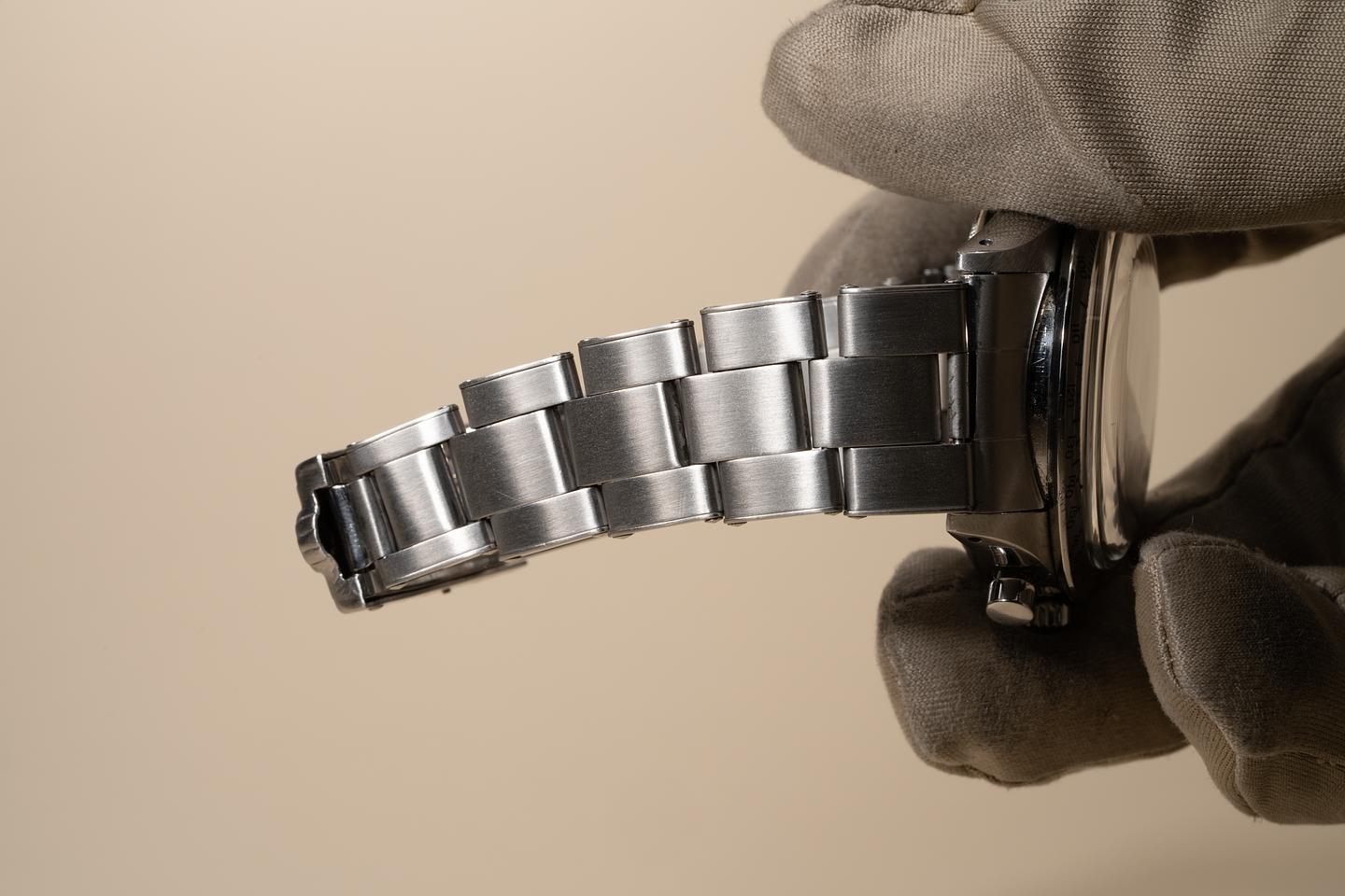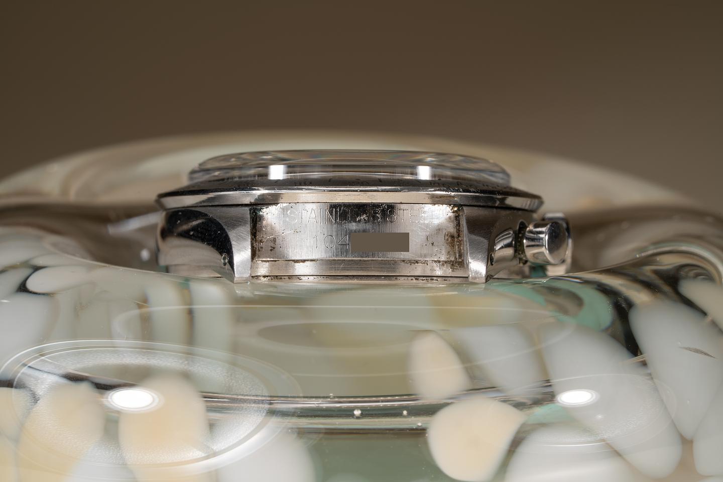 Case: The thick and even case has been polished in the past showing only light wear from use. The early matte finish stainless "Units Per Hour" bezel is also in excellent condition showing only very light wear from use.