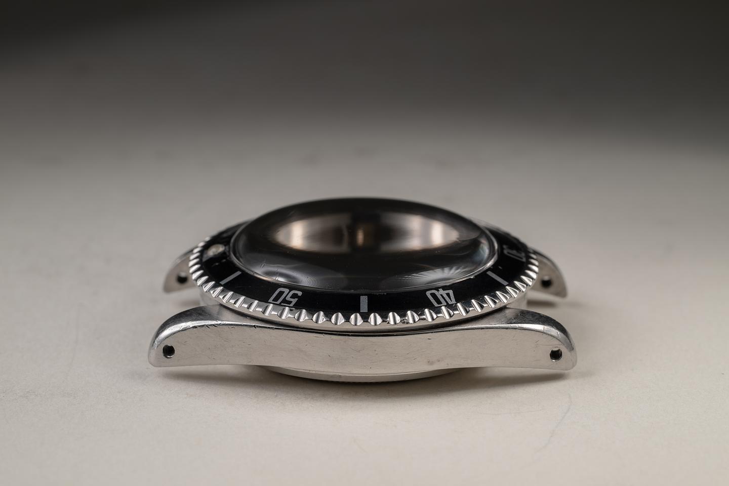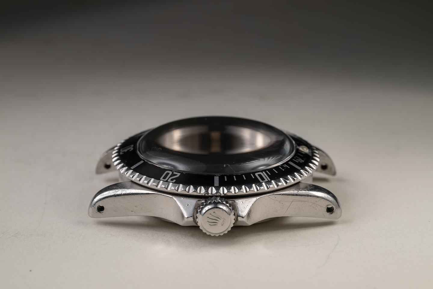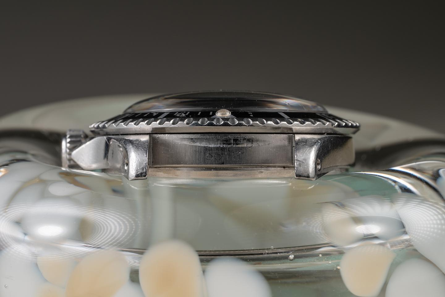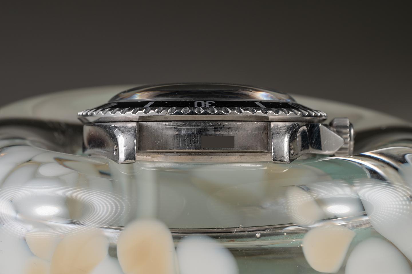 Case: The unpolished pointed crown guard case is excellent, showing intact and prominent factory bevels and average wear for its age. The bezel insert is also in excellent condition and has aged to a dark charcoal tone, showing light to average wear for its age.