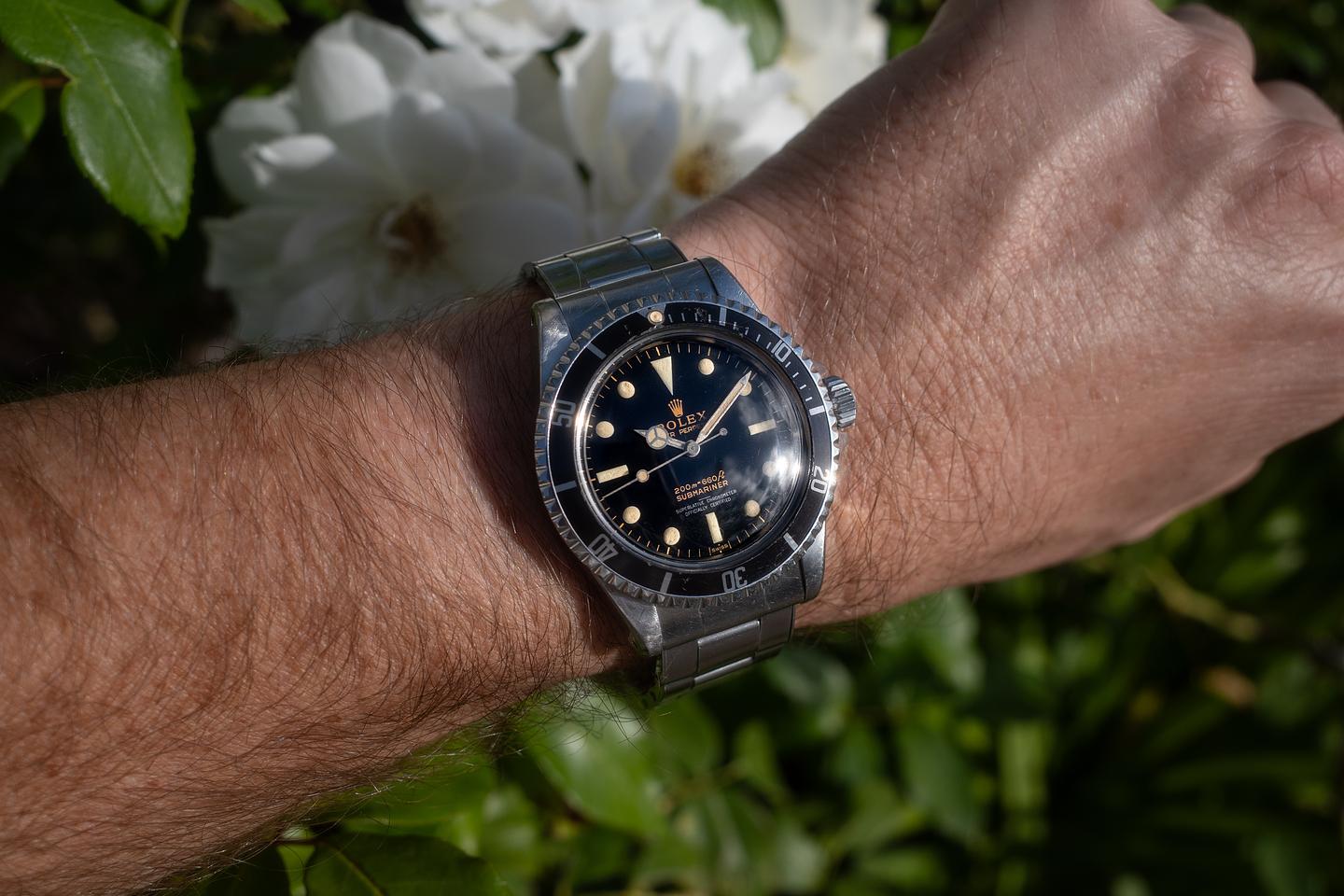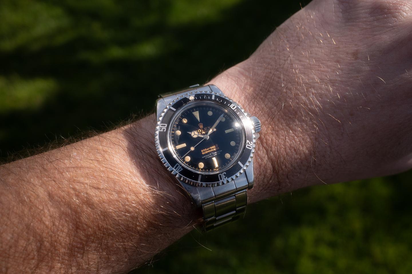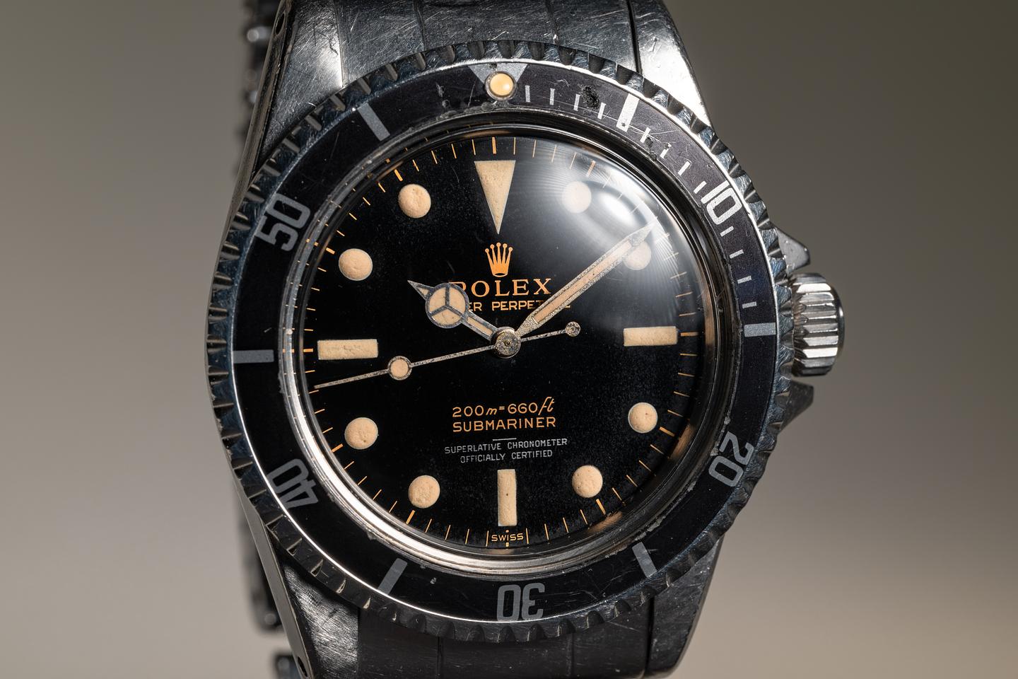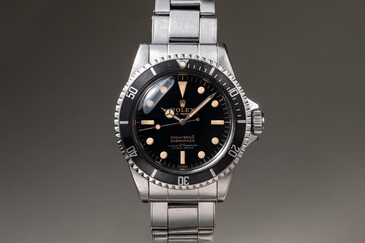 Case: The unpolished pointed crown guard case is excellent, showing intact and prominent factory bevels and average wear for its age. The bezel insert is also in excellent condition and has aged to a dark charcoal tone, showing light to average wear for its age.