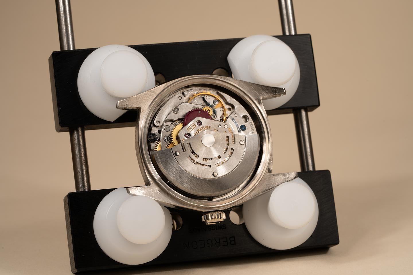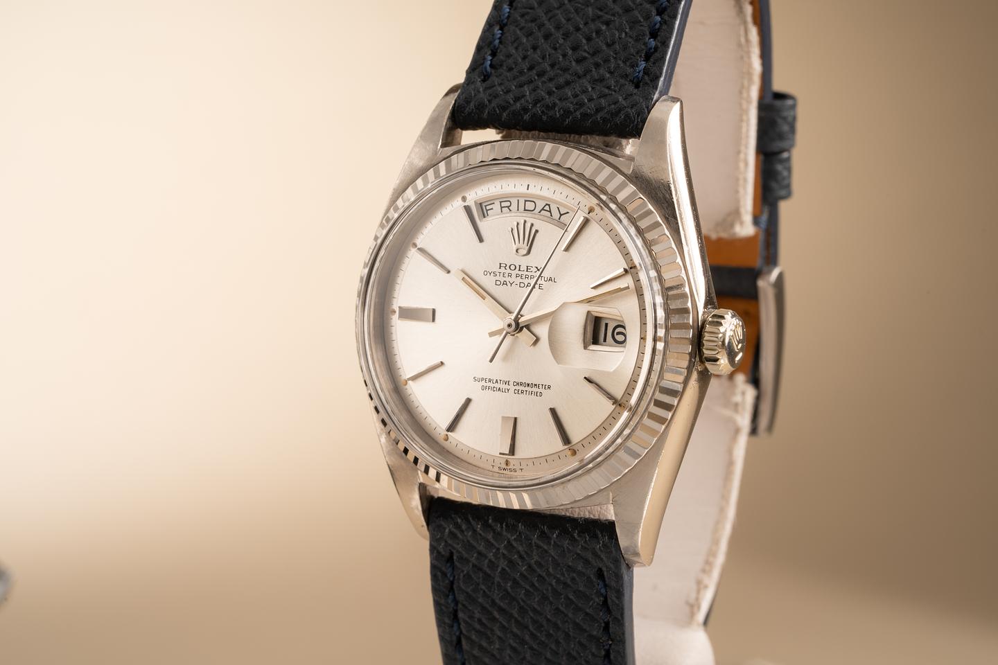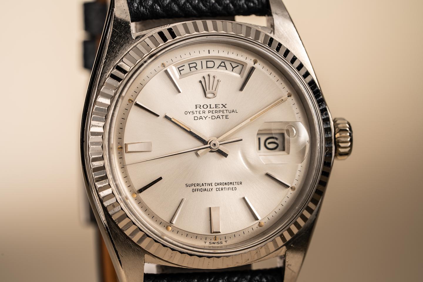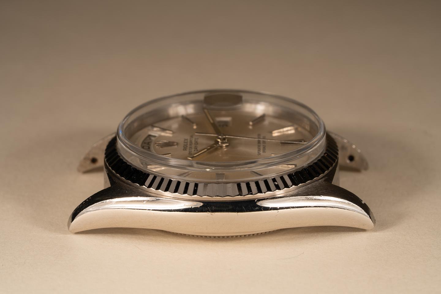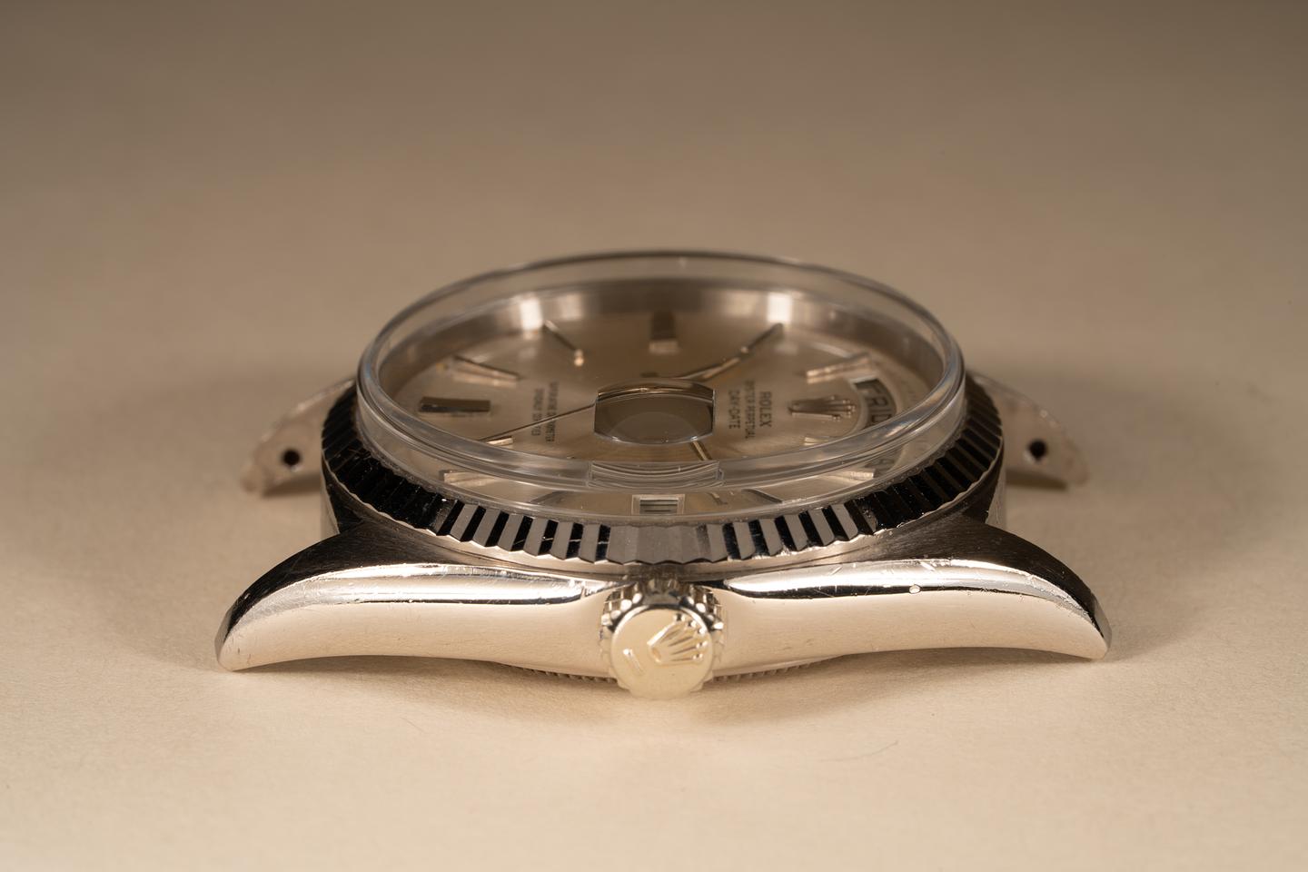 Dial: The silver doorstop dial is excellent showing little if any wear. most of the lume plots are missing some or all of their luminous mass which is not uncommon for day-dates from this era. The remaining lume has aged to a warm creamy hue and the hands match perfectly.