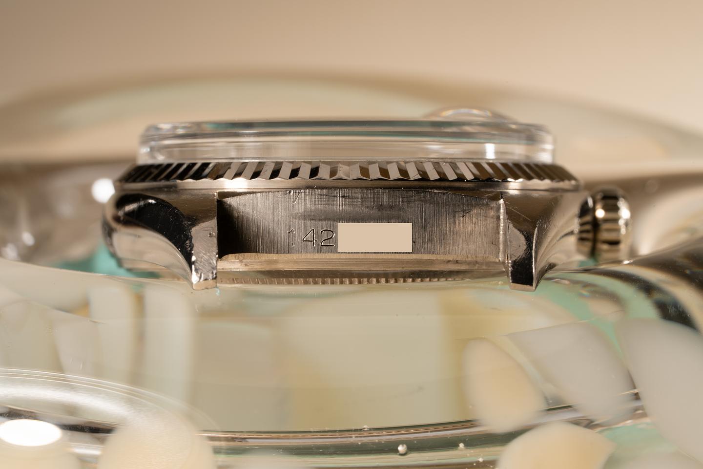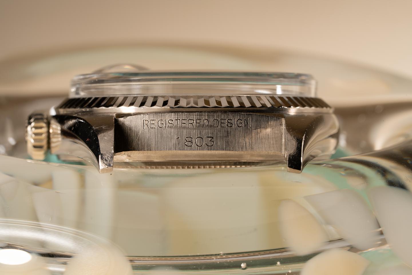 Case: The 18k white gold case is excellent showing a semi sleeve polished finish and some light wear from use. The sharp 18k white gold bezel is also in excellent condition showing only light wear from use.