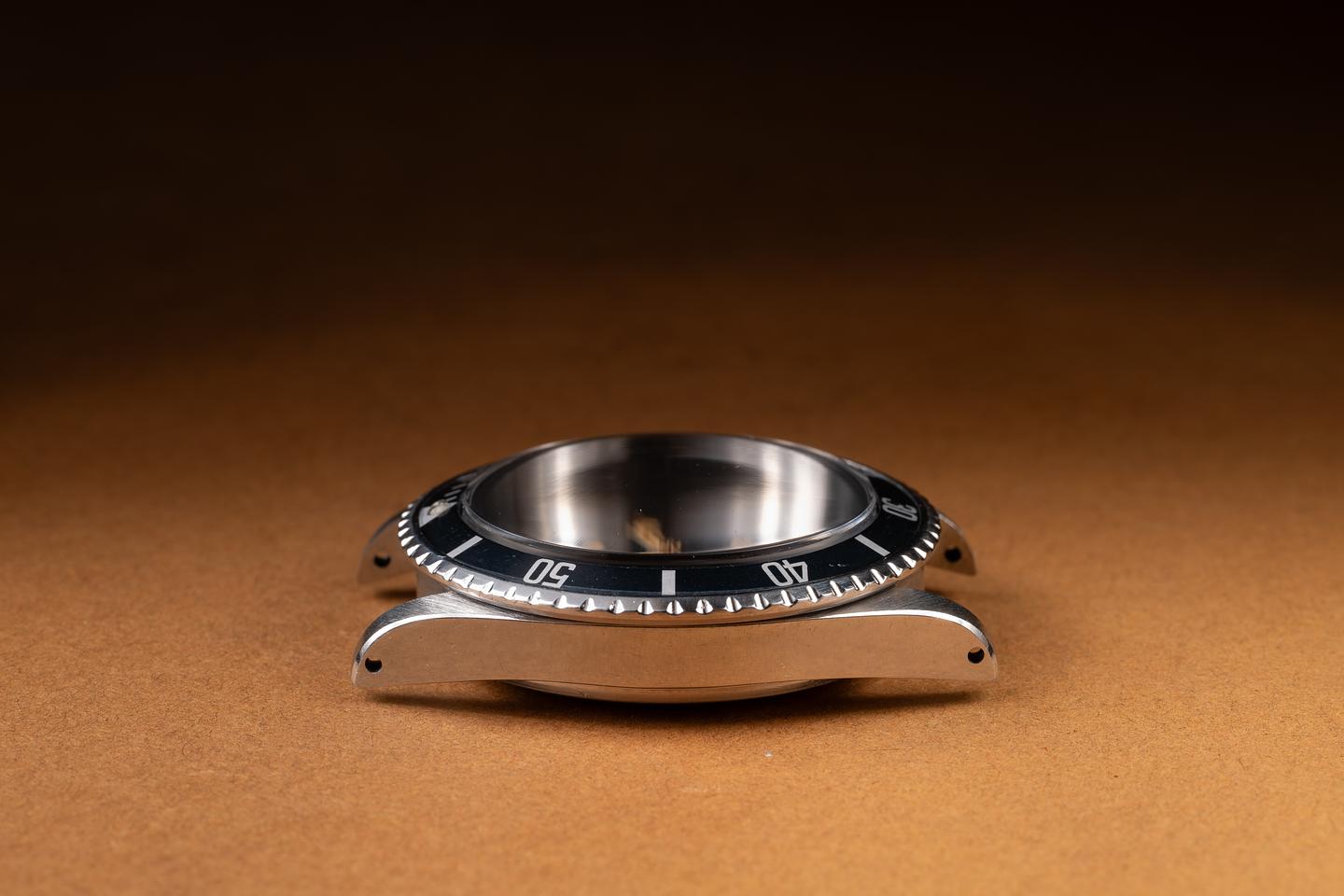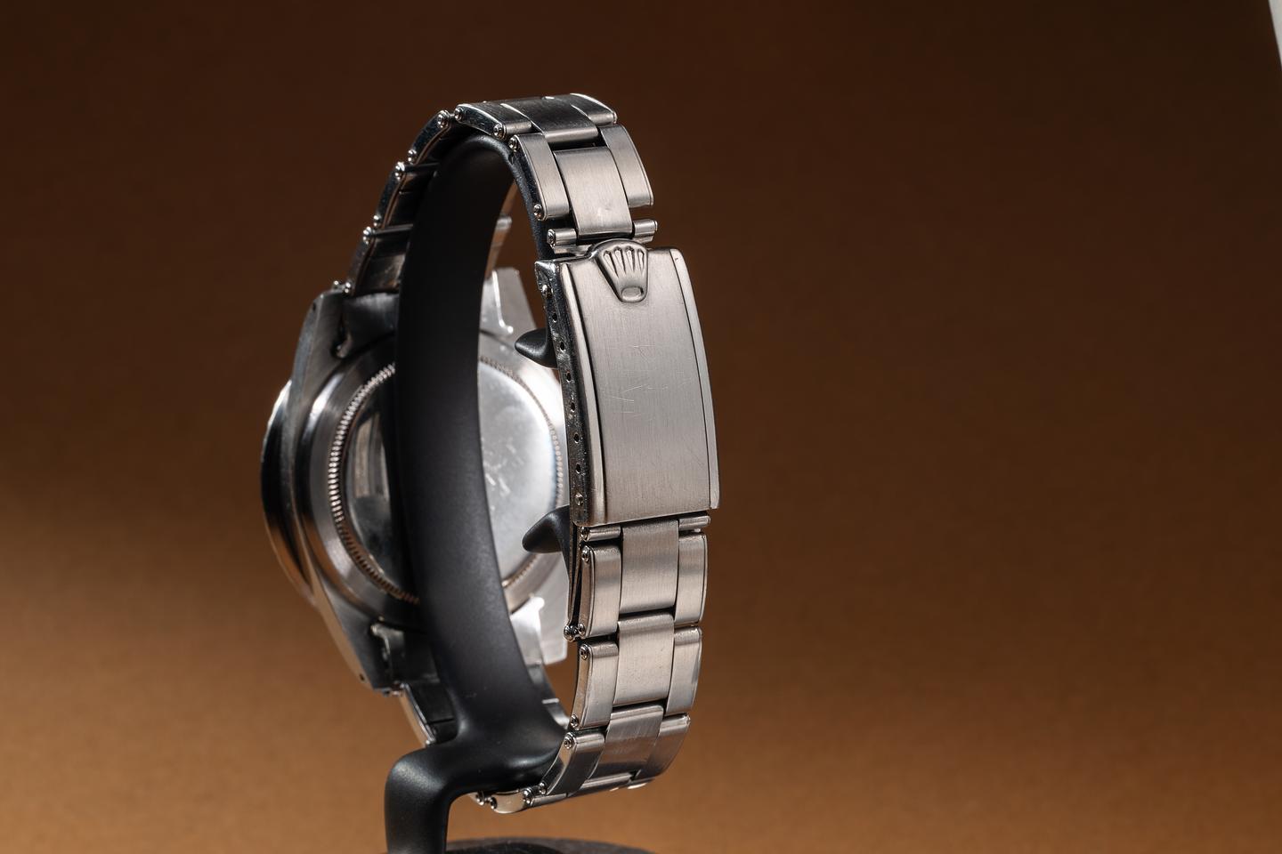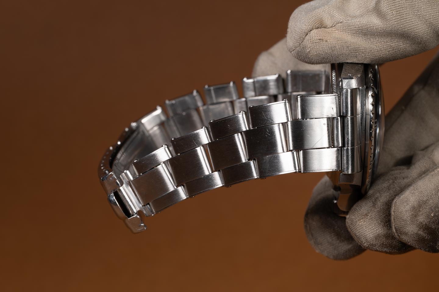 Case: The recently polished case is excellent, showing sharp, prominent bevels and only very light wear. The bezel insert is also in excellent condition and has aged to a navy blue hue.