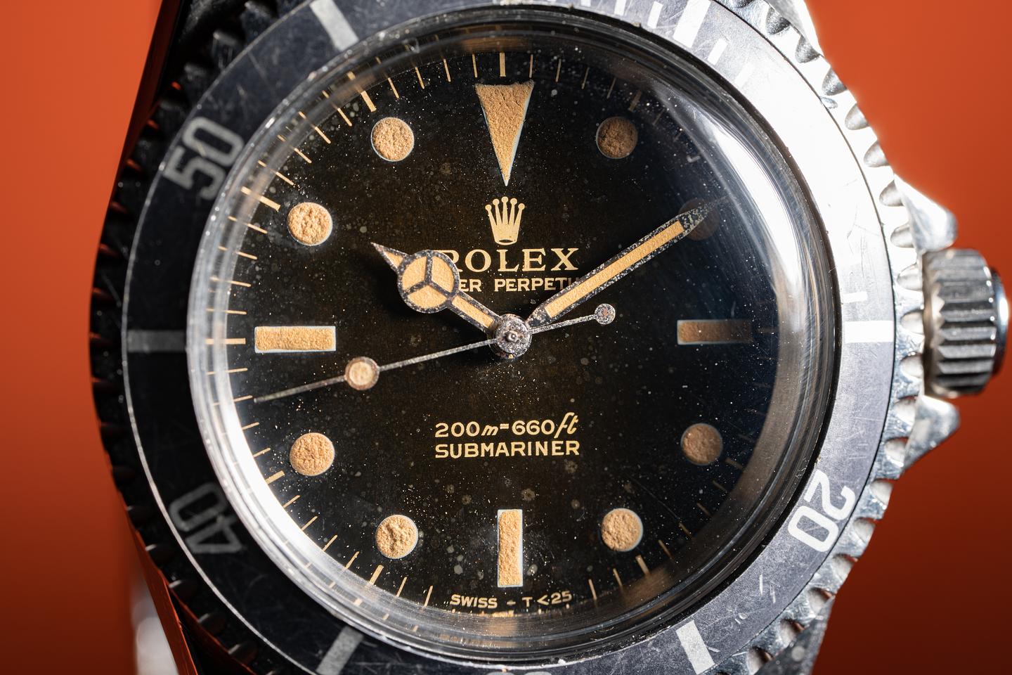 Dial: The patina on the glossy black gilt dial appears like stones on the bottom of a river bed. The patina is even and extensive. There is some additional patina around the 5, 6, and 7 o'clock markers. The lume plots have turned a warm sandy hue and the relumed hands have been colored to match the dial.