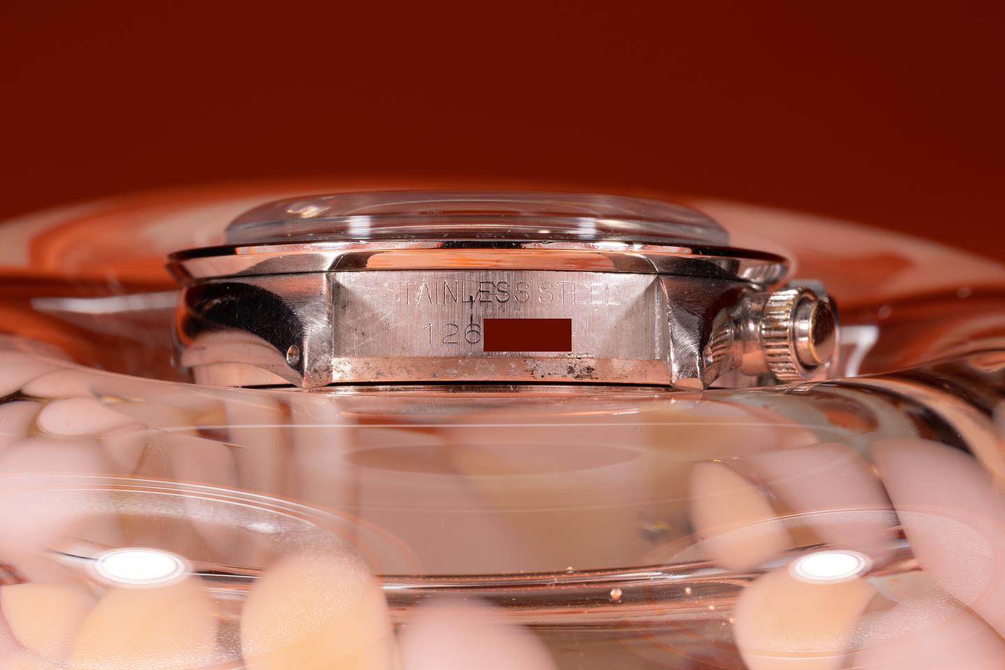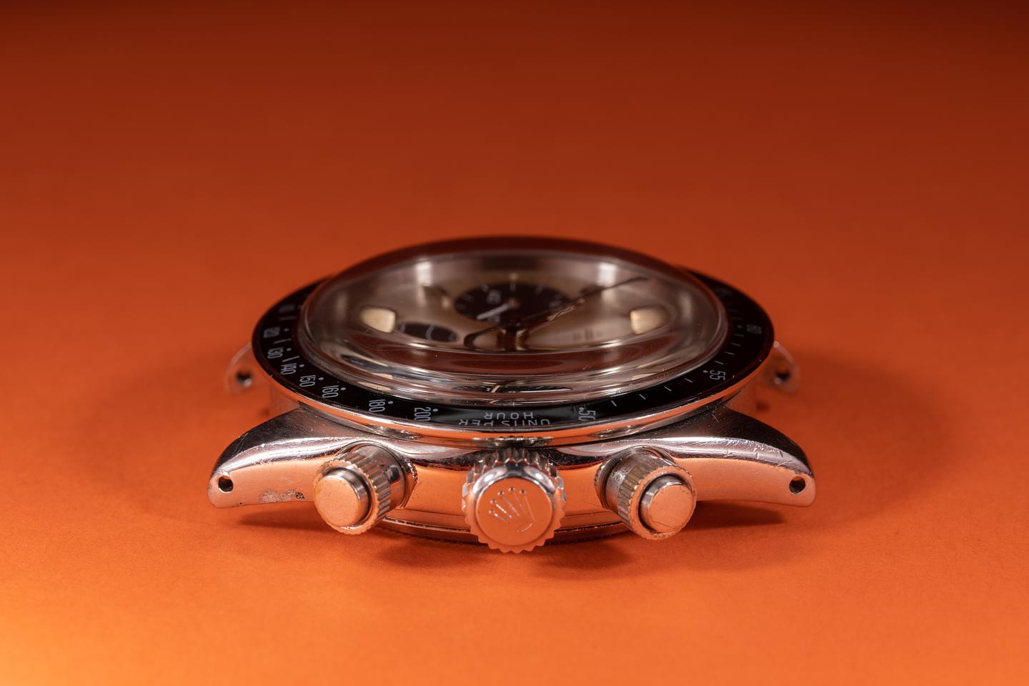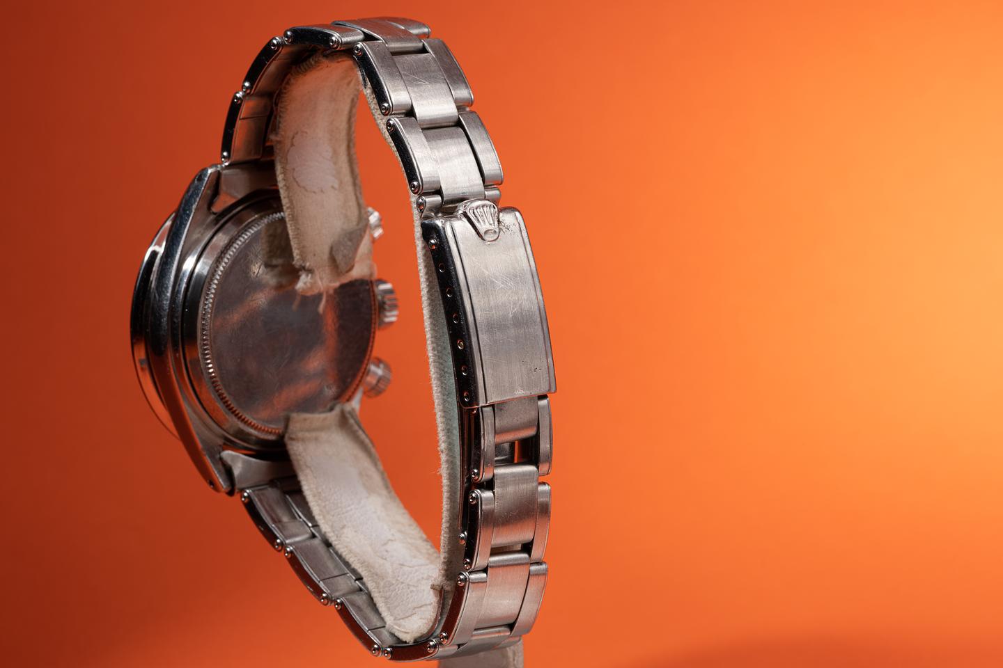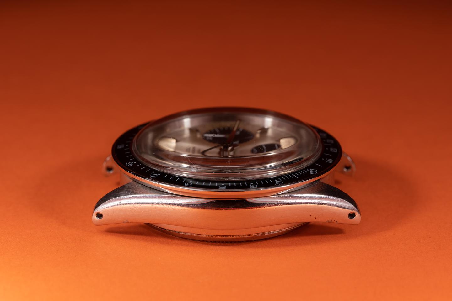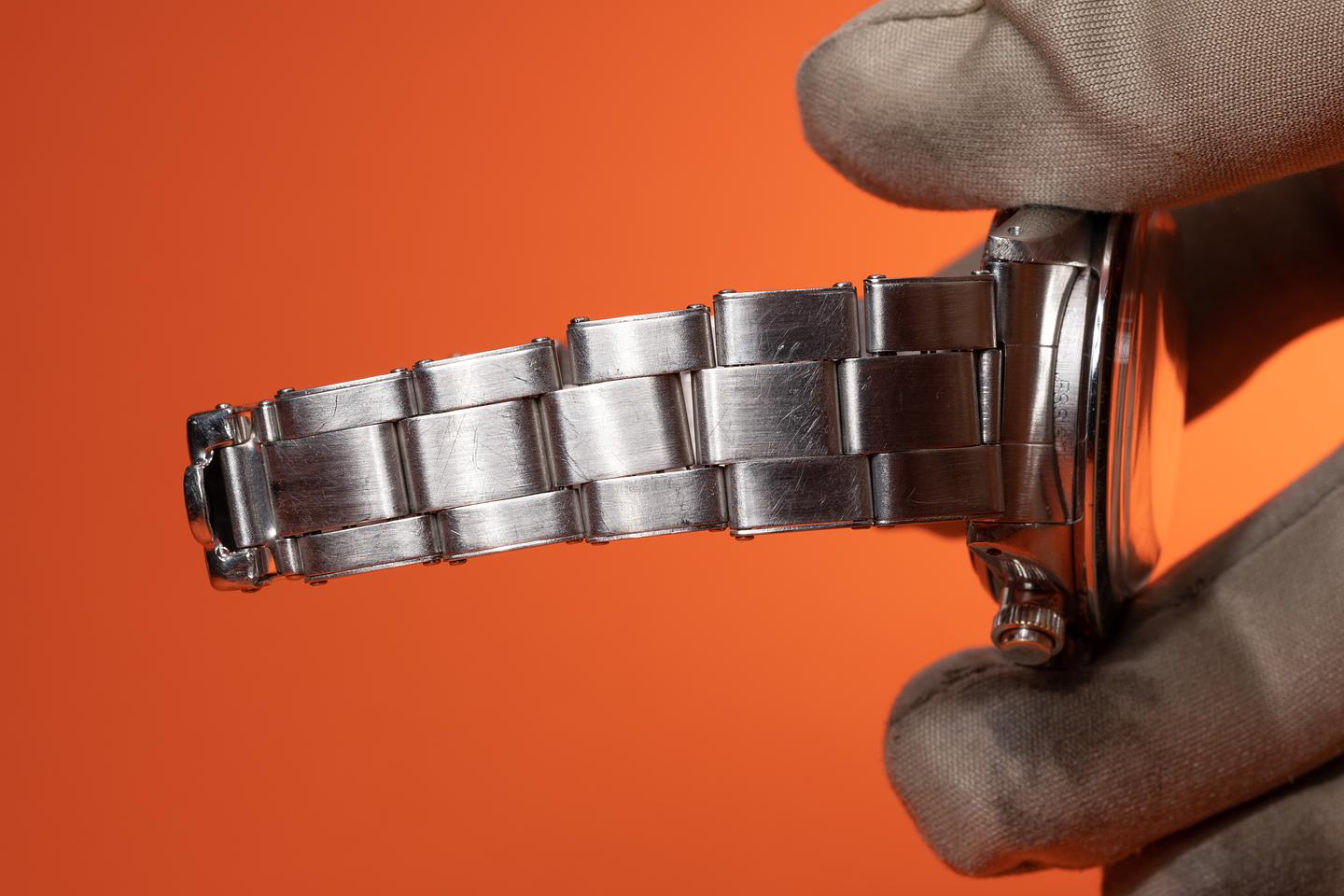 Dial: The "Small Daytona" silver dial is good showing average wear for its age. There are some subtle toolmarks/scratches on the dial between the 11 and 1 o'clock markers and 2 more located between the bottom and right subdials. The lume has aged to a warm creamy hue and the hands match perfectly. The three and 9 o'clock lume plots are missing a portion of their luminous mass. All lume glows brightly when exposed to UV and falls off rapidly at the same rate.