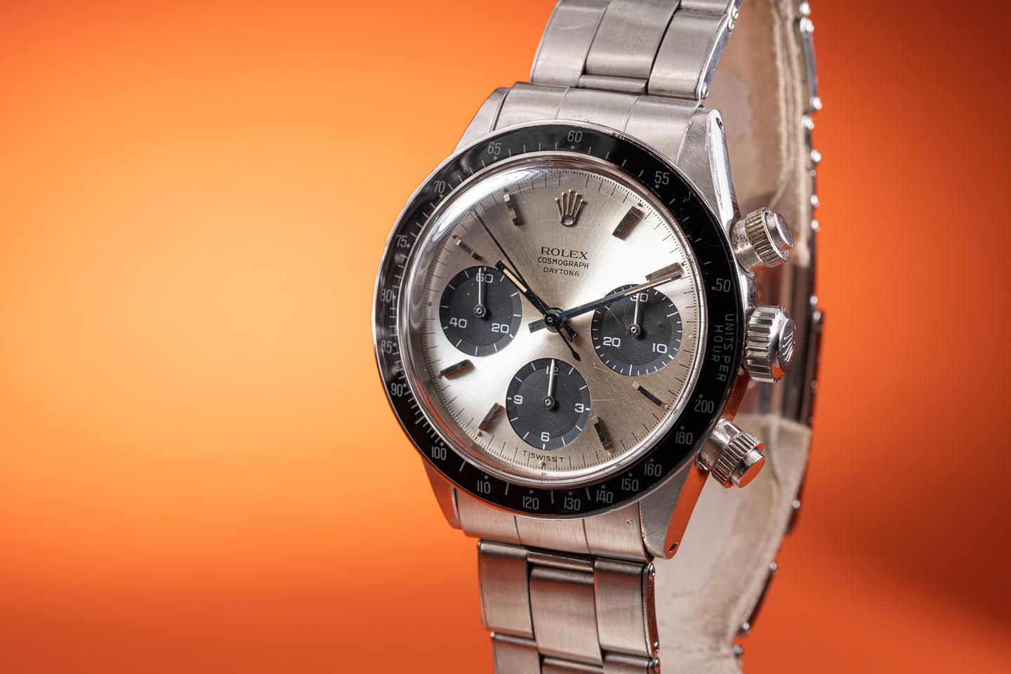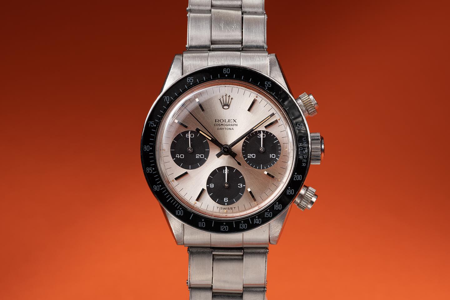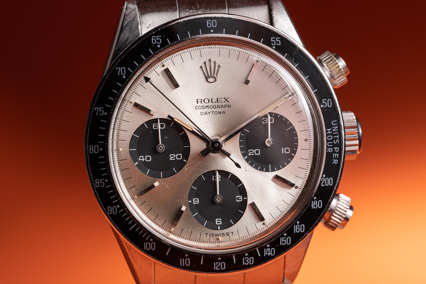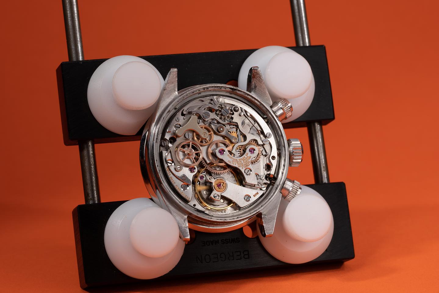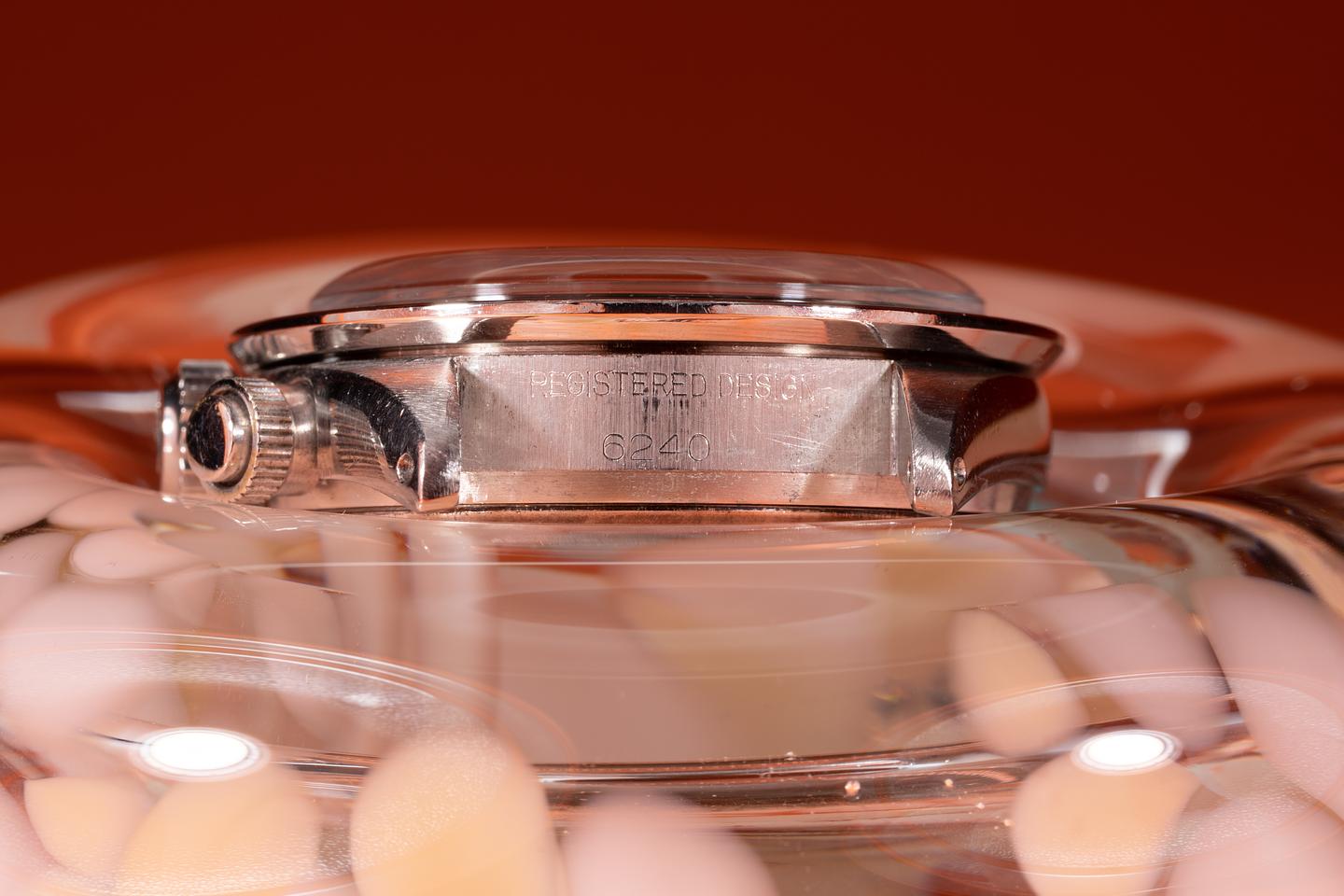 Dial: The "Small Daytona" silver dial is good showing average wear for its age. There are some subtle toolmarks/scratches on the dial between the 11 and 1 o'clock markers and 2 more located between the bottom and right subdials. The lume has aged to a warm creamy hue and the hands match perfectly. The three and 9 o'clock lume plots are missing a portion of their luminous mass. All lume glows brightly when exposed to UV and falls off rapidly at the same rate.