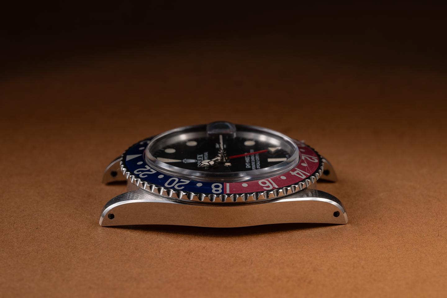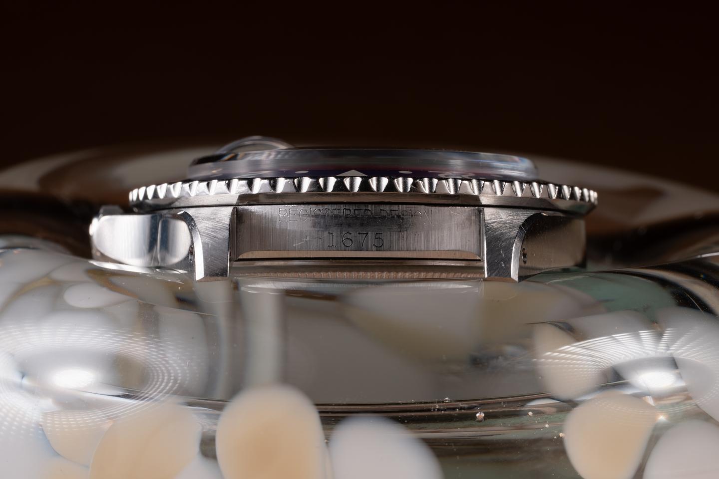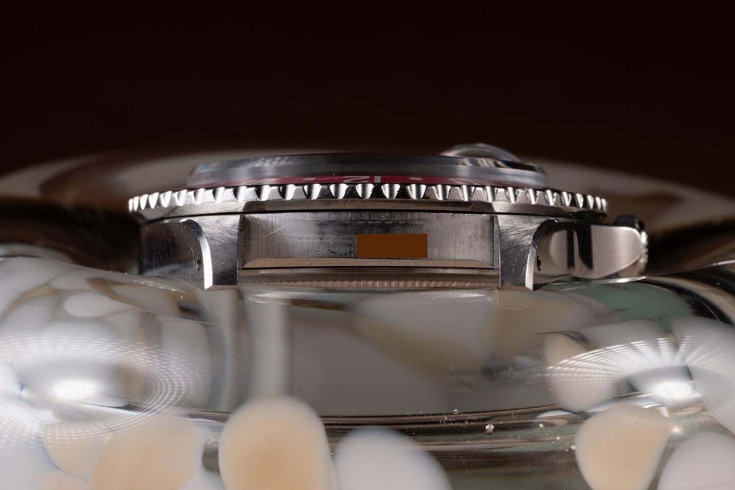 Case: The recently polished case is excellent, showing sharp, prominent bevels and only very light wear from use. The bezel insert is also in excellent condition, showing some light wear and significant fading to the red portion of the insert.