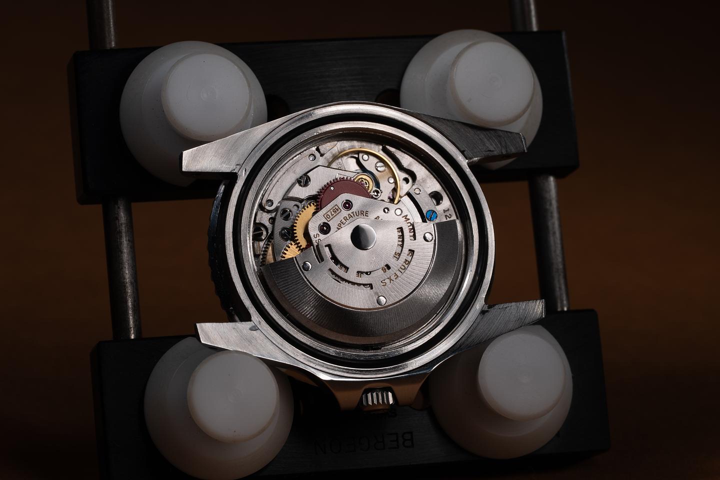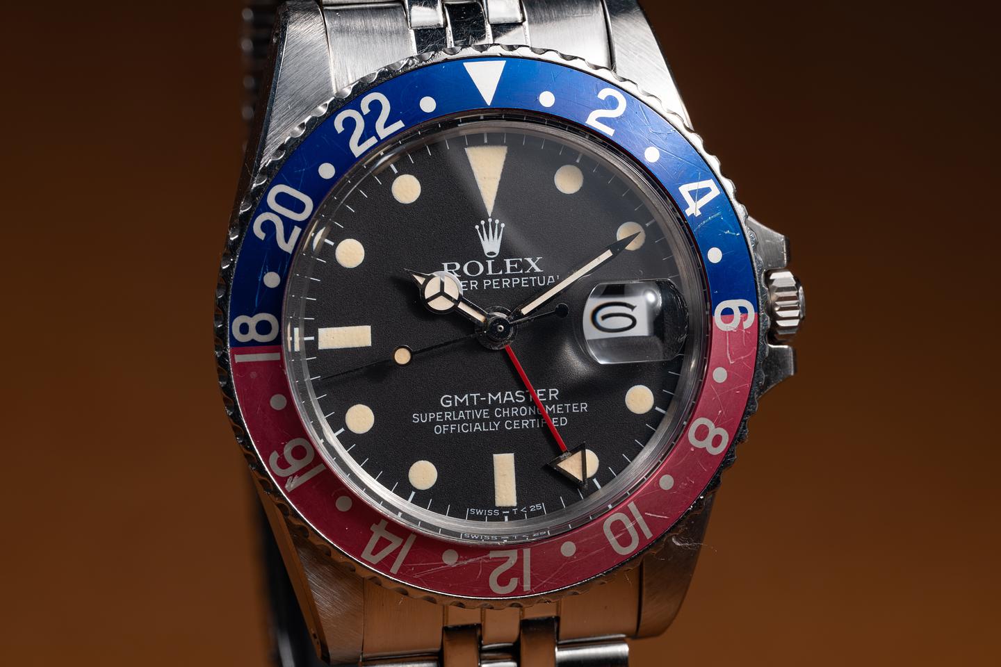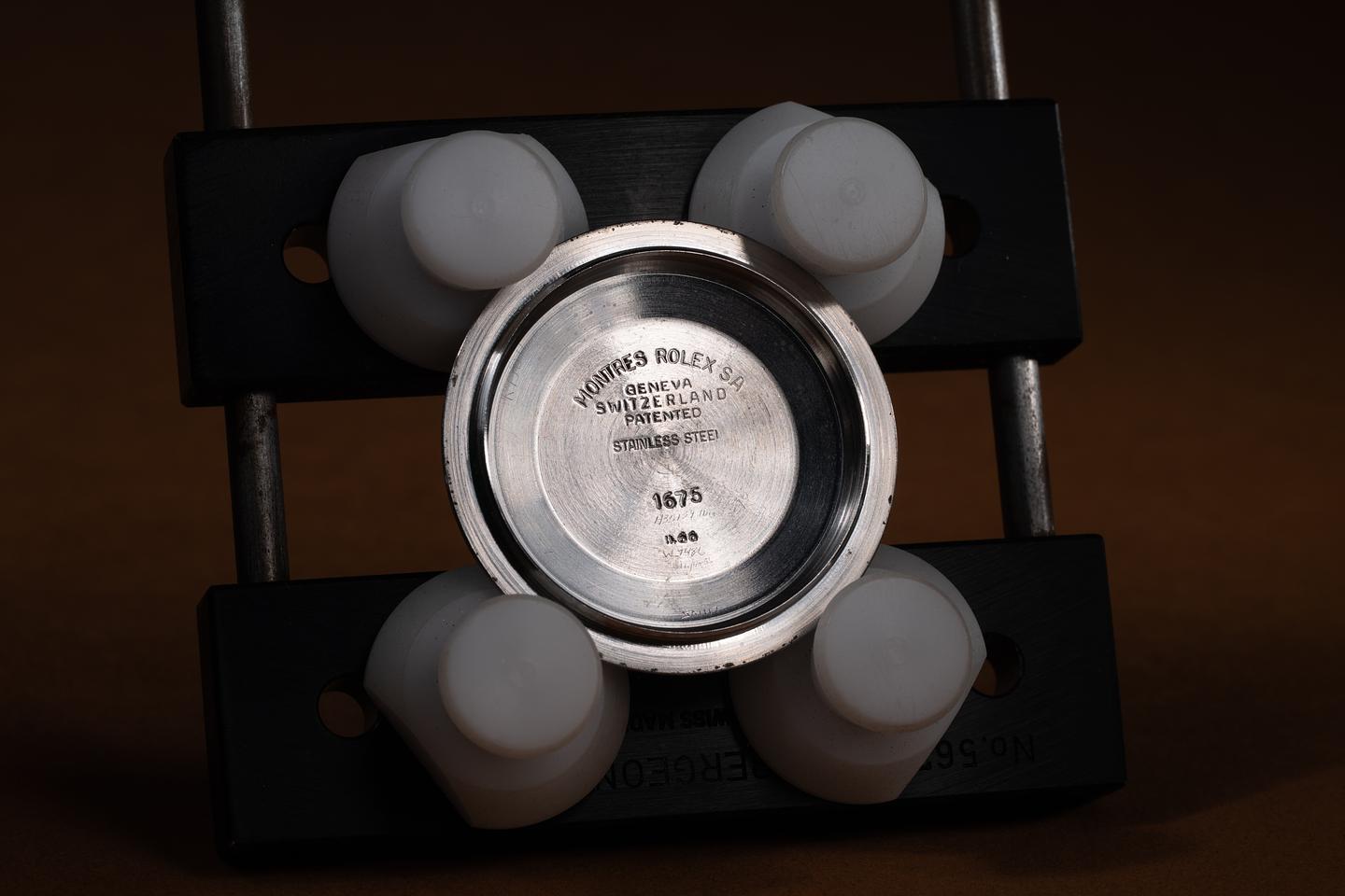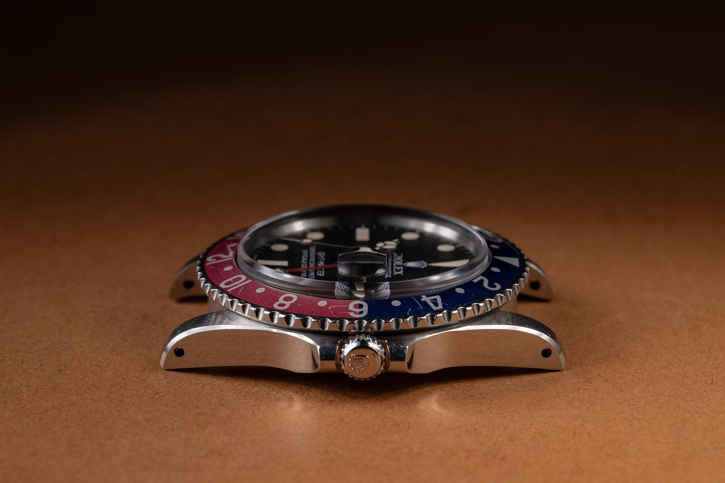 Case: The recently polished case is excellent, showing sharp, prominent bevels and only very light wear from use. The bezel insert is also in excellent condition, showing some light wear and significant fading to the red portion of the insert.