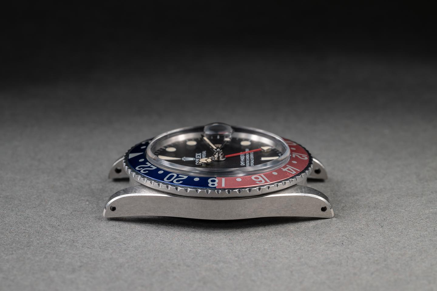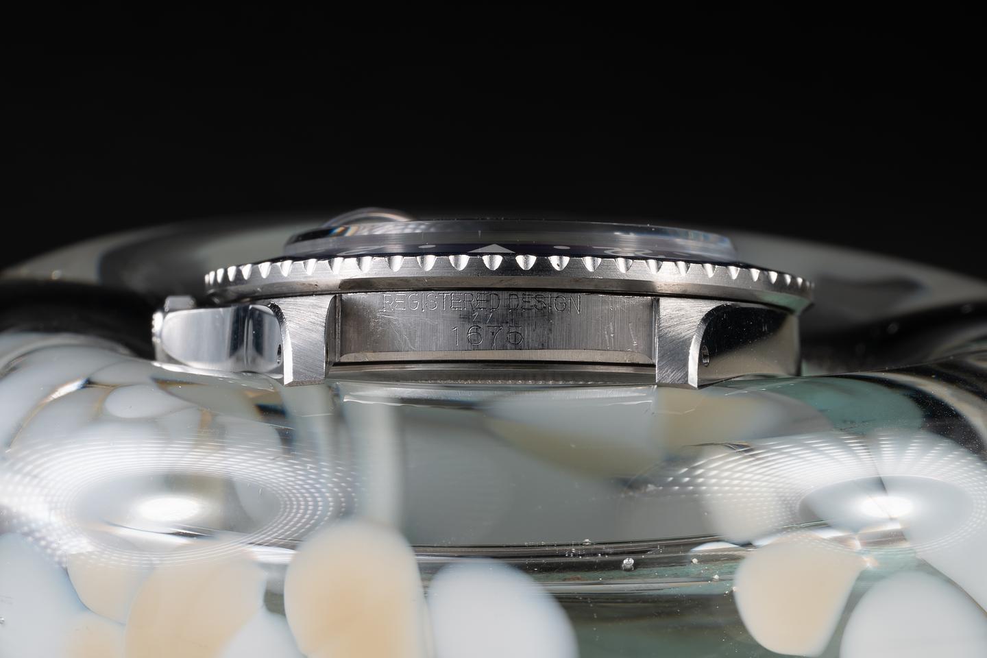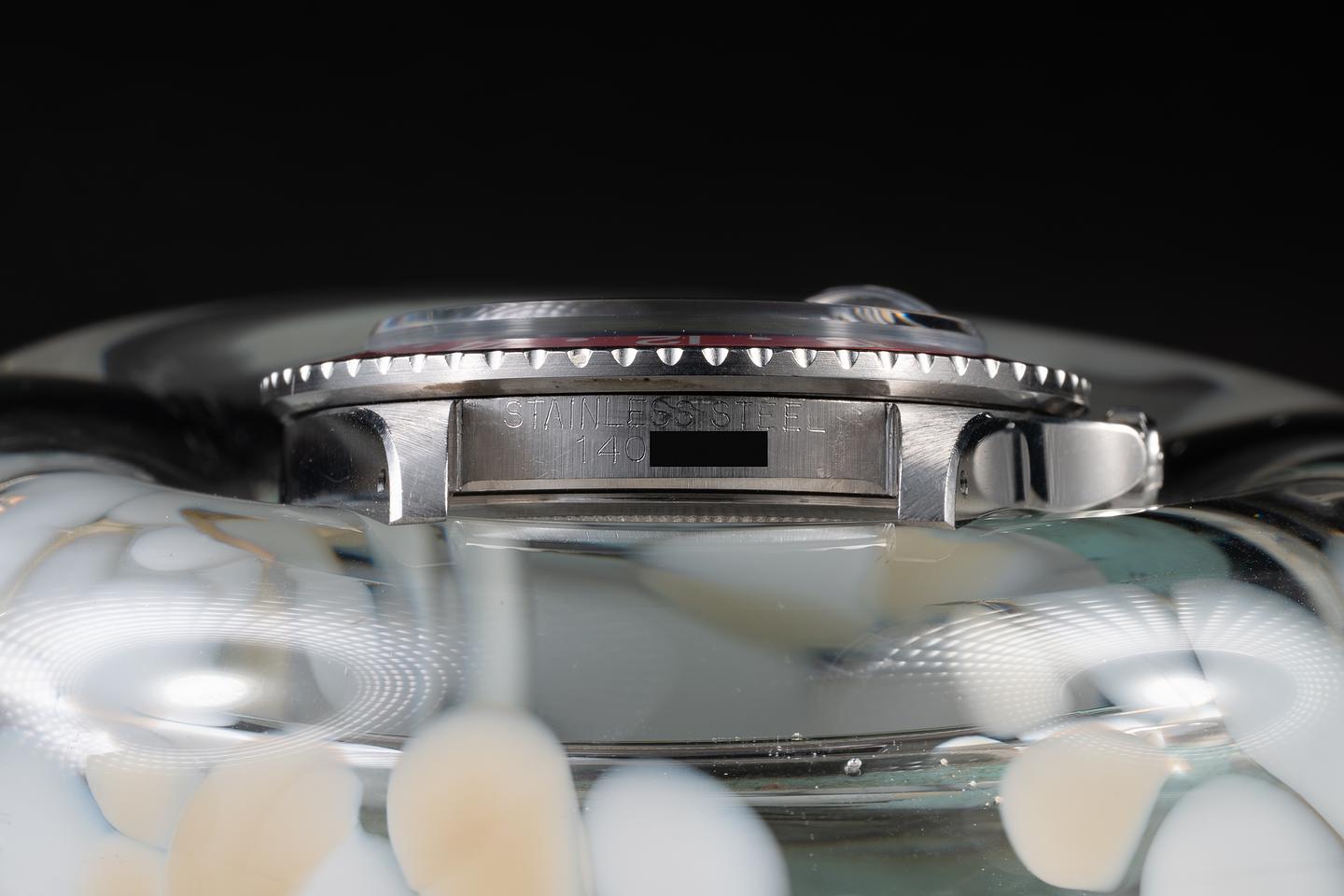 Case: The previously polished case is excellent, showing sharp, prominent bevels and only light wear from use. The bezel insert is also in excellent condition, showing significant fading to the red portion of the insert and only light wear from use.
