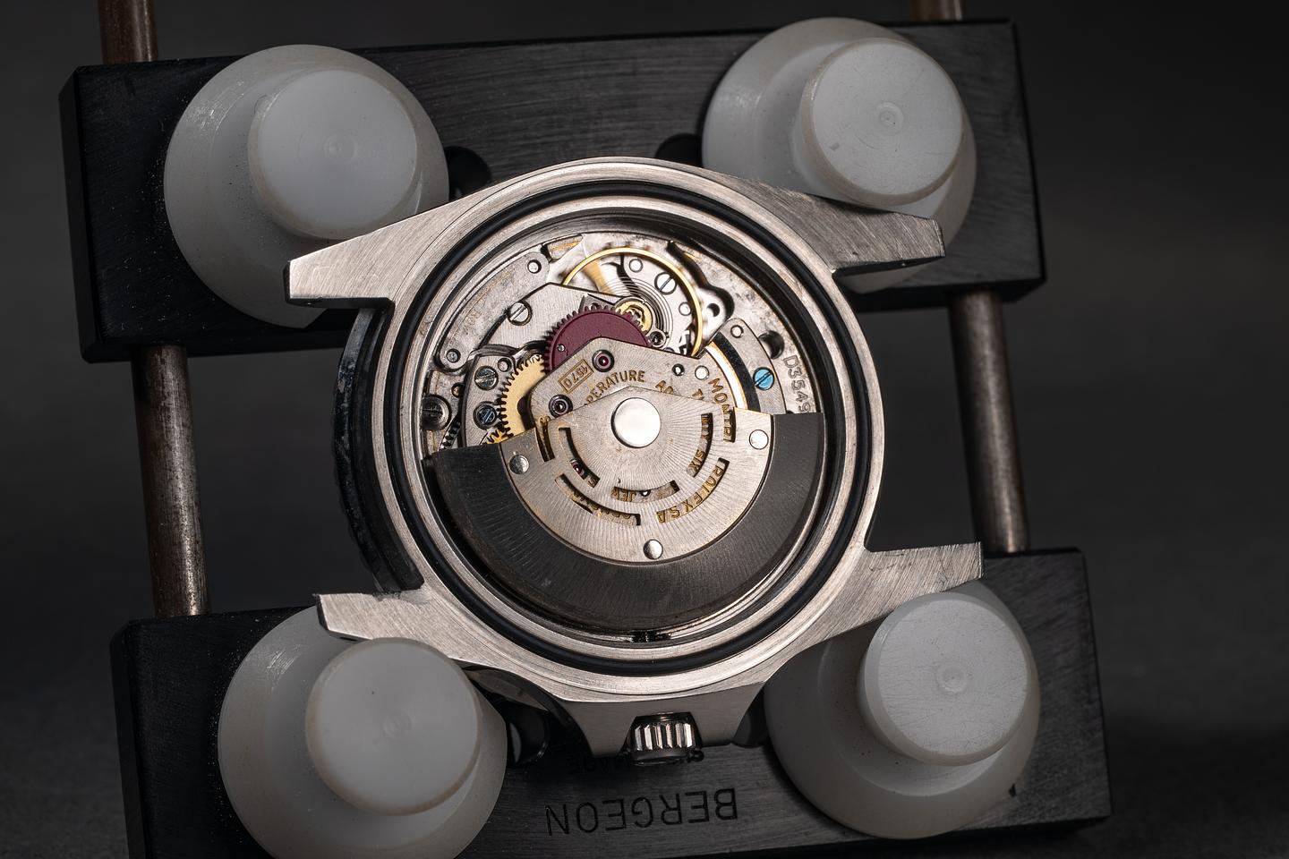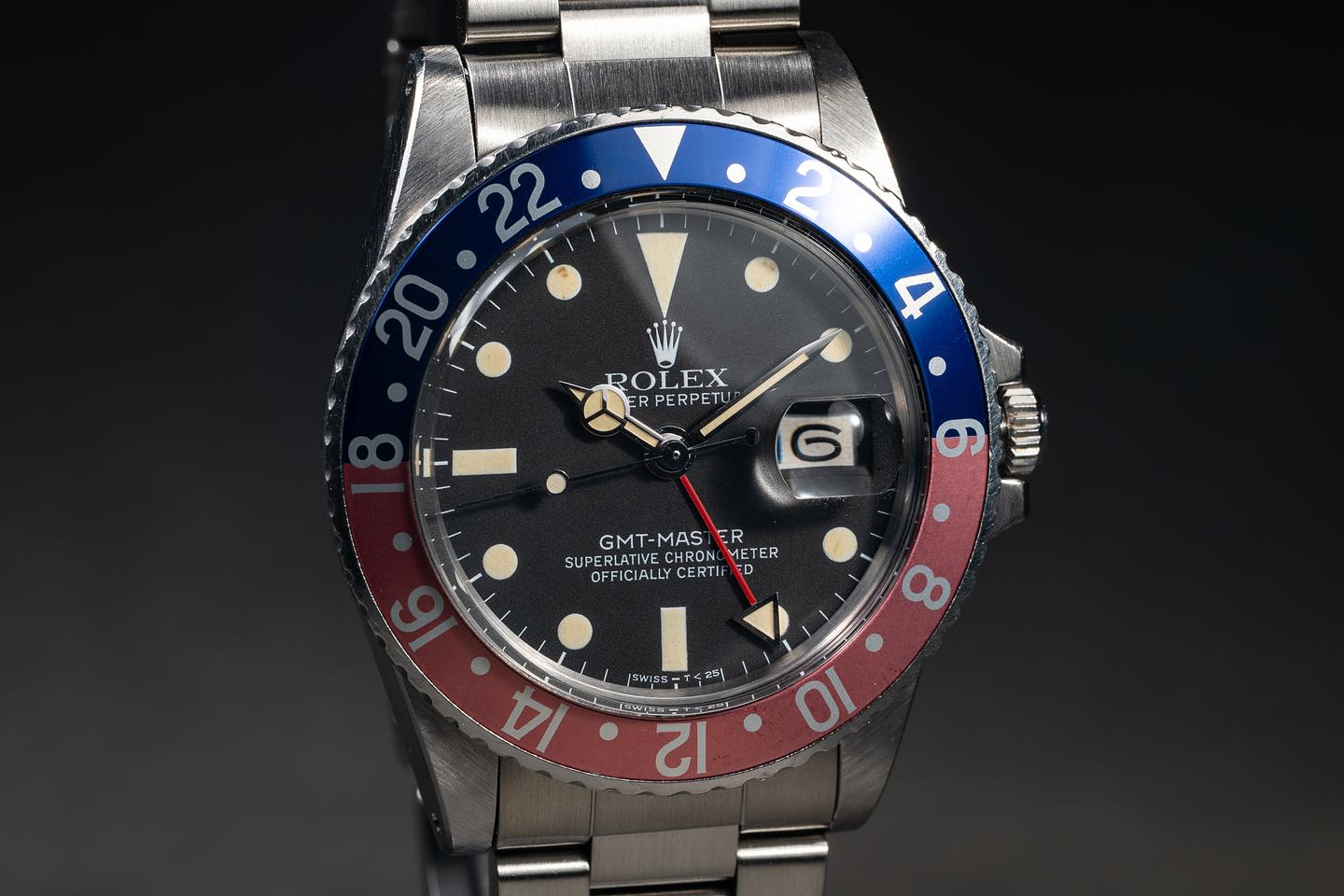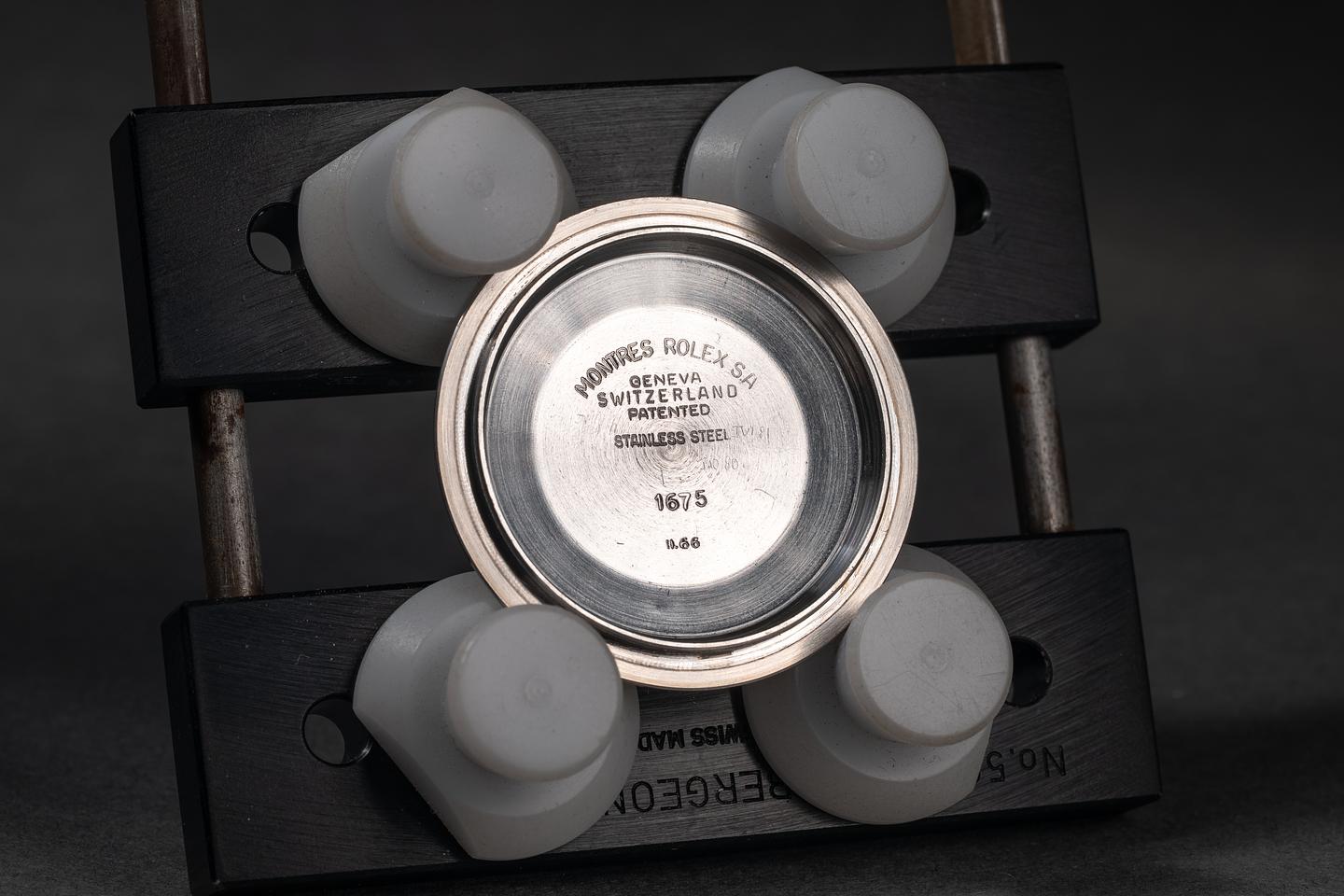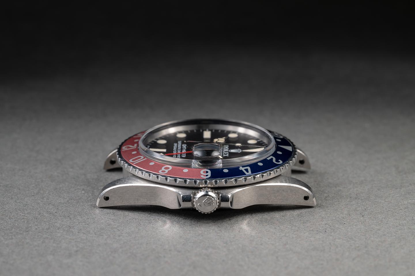 Case: The previously polished case is excellent, showing sharp, prominent bevels and only light wear from use. The bezel insert is also in excellent condition, showing significant fading to the red portion of the insert and only light wear from use.