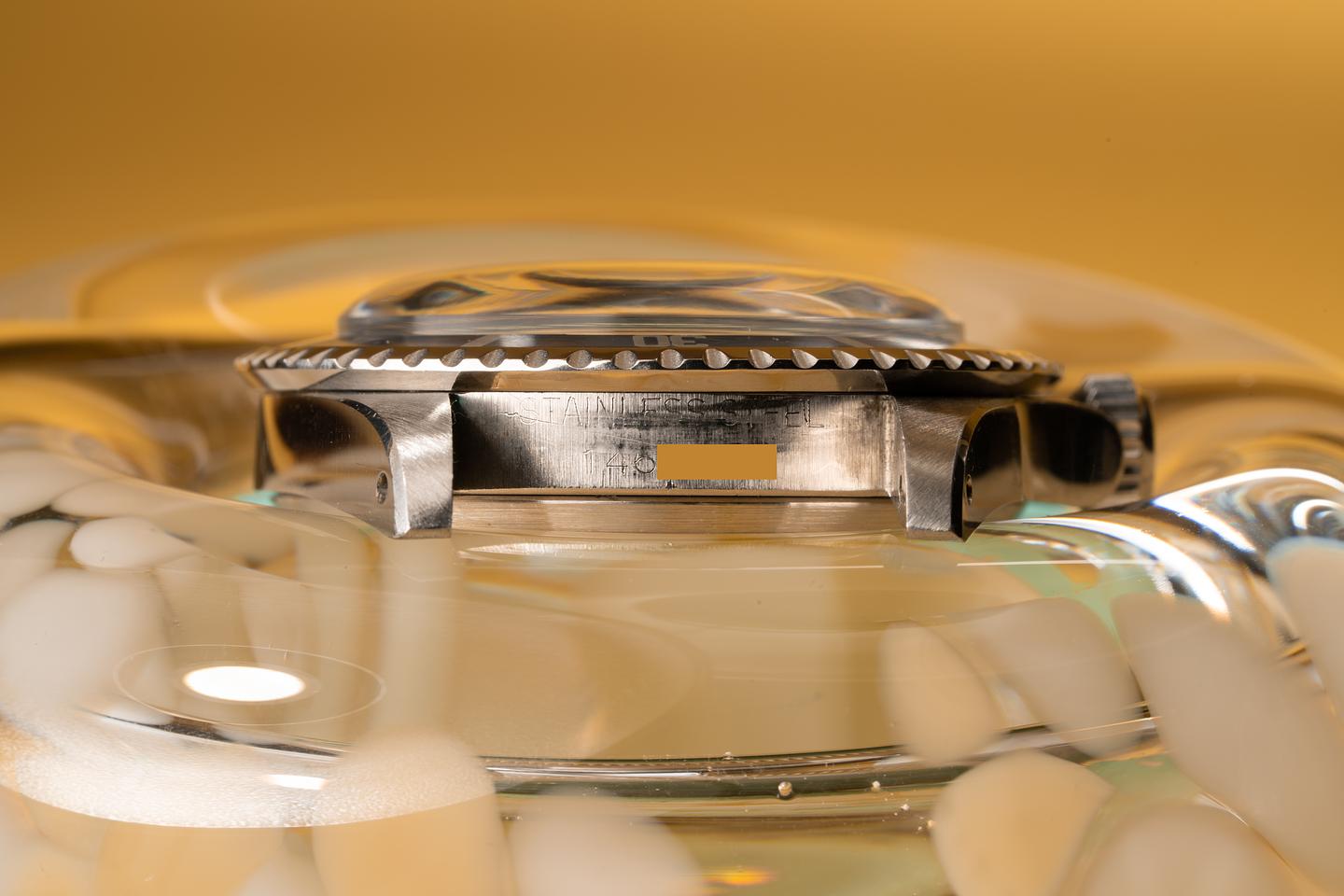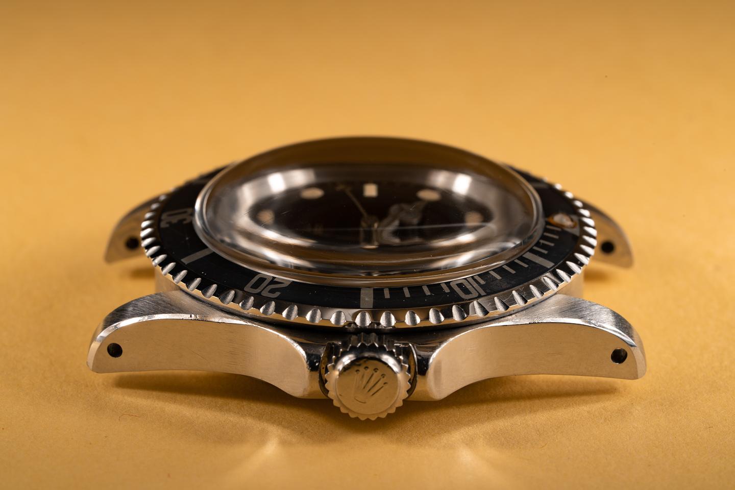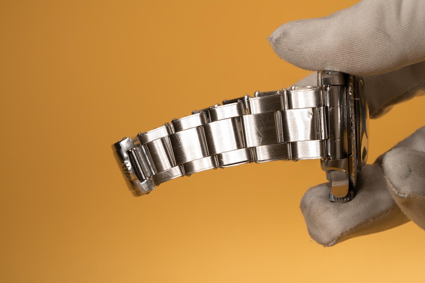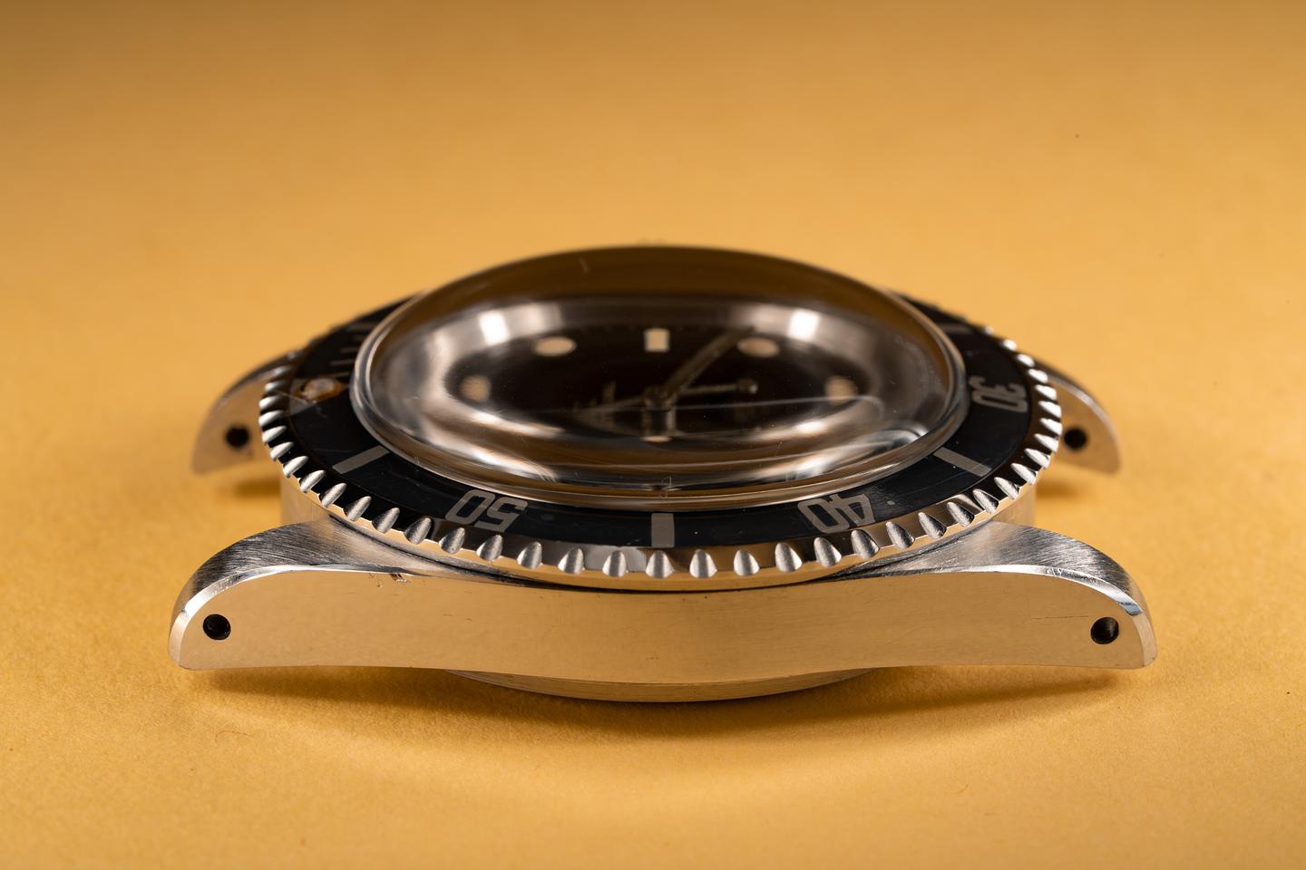 Case: The previously polished case is excellent and features sharp prominent bevels. The case looks to only have been lightly worn since it was polished. The fat font "French" kissing 40 bezel insert is excellent and has faded to a satin blue-grey hue and shows light wear for its age.