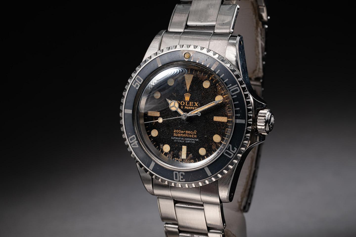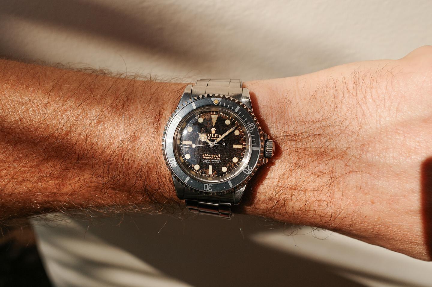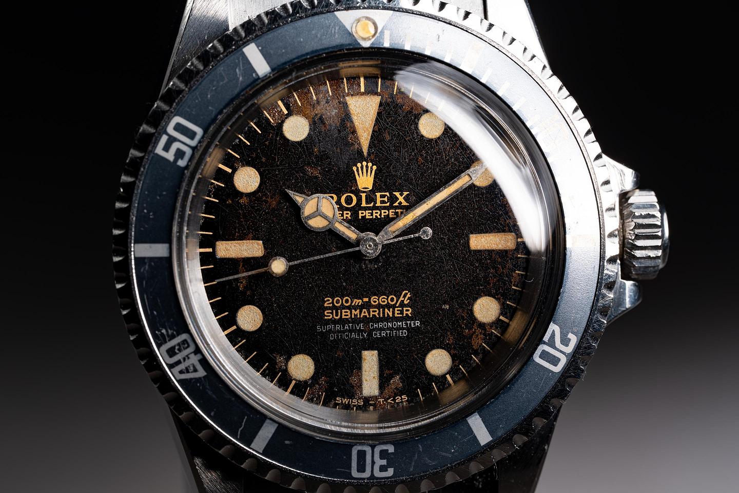 Dial: The gilt dial is showing an extensive and even pattern of spider cracking patina across its surface. On parts of the dial, there are patches of warm brown tones beginning to show through the black lacquer. The lume plots are missing most of their luminous mass with the remaining lume having aged to a warm sandy hue. The hands are also in excellent condition and match the lume on the dial. All lume glows brightly when exposed to UV and falls off rapidly at the same rate.