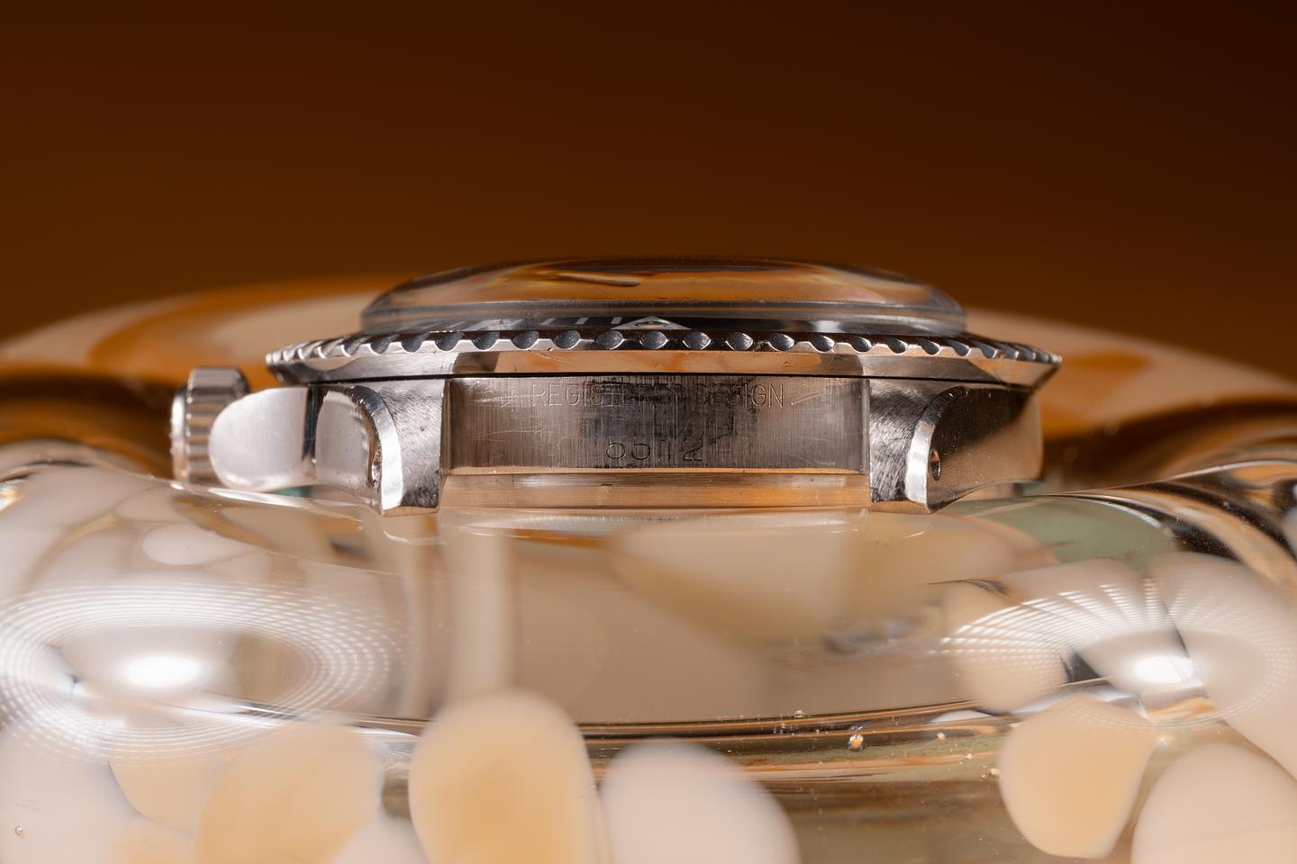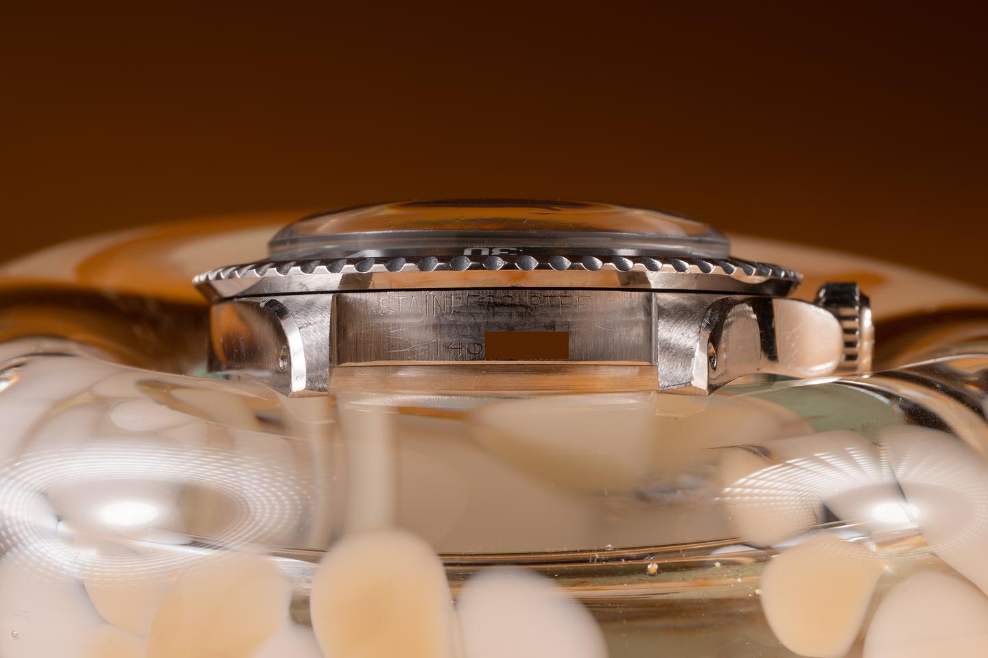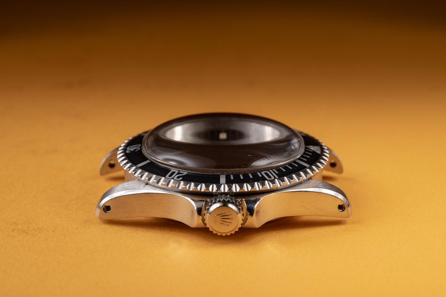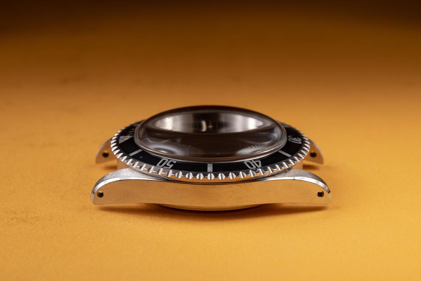Case: The previously polished case is excellent, showing wide, sharp, prominent bevels and only very light wear from use. The bezel insert is also in excellent condition and has aged to a dark navy blue hue, showing only very light wear from use.