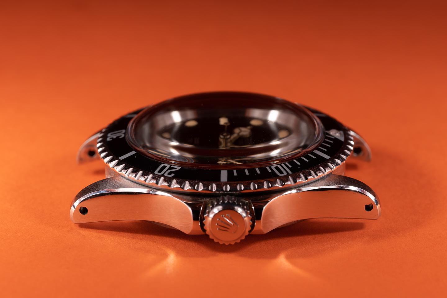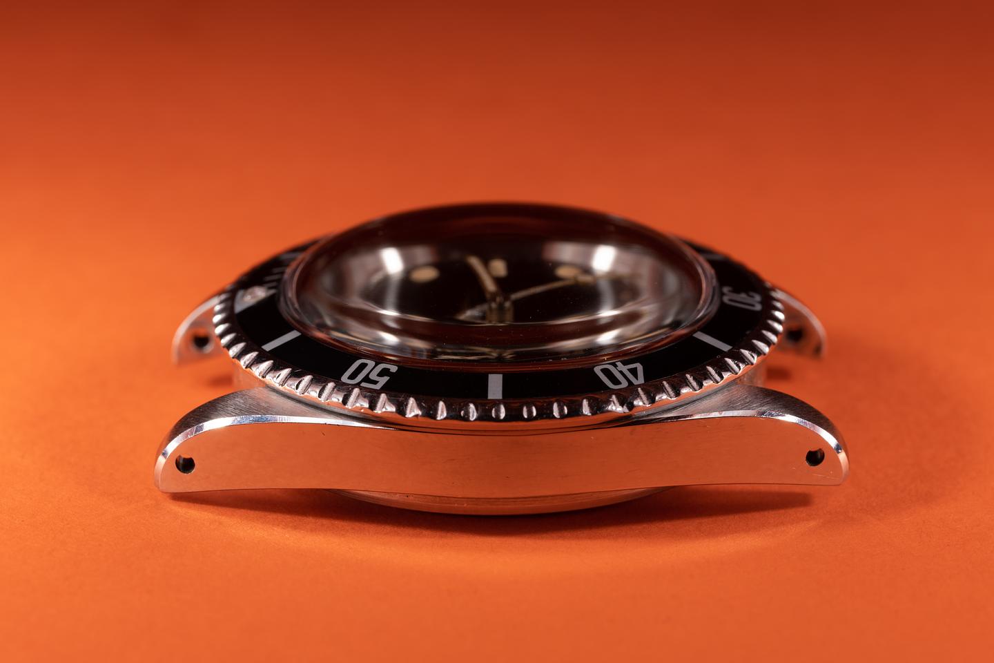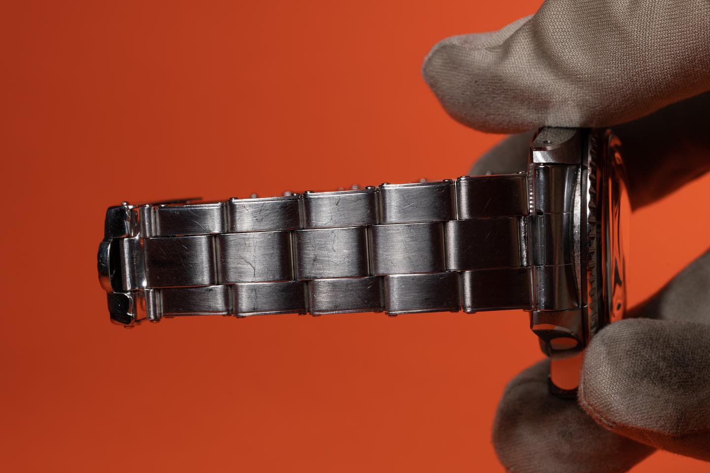 Case: The previously polished case is excellent showing wide, sharp, prominent bevels and only light wear from use. The black bezel insert is also in excellent condition showing only light wear from use.