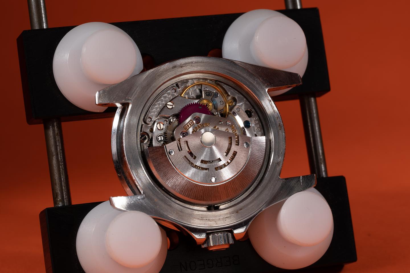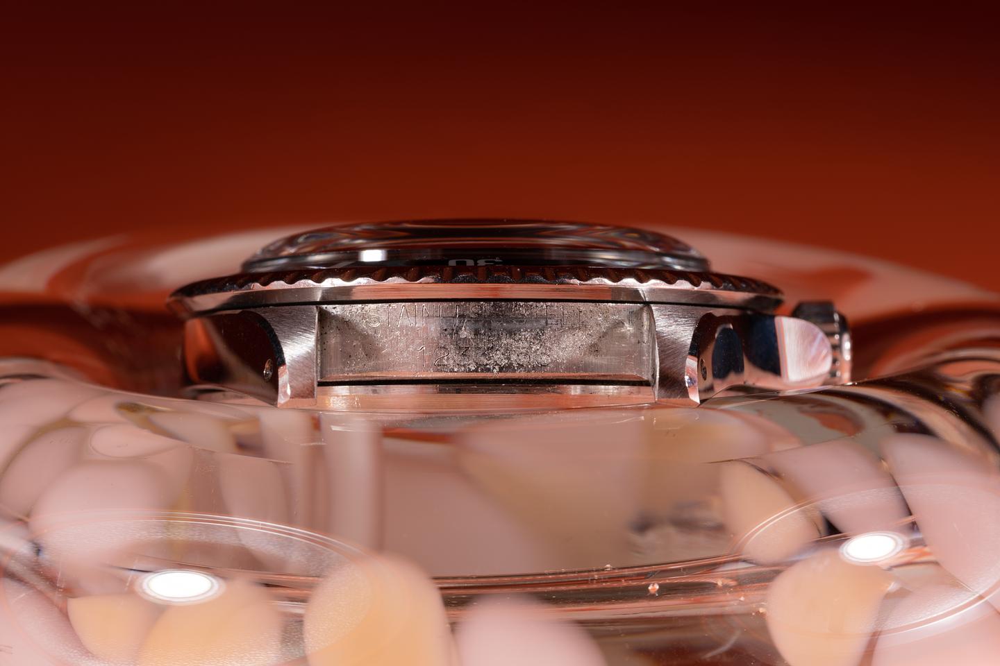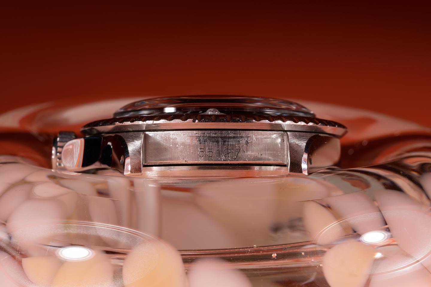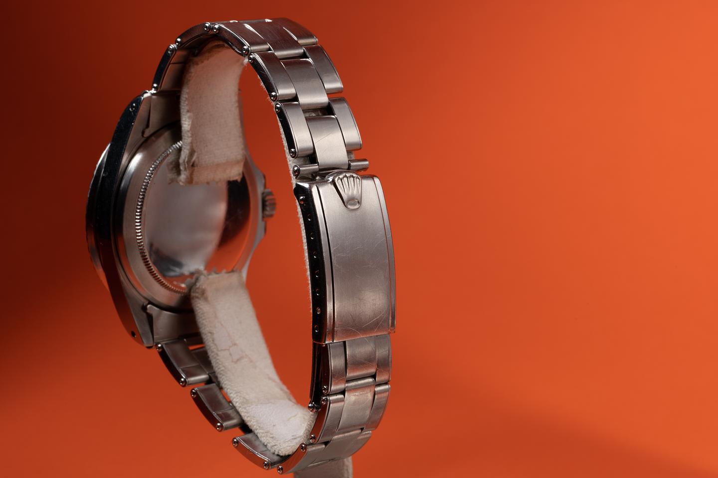 Case: The previously polished case is excellent showing wide, sharp, prominent bevels and only light wear from use. The black bezel insert is also in excellent condition showing only light wear from use.